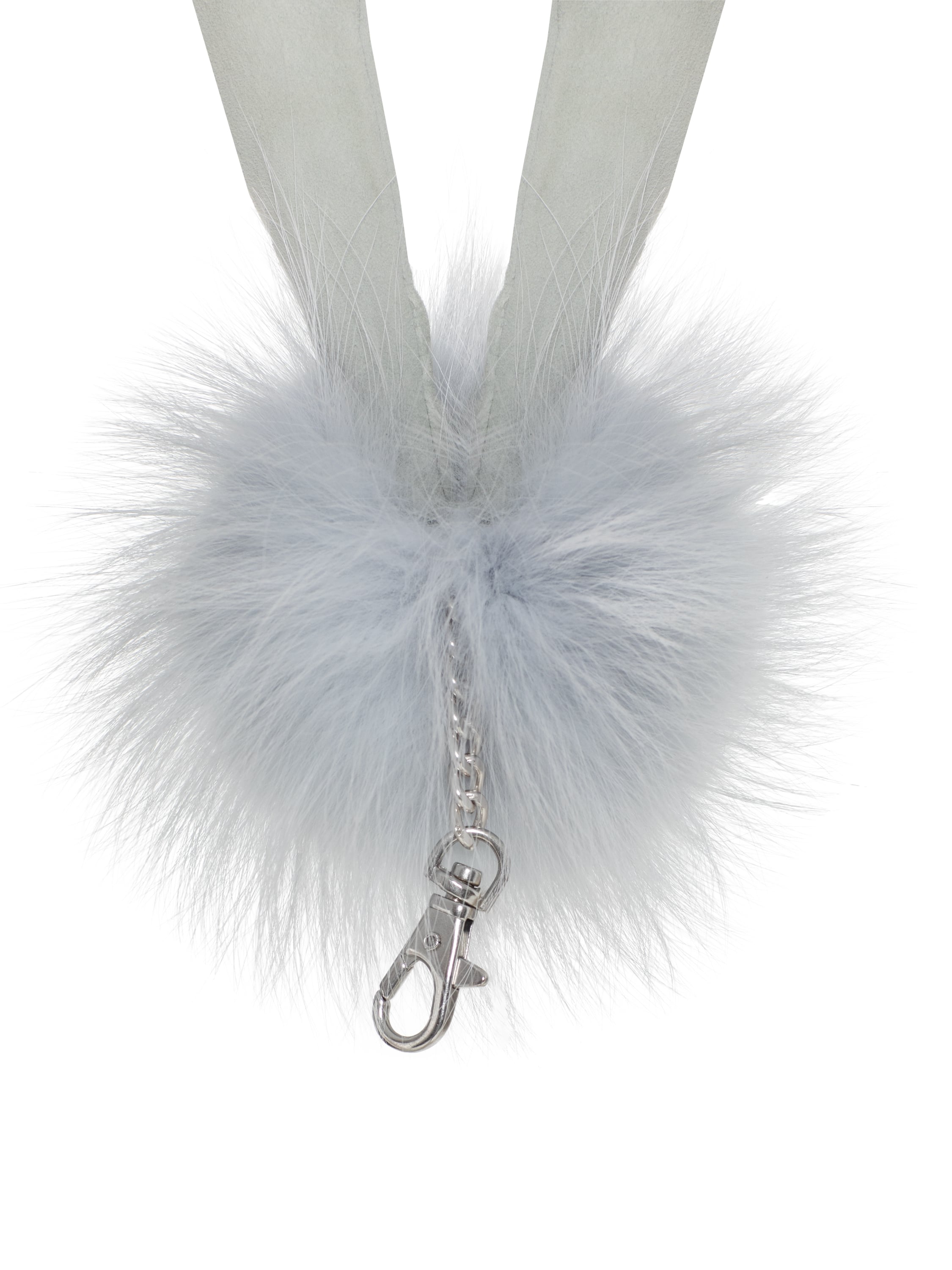 The gray bunny-shaped keychain with a metal carabiner is made of suede and complemented with bleached fox fur.