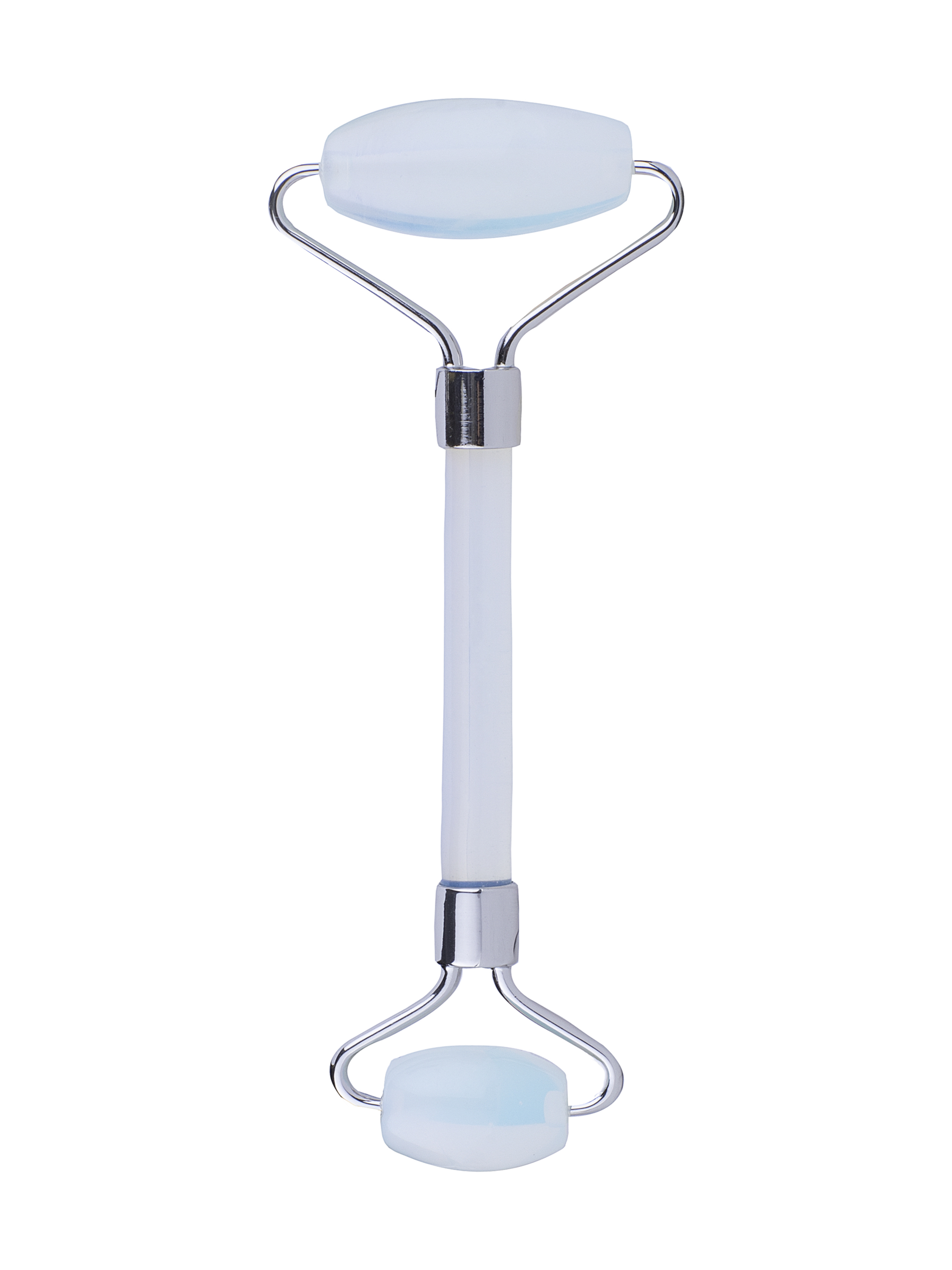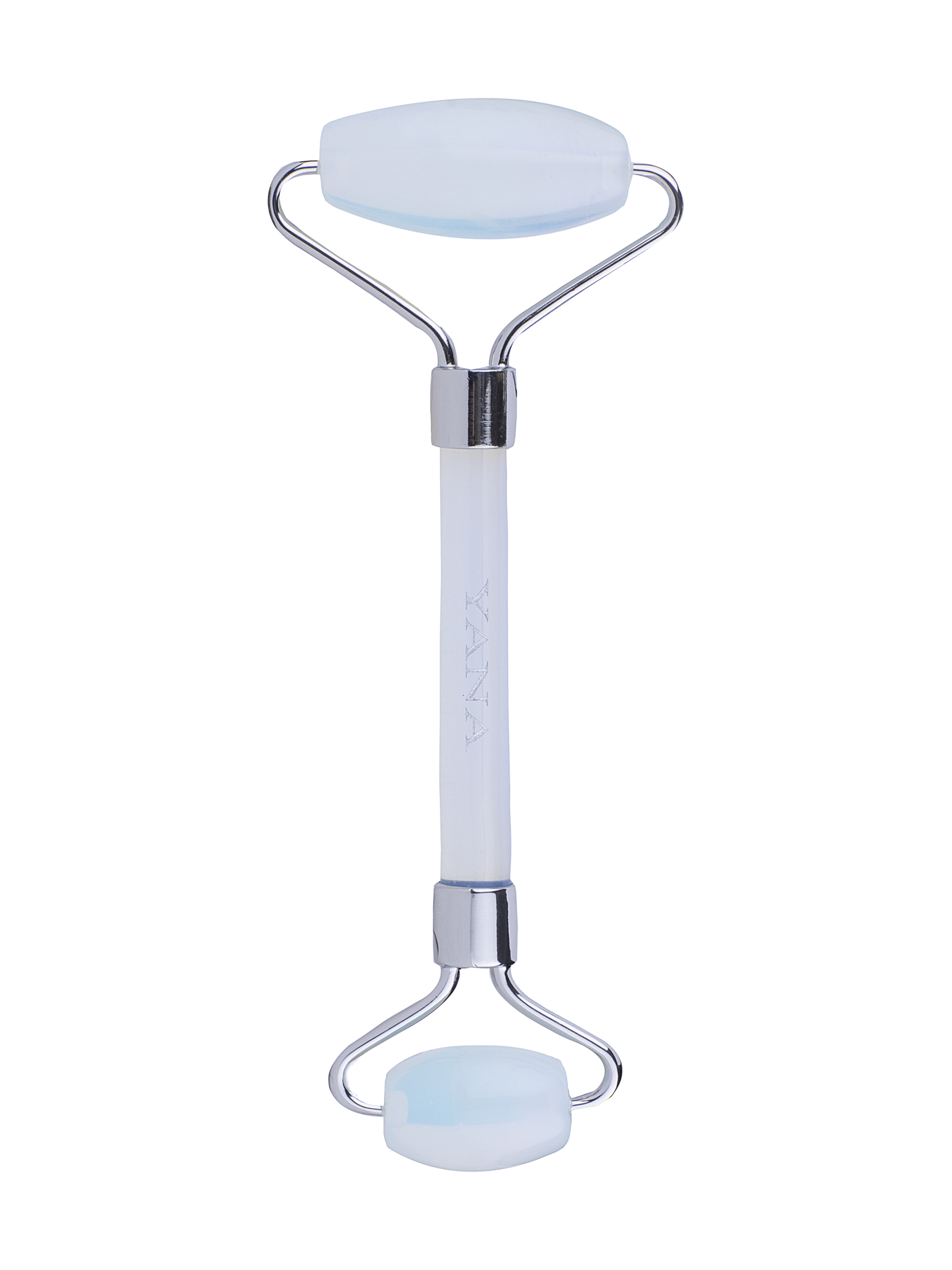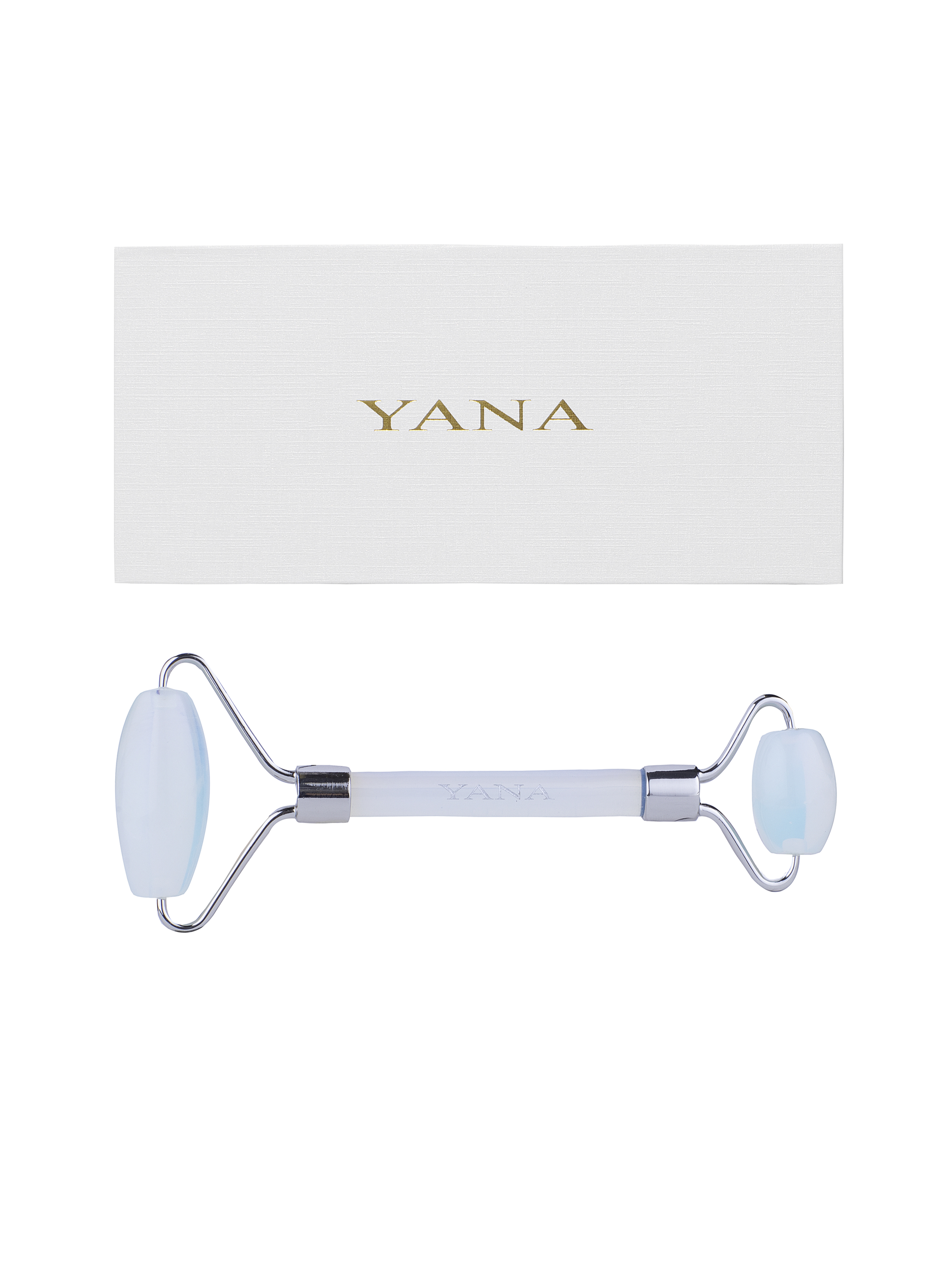 The massage roller is made of smoky blue quartz and decorated with the Yana logo on the handle.