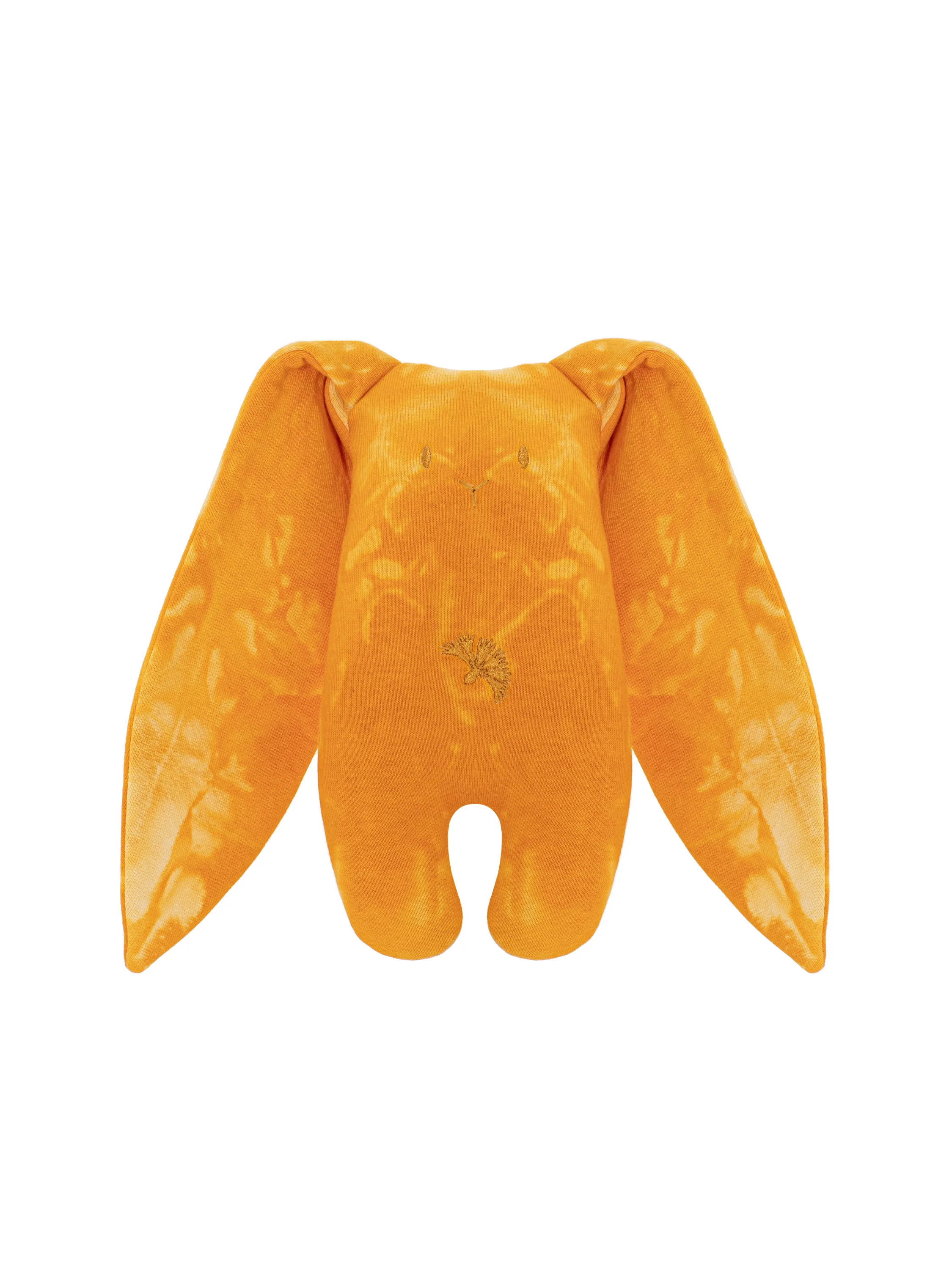 Soft toy in the shape of a rabbit with orange embroidery on the front. Made of orange cotton dyed in a tie-dye technique.