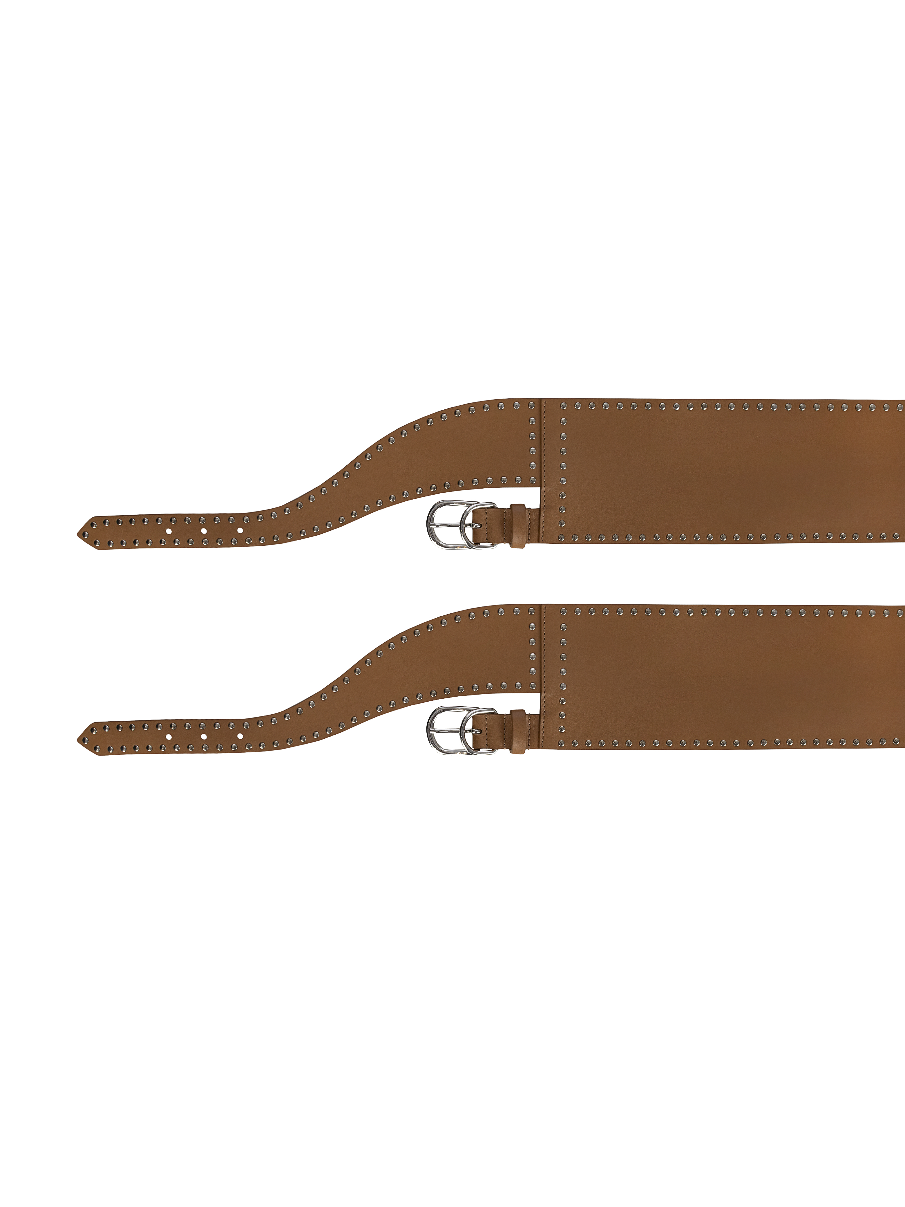 The wide brown belt is made of genuine leather. The belt is embellished with studs and two buckles. XS — 65 cm, S — 70 cm, M — 75 cm, L — 80 cm.