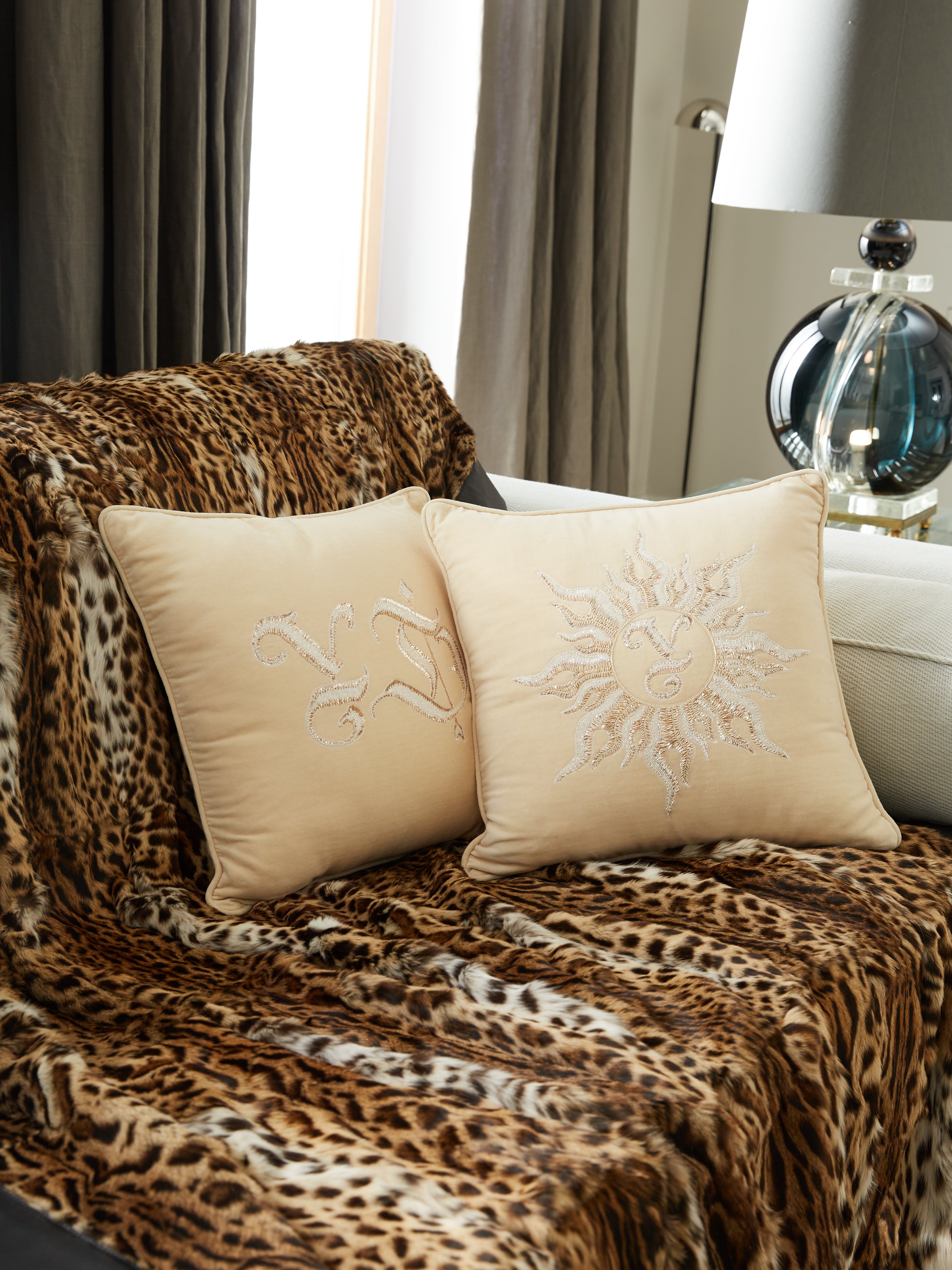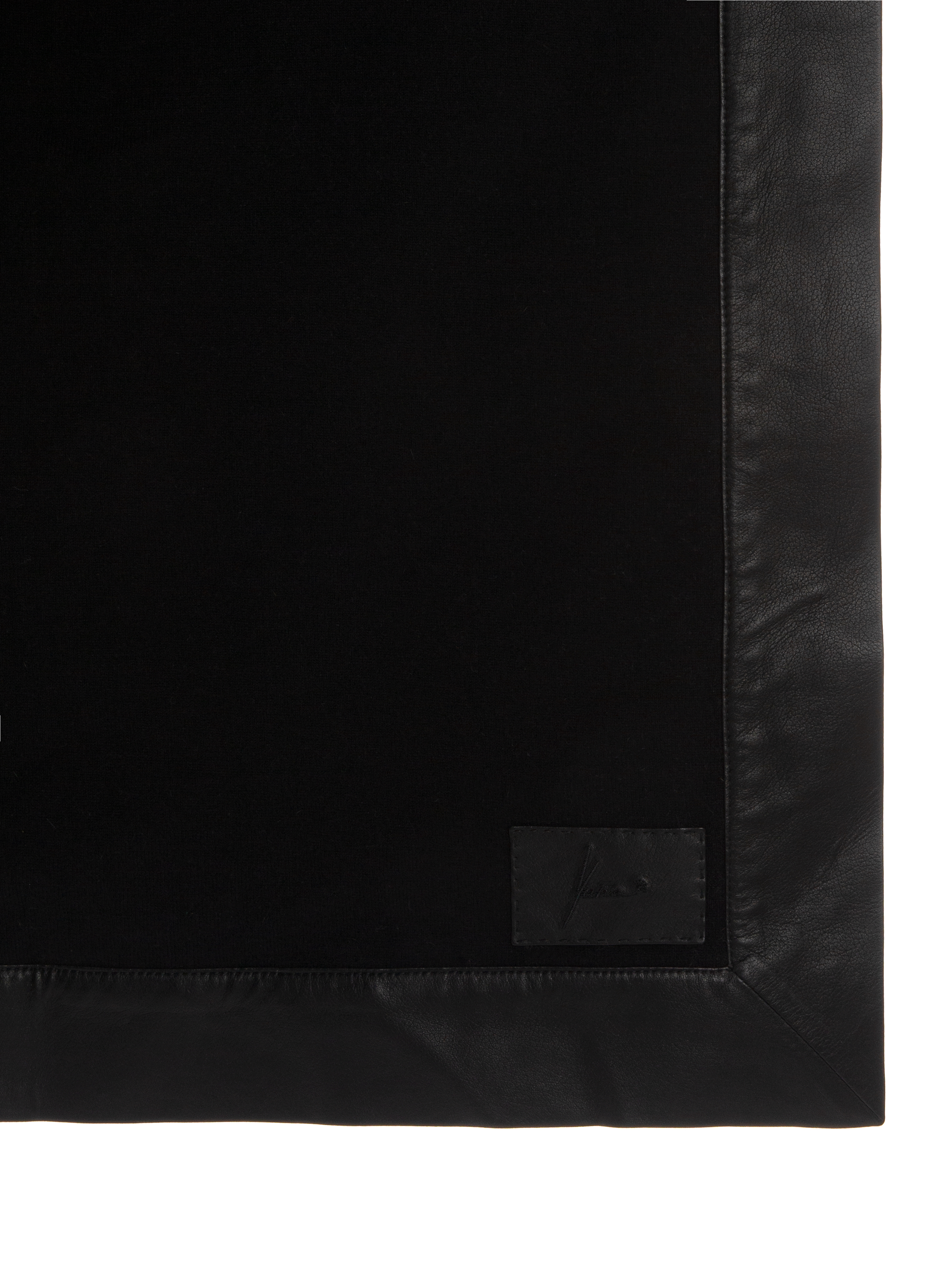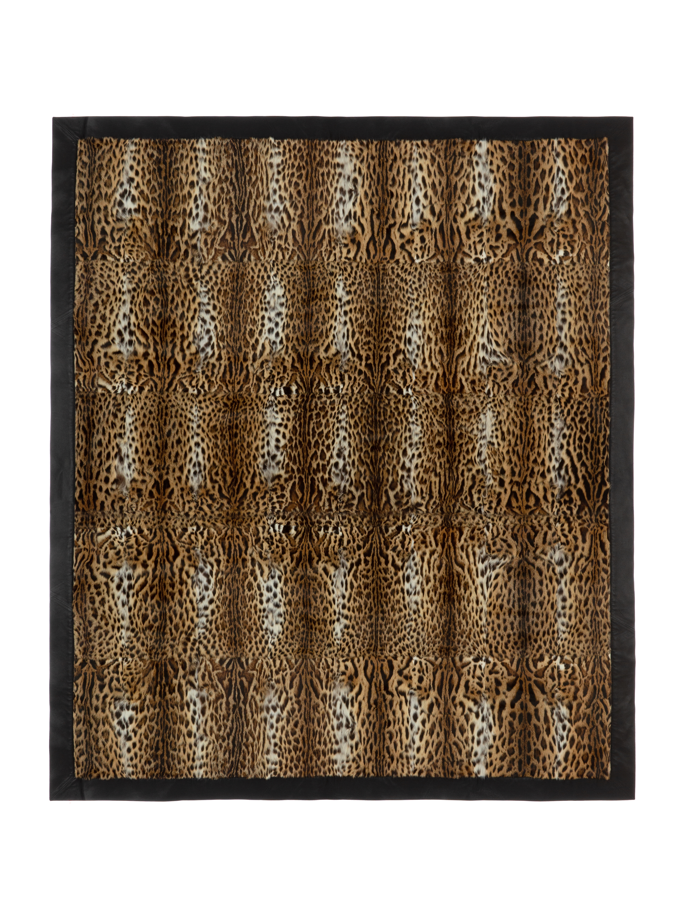 The brown throw is made of wild cat fur and complemented by black genuine leather trim and a matching cashmere lining. Leather brand logo patch at the back. Throw size – 180 x 240 cm.