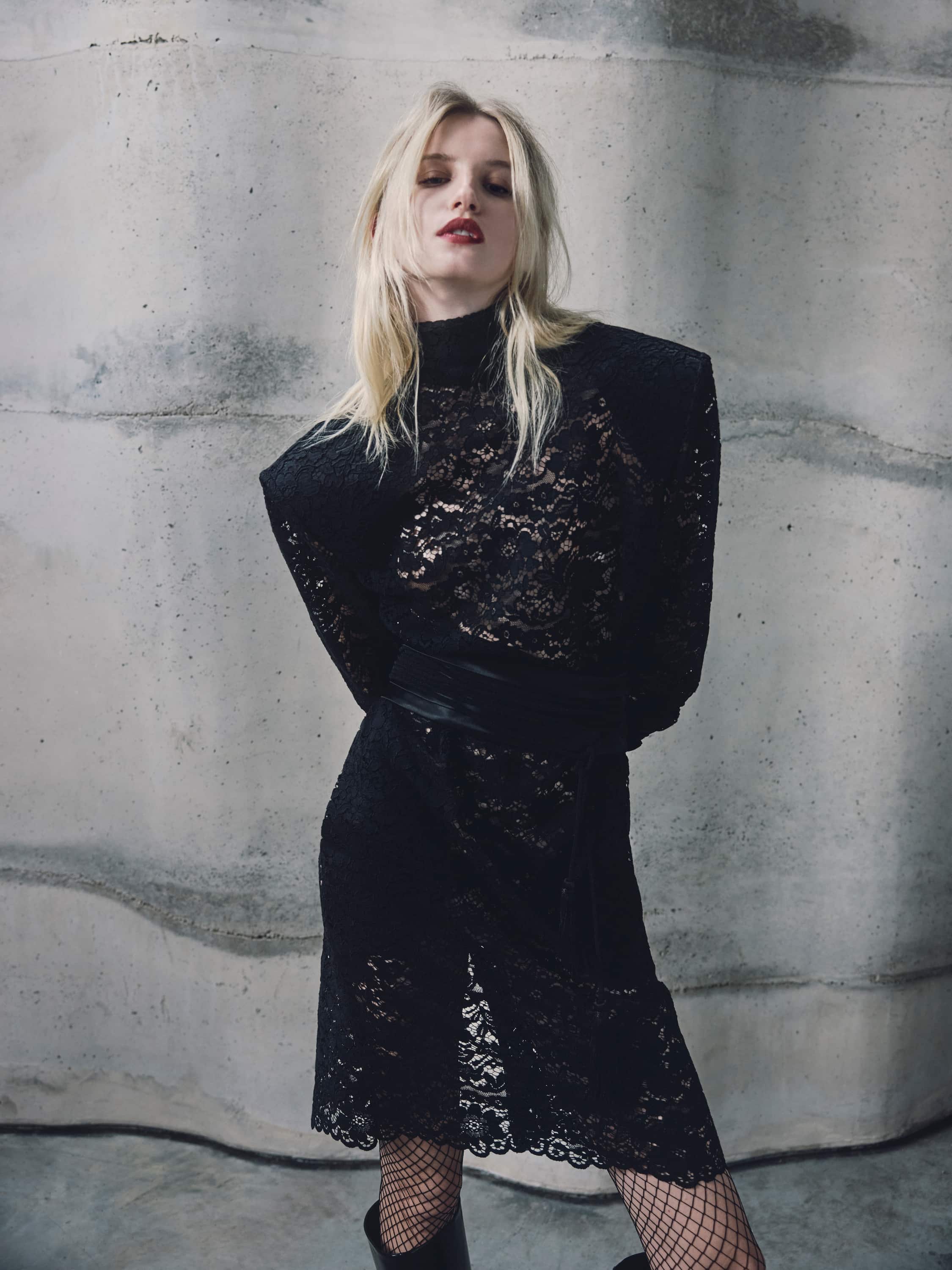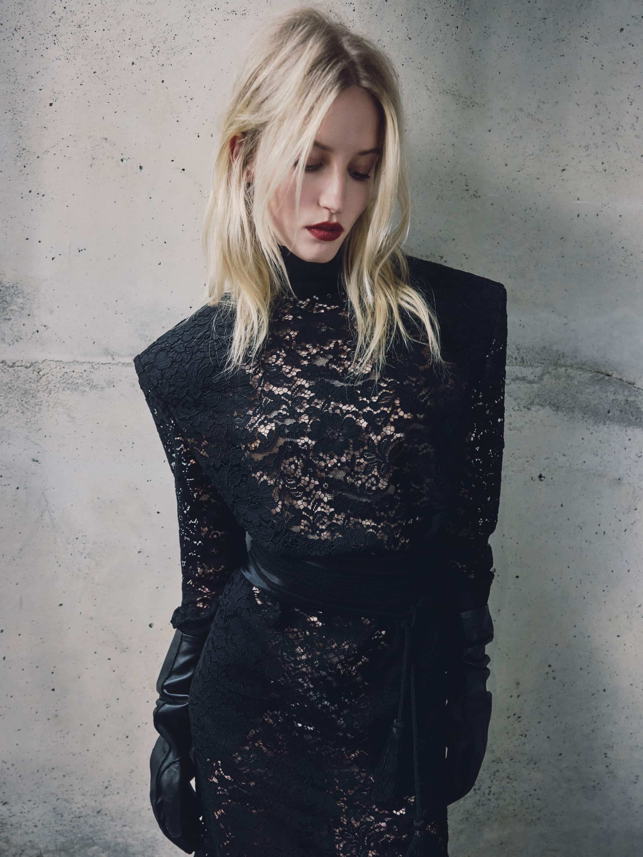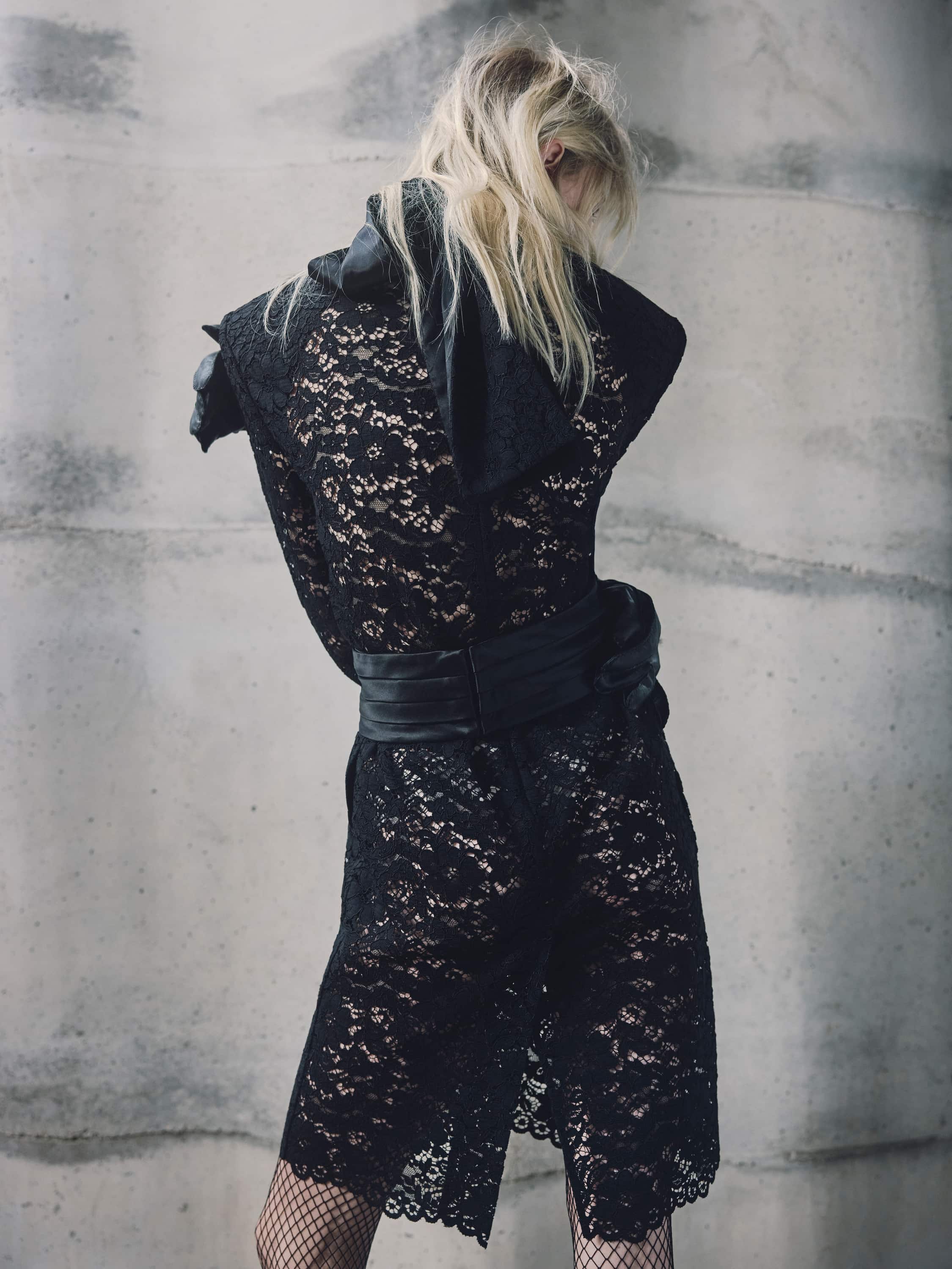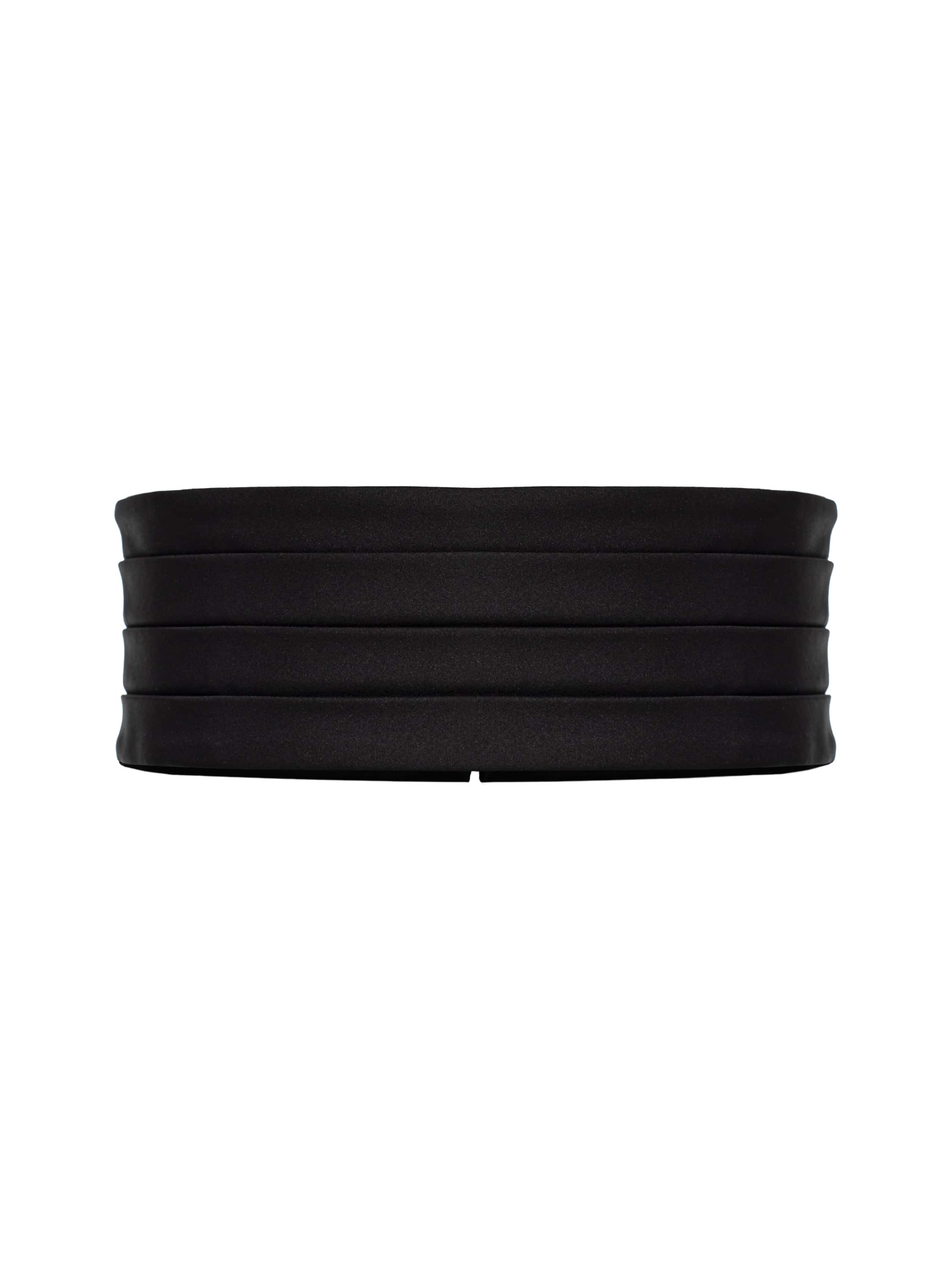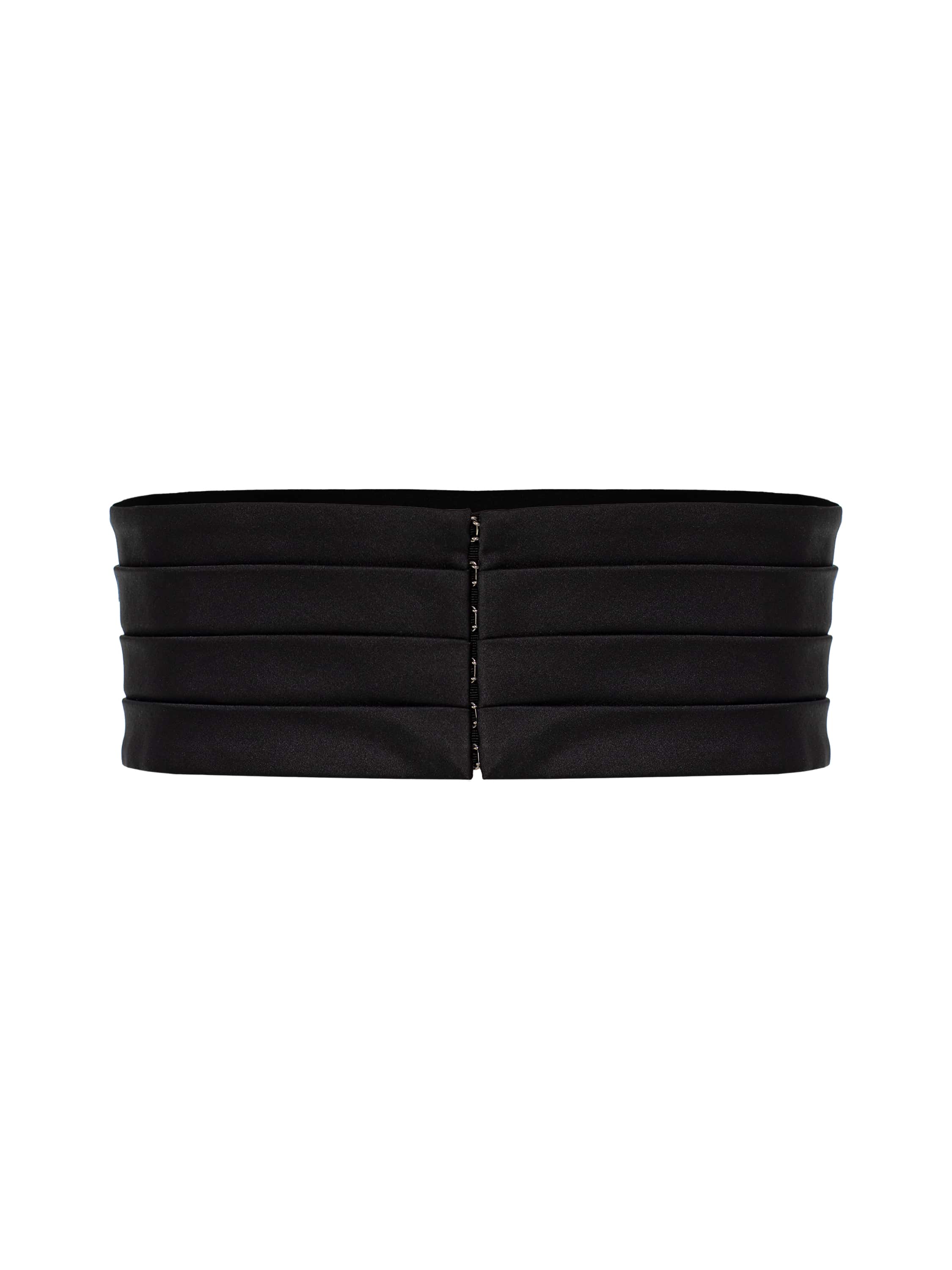 The wide waist belt is made of black satin fabric. The design fastens at the back with hooks.