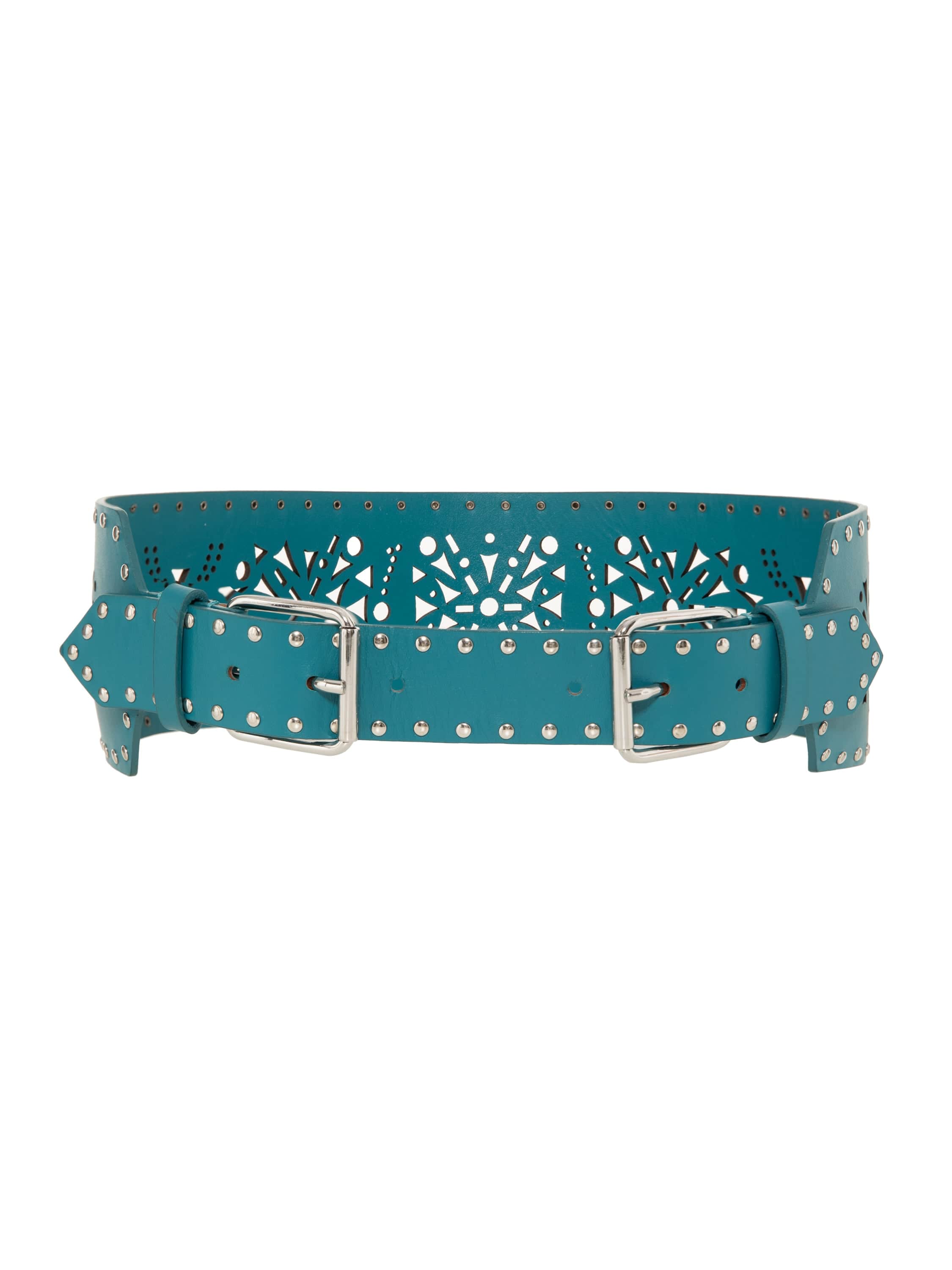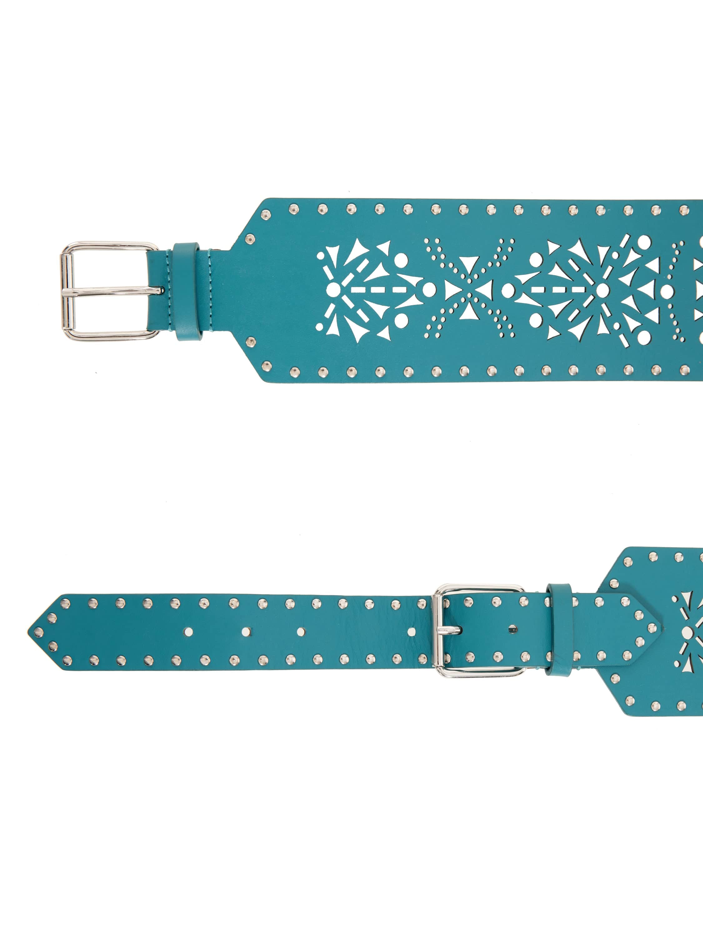 The wide belt with a perforated pattern is made of genuine leather. The turquoise color will add a bright accent to your look.