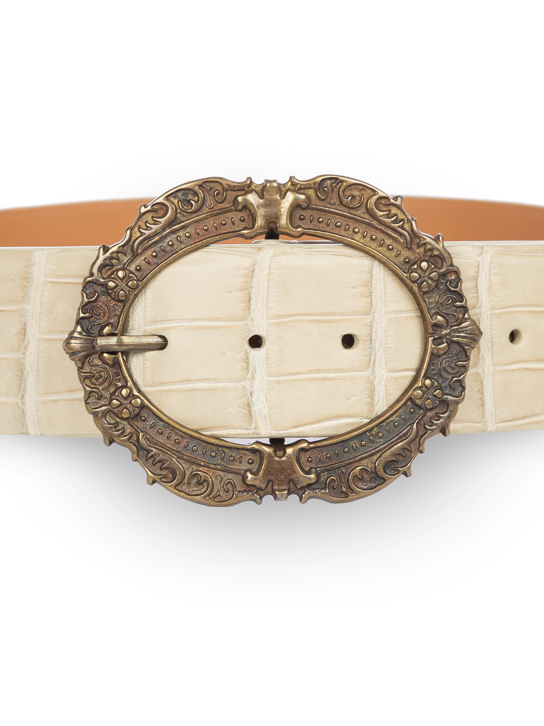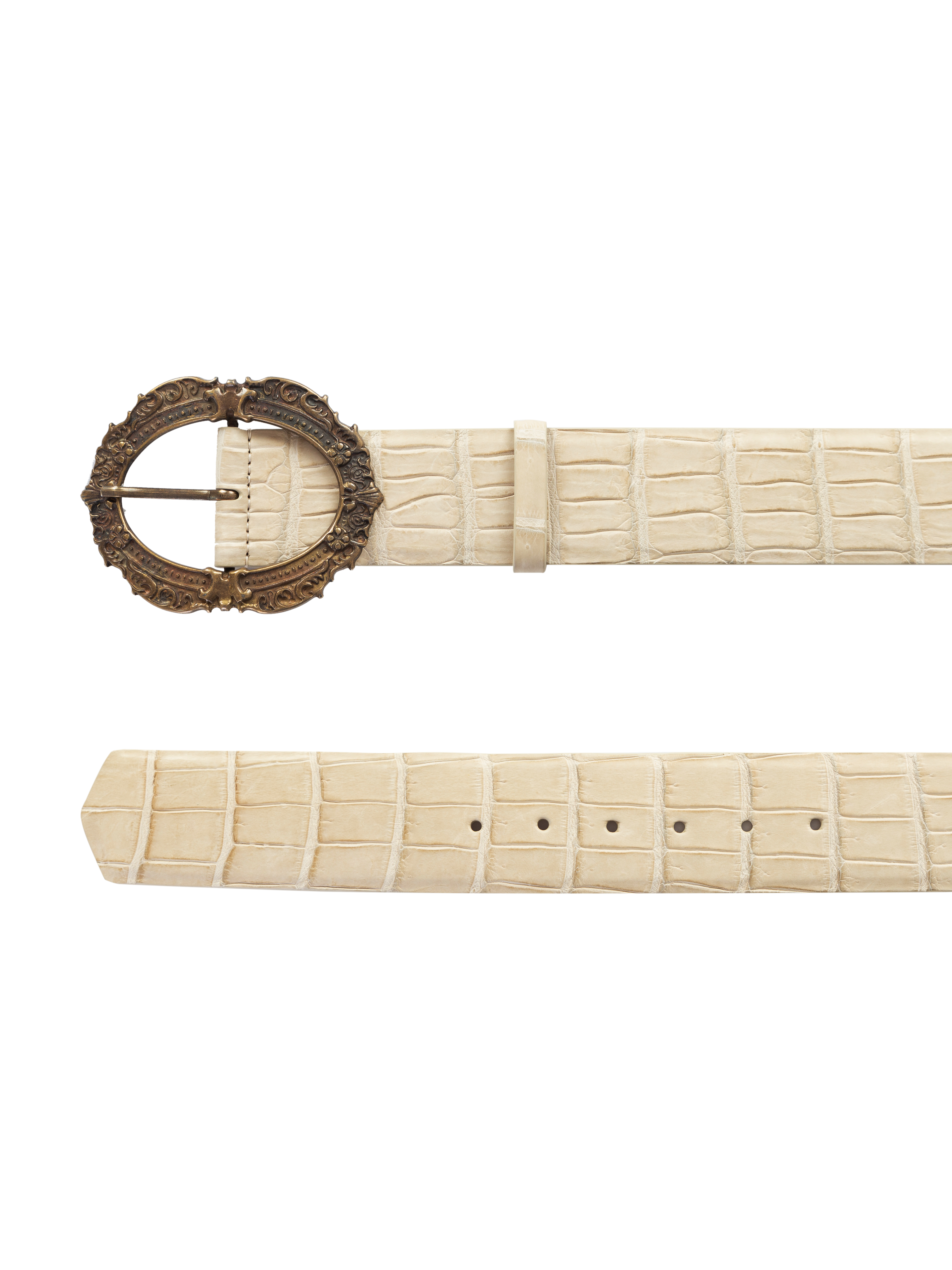 A light beige belt is made of crocodile leather and complemented by a shaped metal buckle.