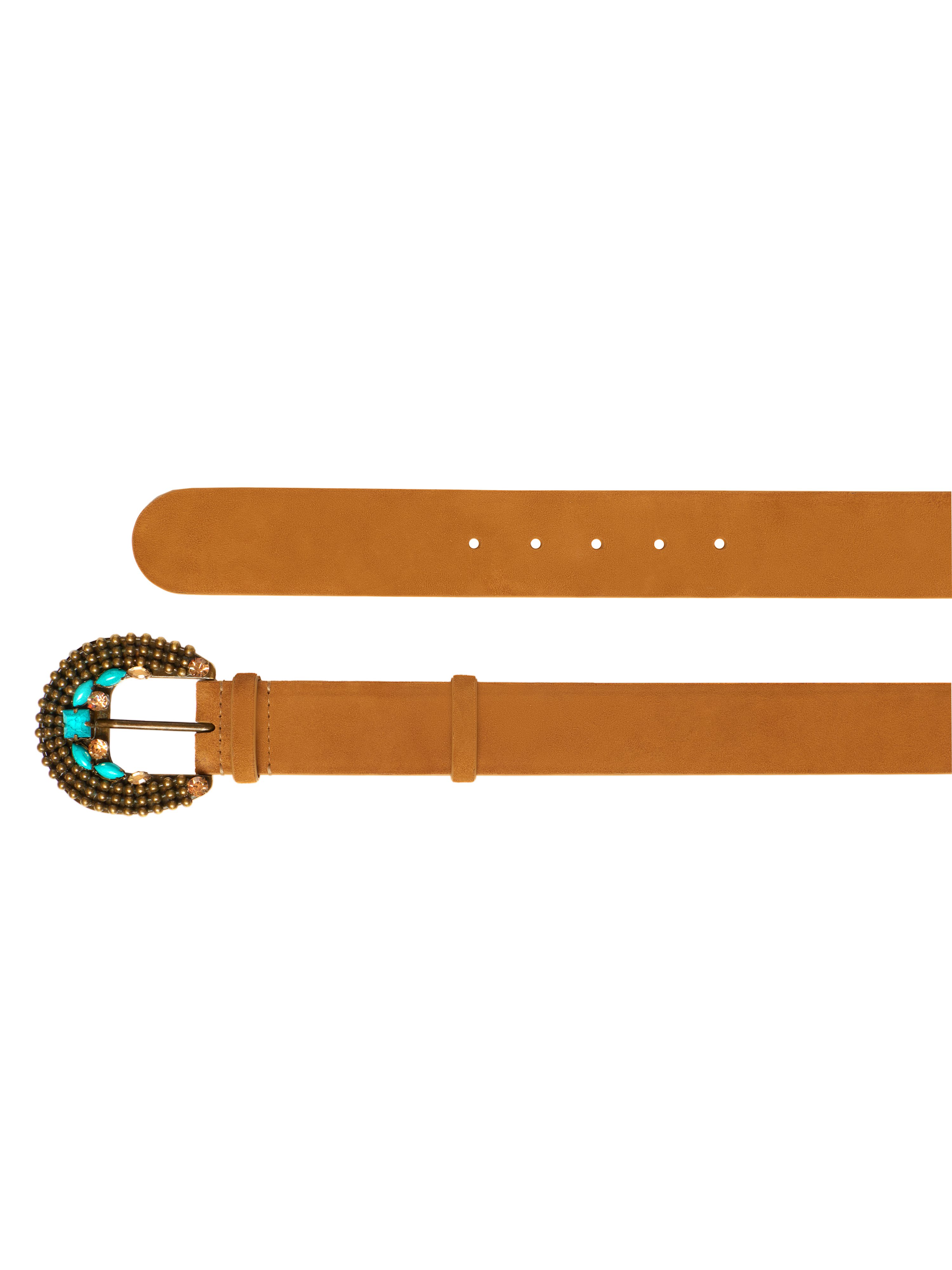 The light brown belt is made of genuine suede and complemented with a metal buckle with turquoise decor.