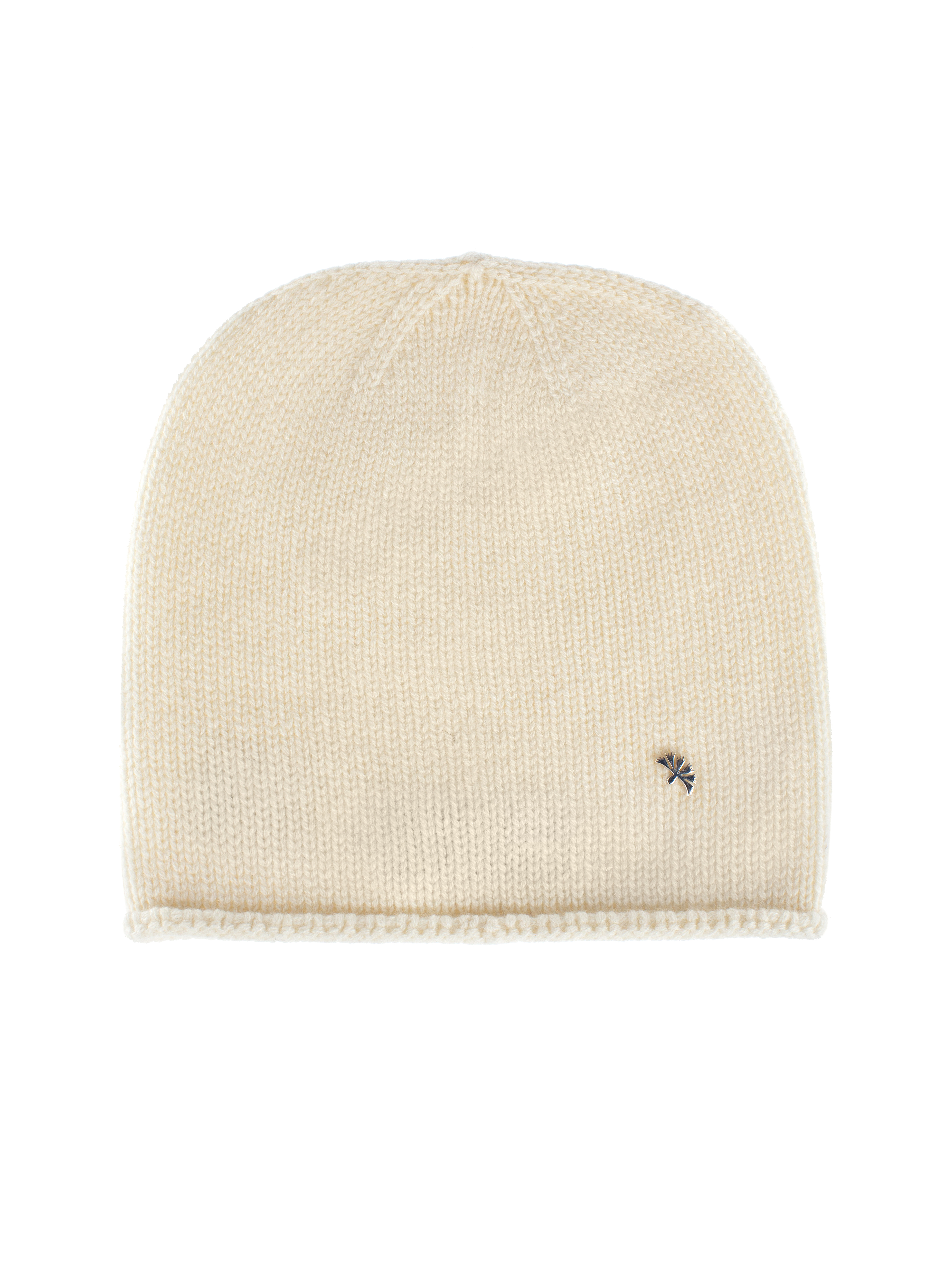 The knitted milk-colored hat is made of cashmere and complemented with a cornflower ornament in 925 sterling silver.