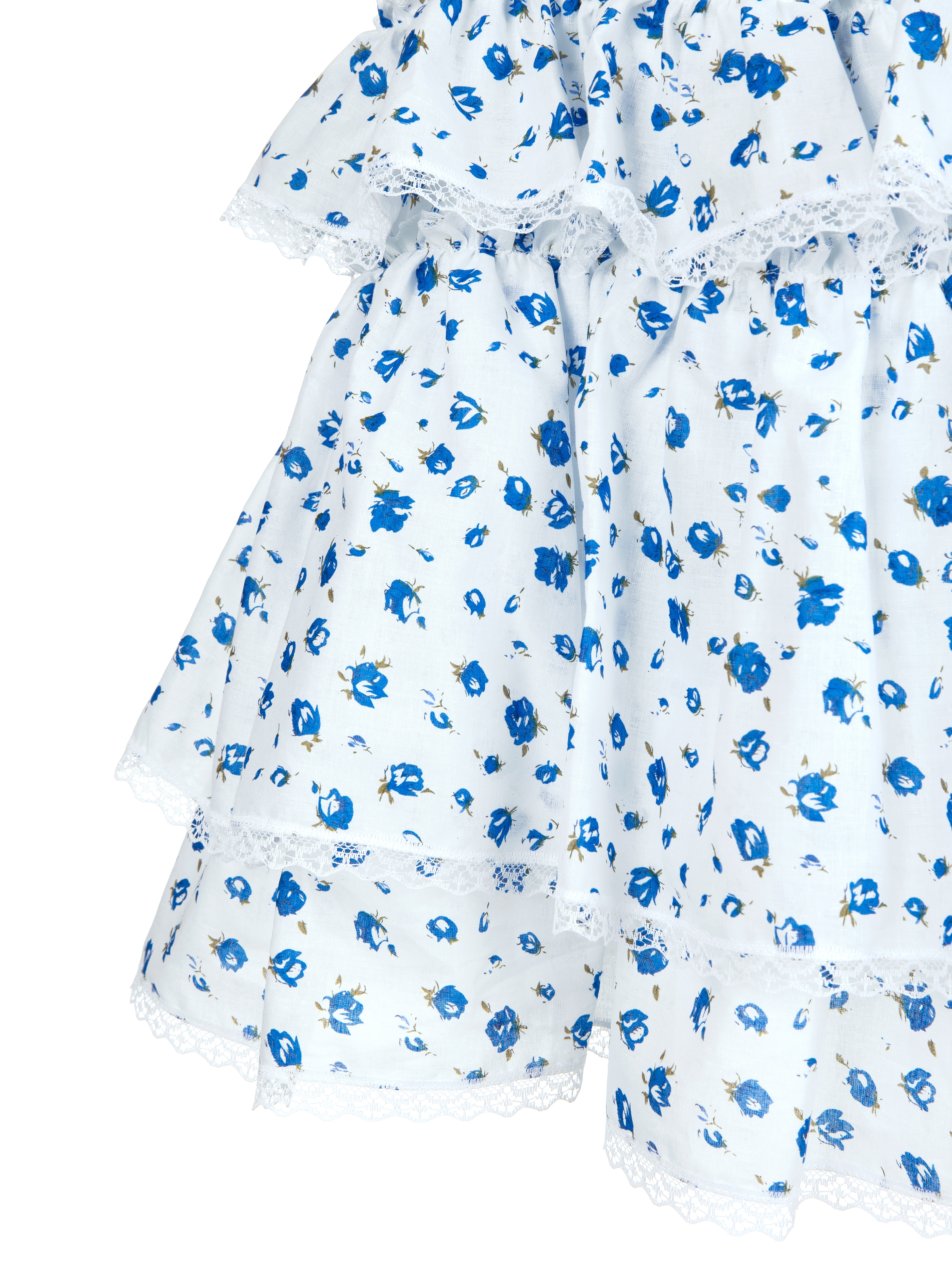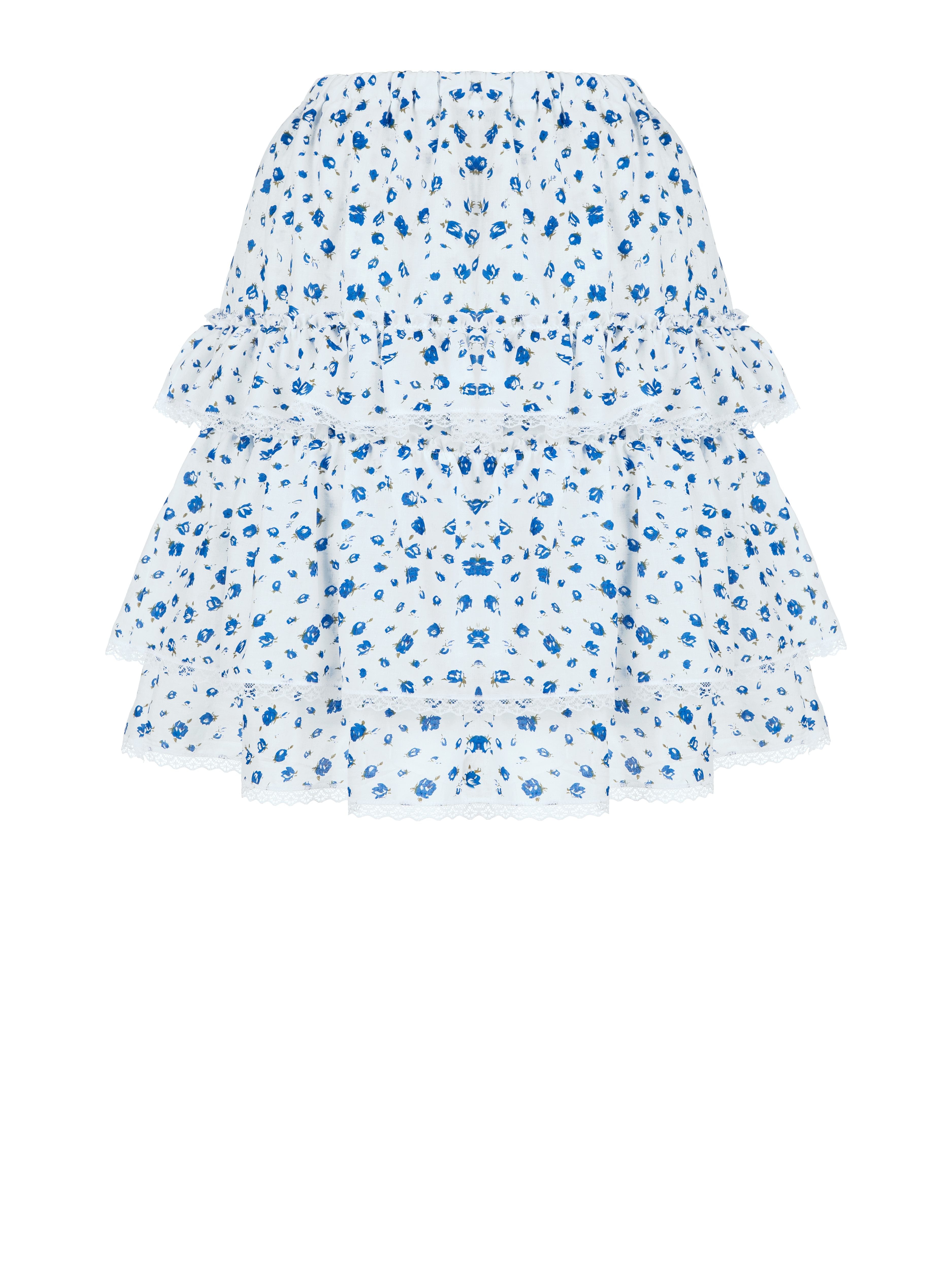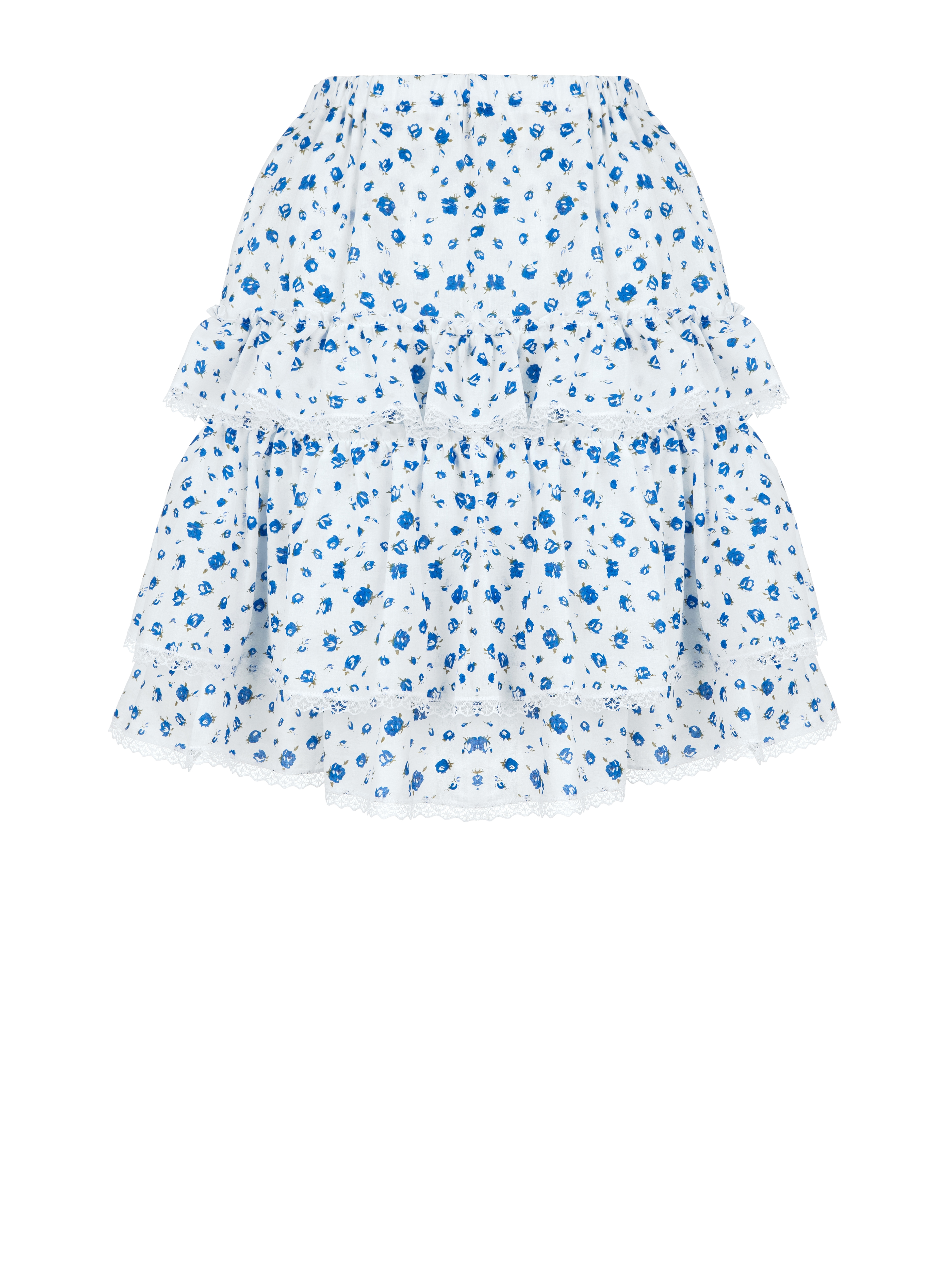 A lightweight skirt with an elastic waistband and blue floral print is made of cotton and decorated with ruffles and lace trim. We recommend pairing it with a light blue corset and Silver by Yana jewelry.