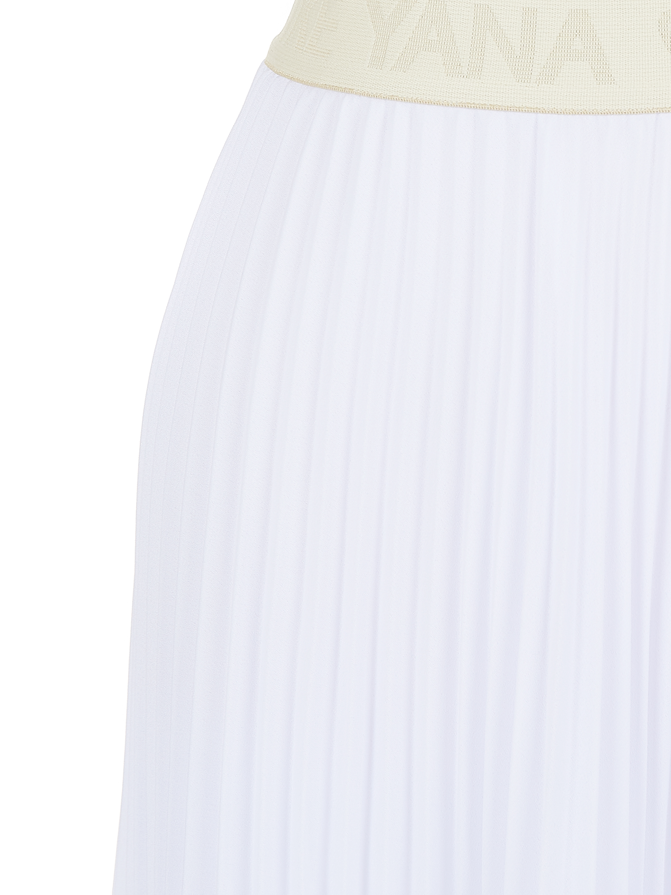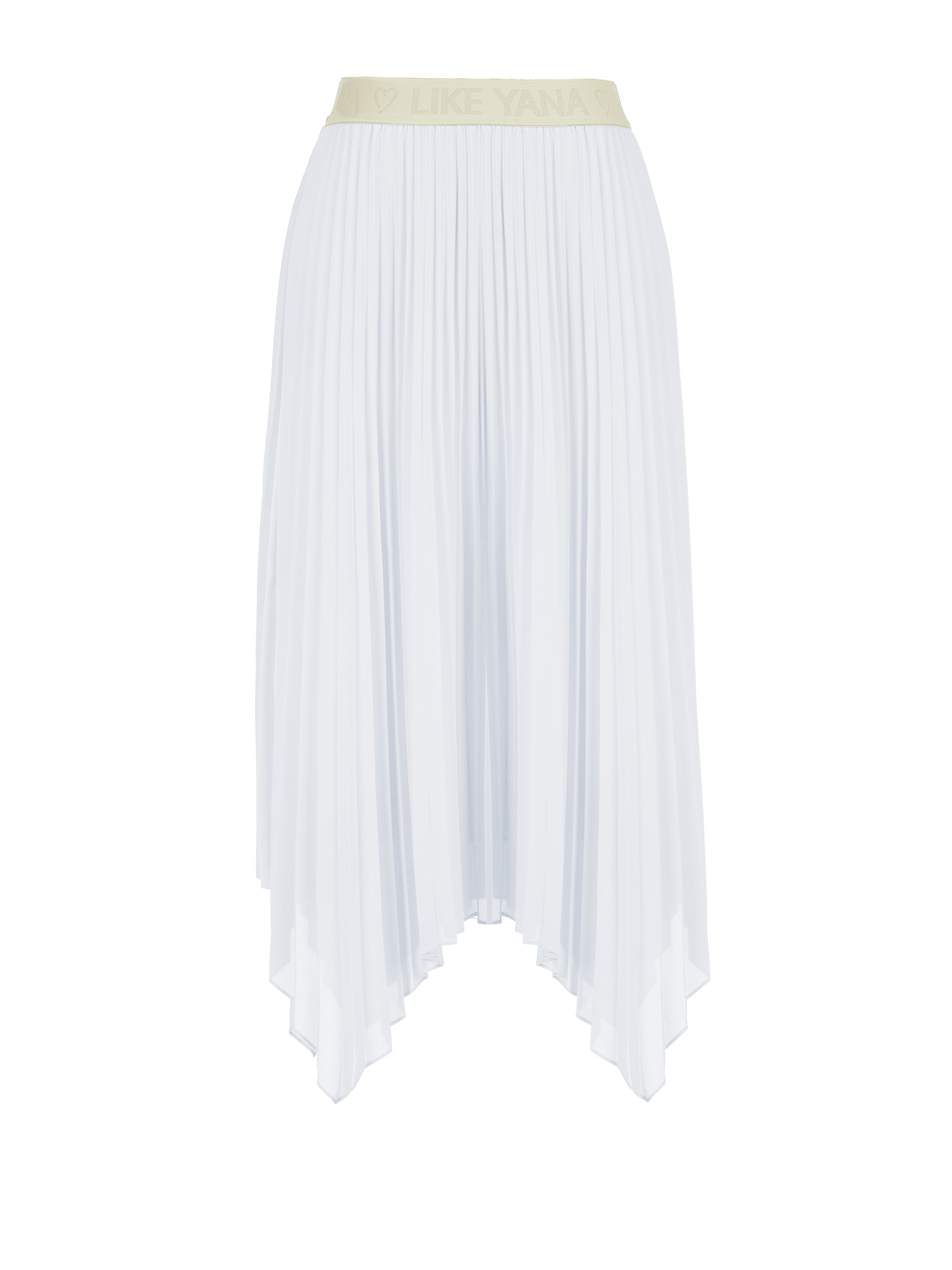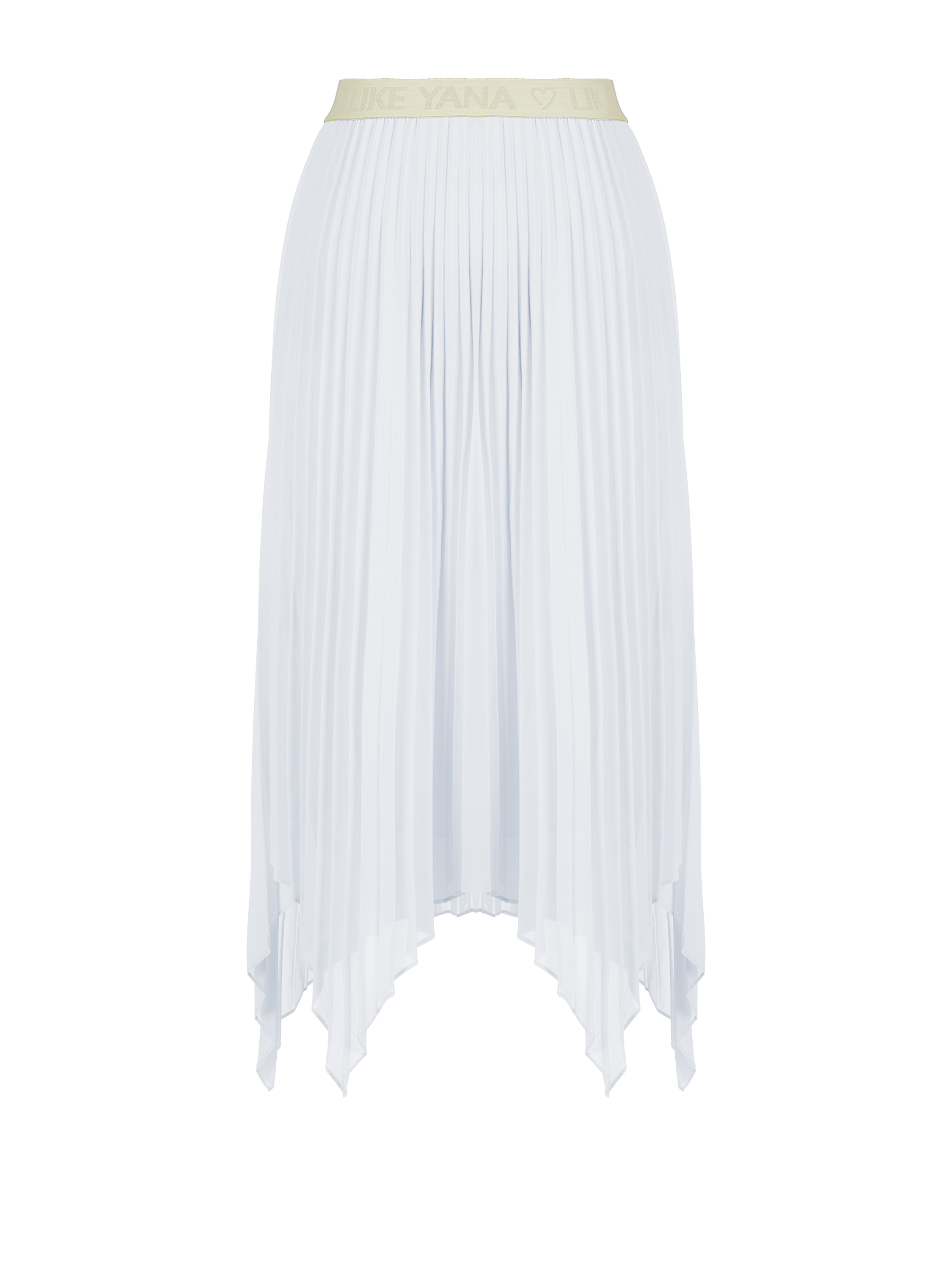 The white midi skirt is made of silky pleated fabric. The model is complemented by an asymmetric hem and a wide elastic waistband that gently hugs the waist.