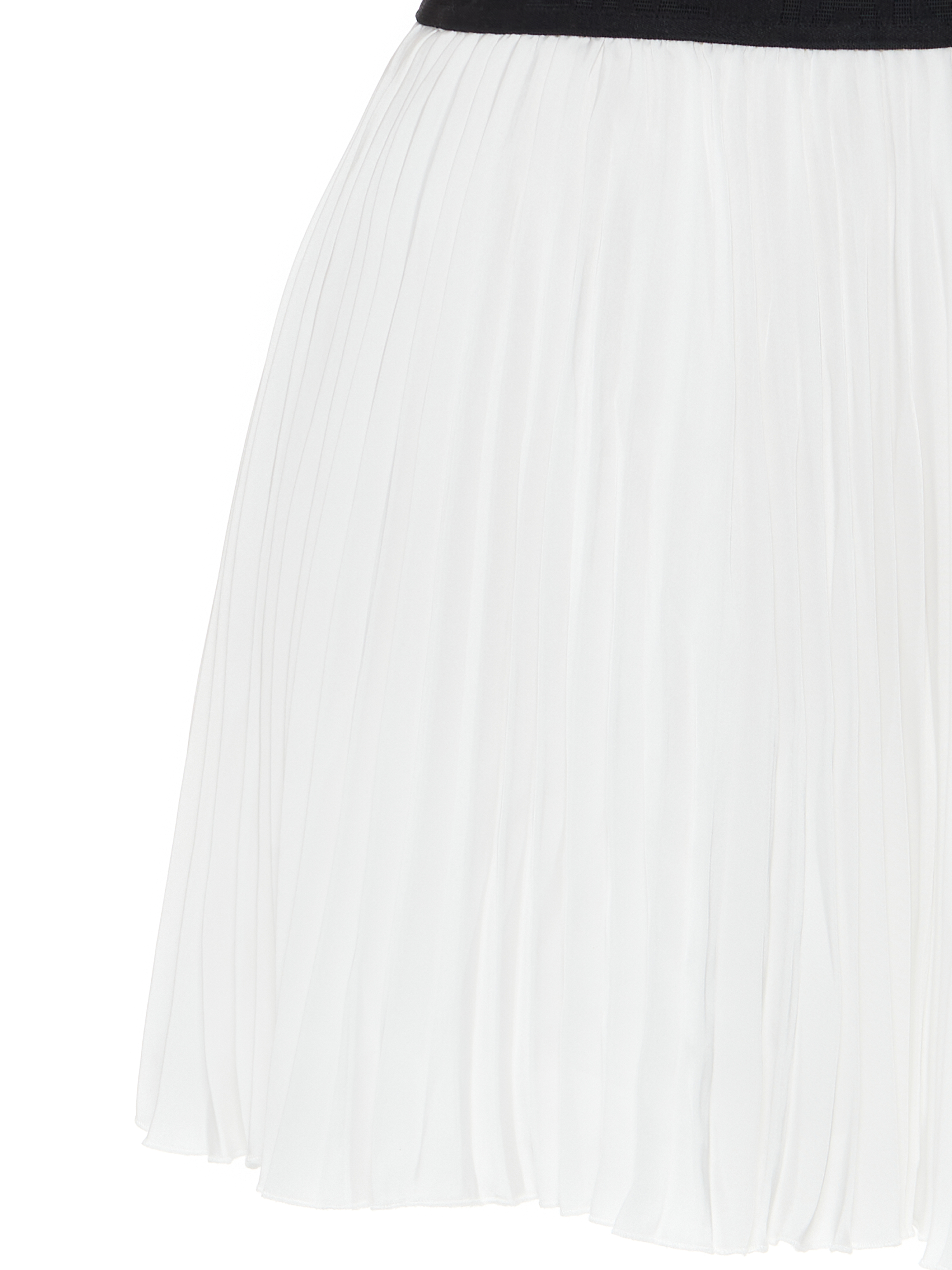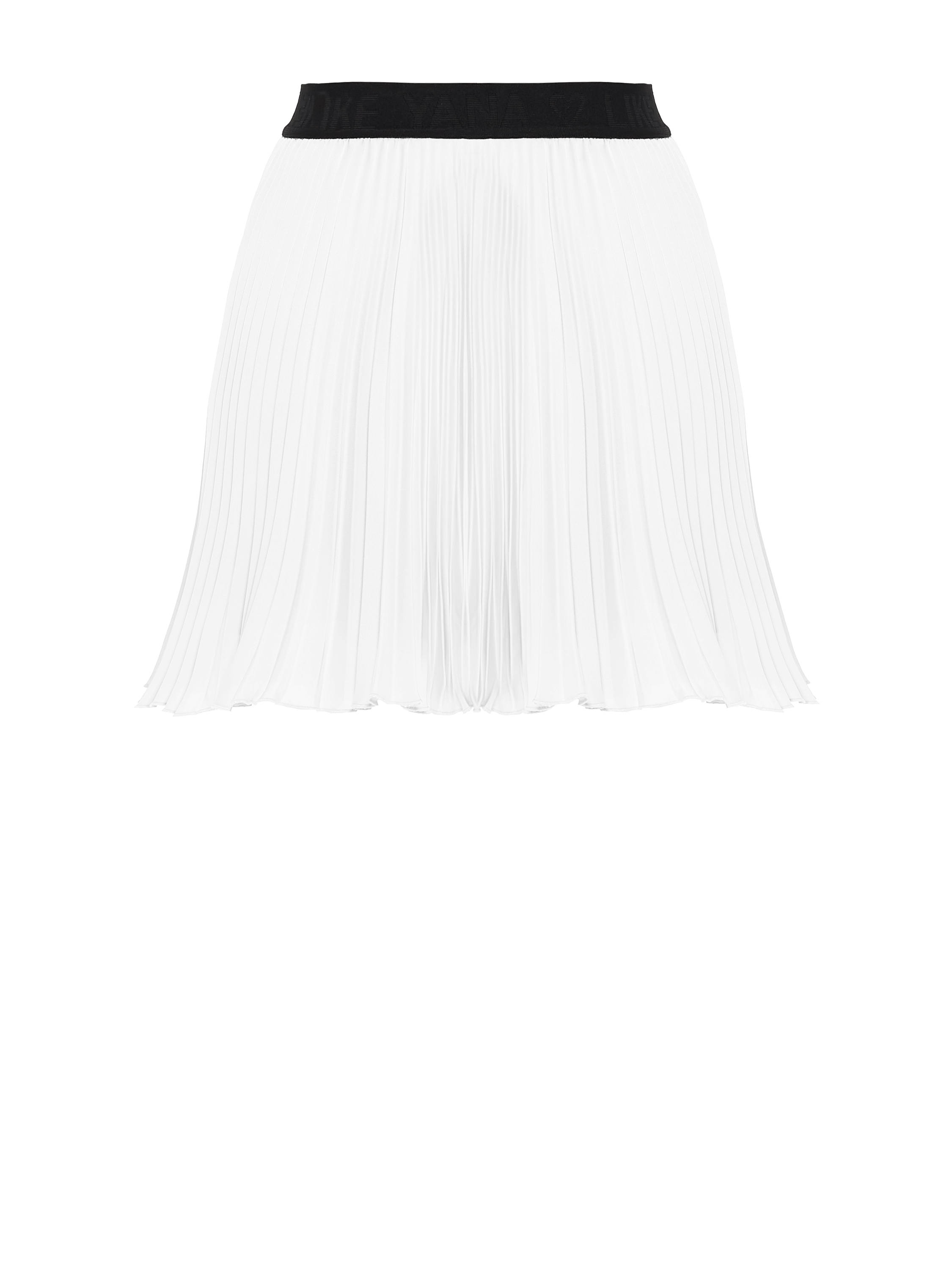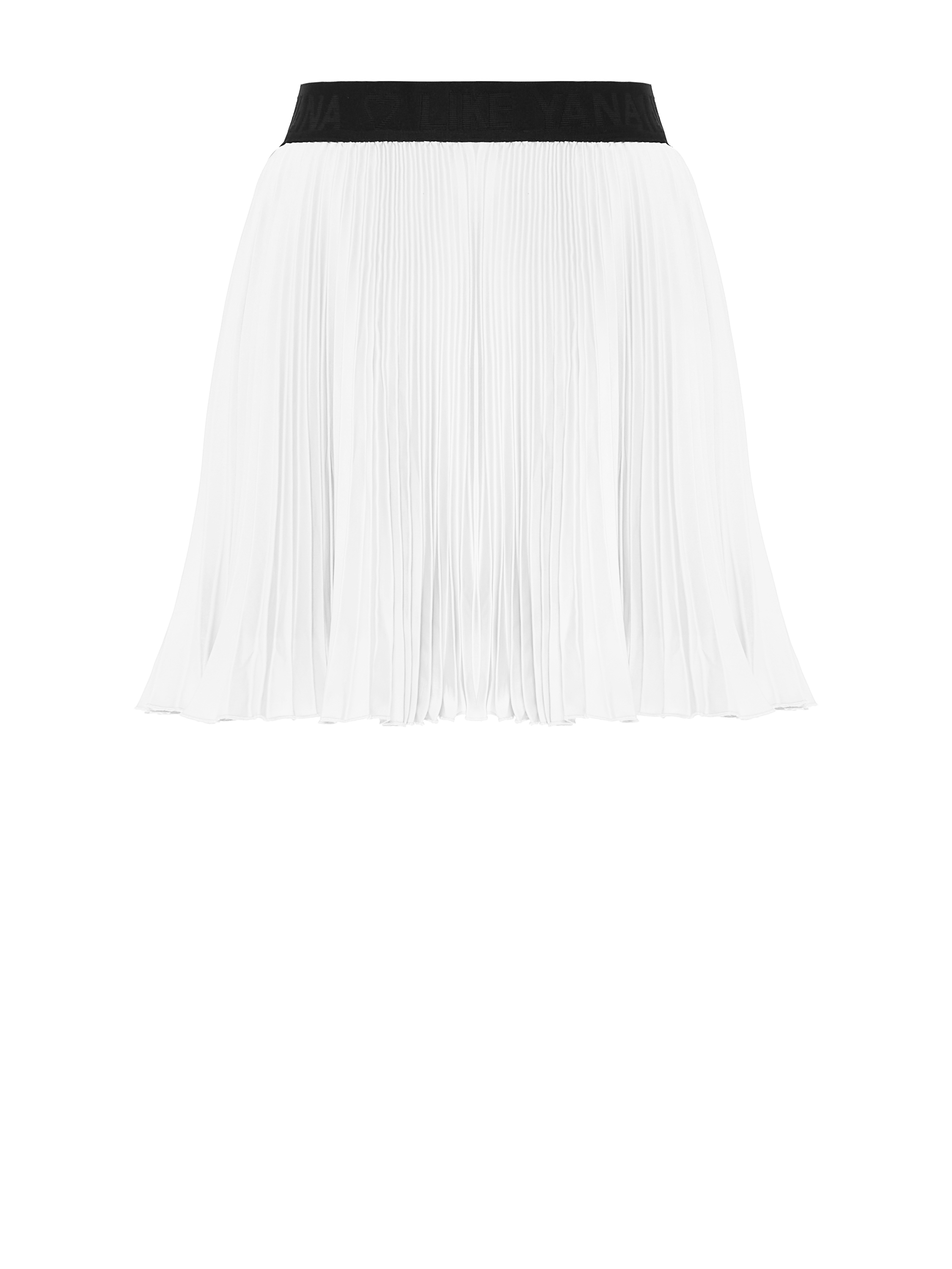 A white mini-length skirt is made of silky pleated fabric. The design is complemented by a wide black elastic waistband that gently hugs the waist. Wear it with cropped sweaters or tops.