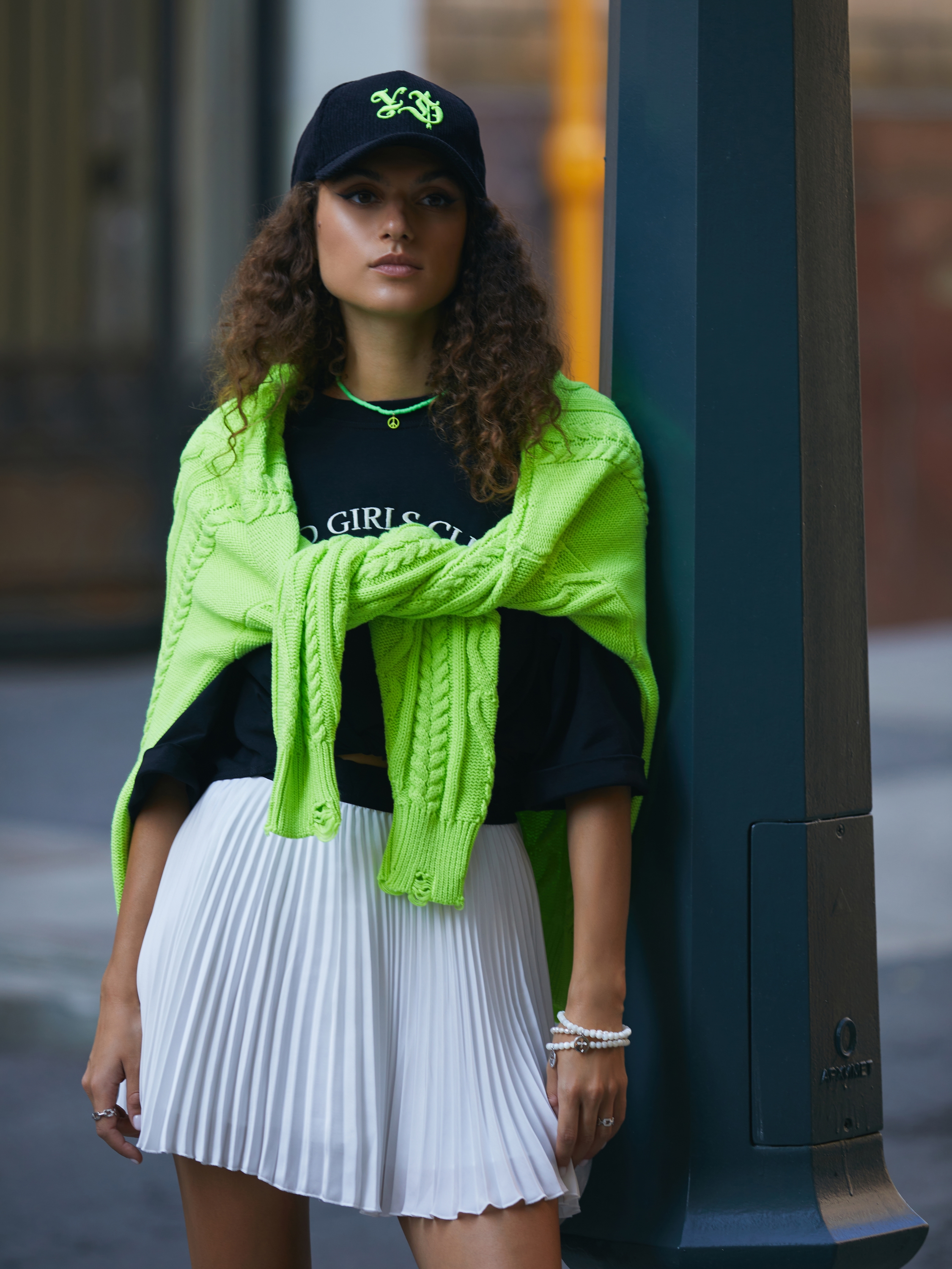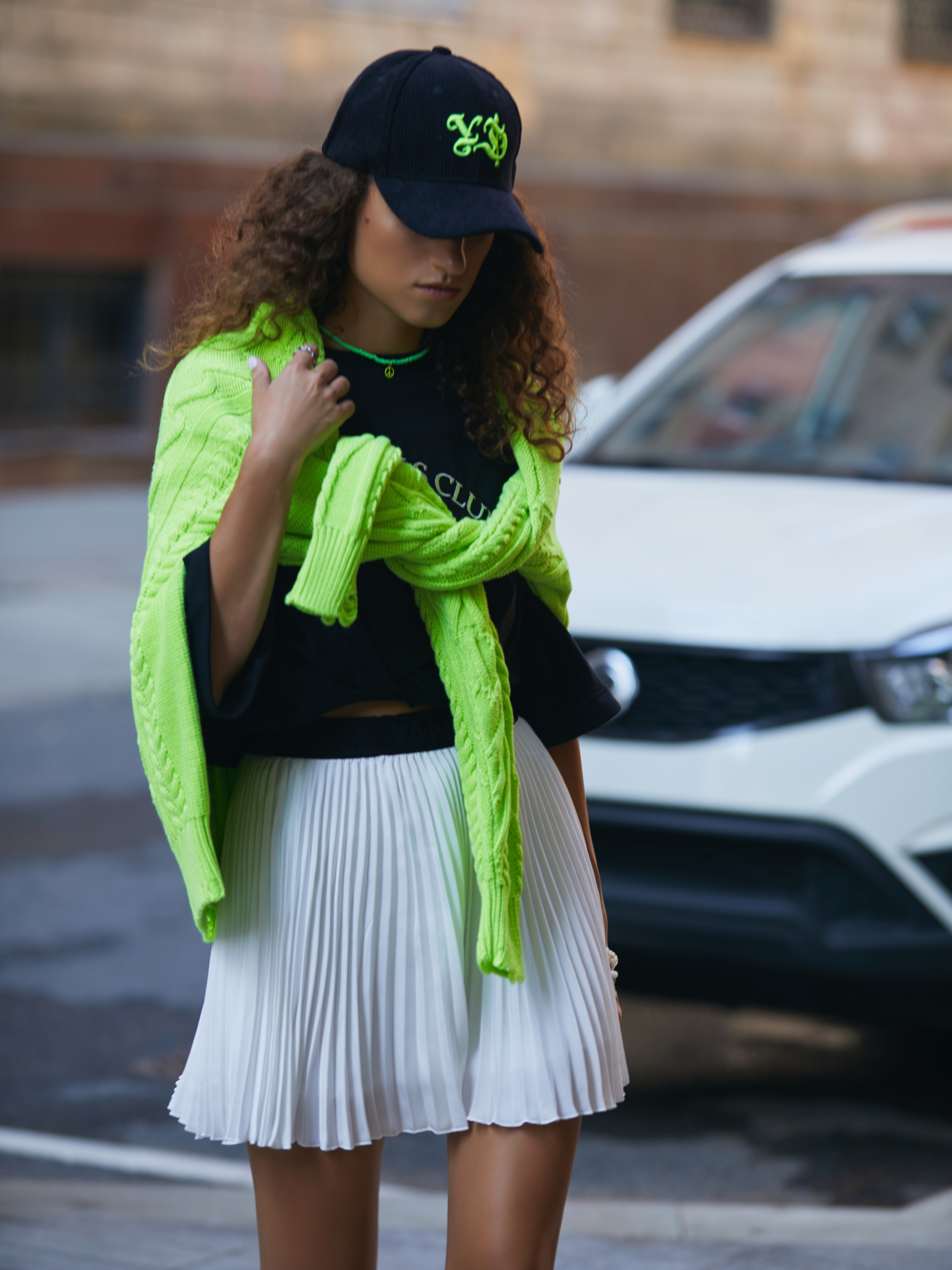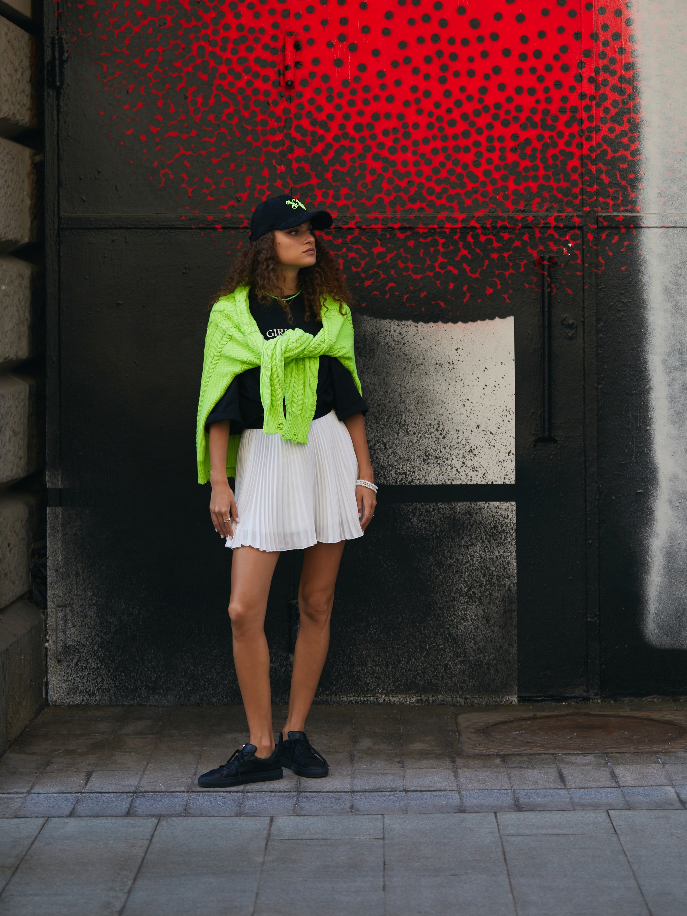 A white mini-length skirt is made of silky pleated fabric. The design is complemented by a wide black elastic waistband that gently hugs the waist. Wear it with cropped sweaters or tops.