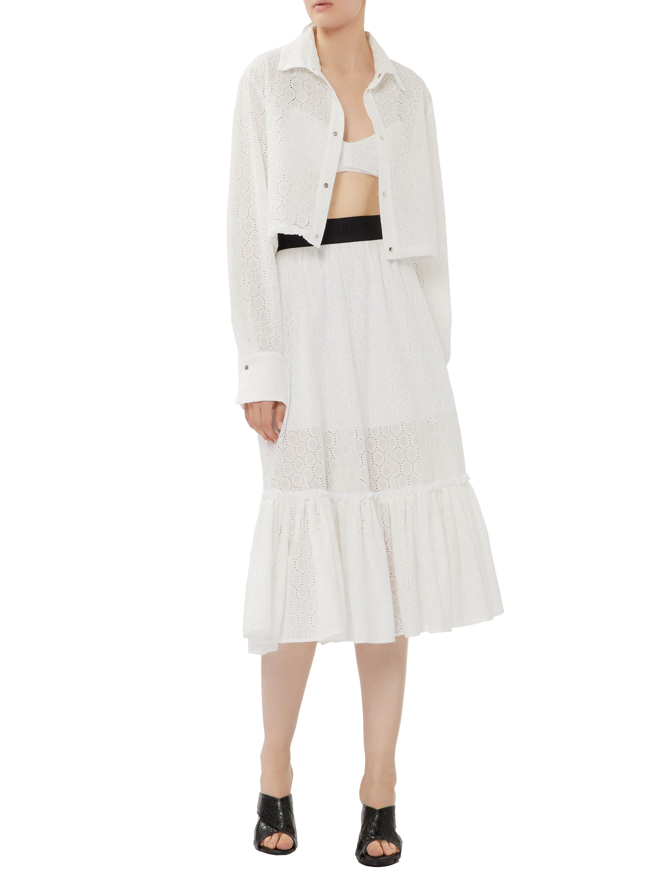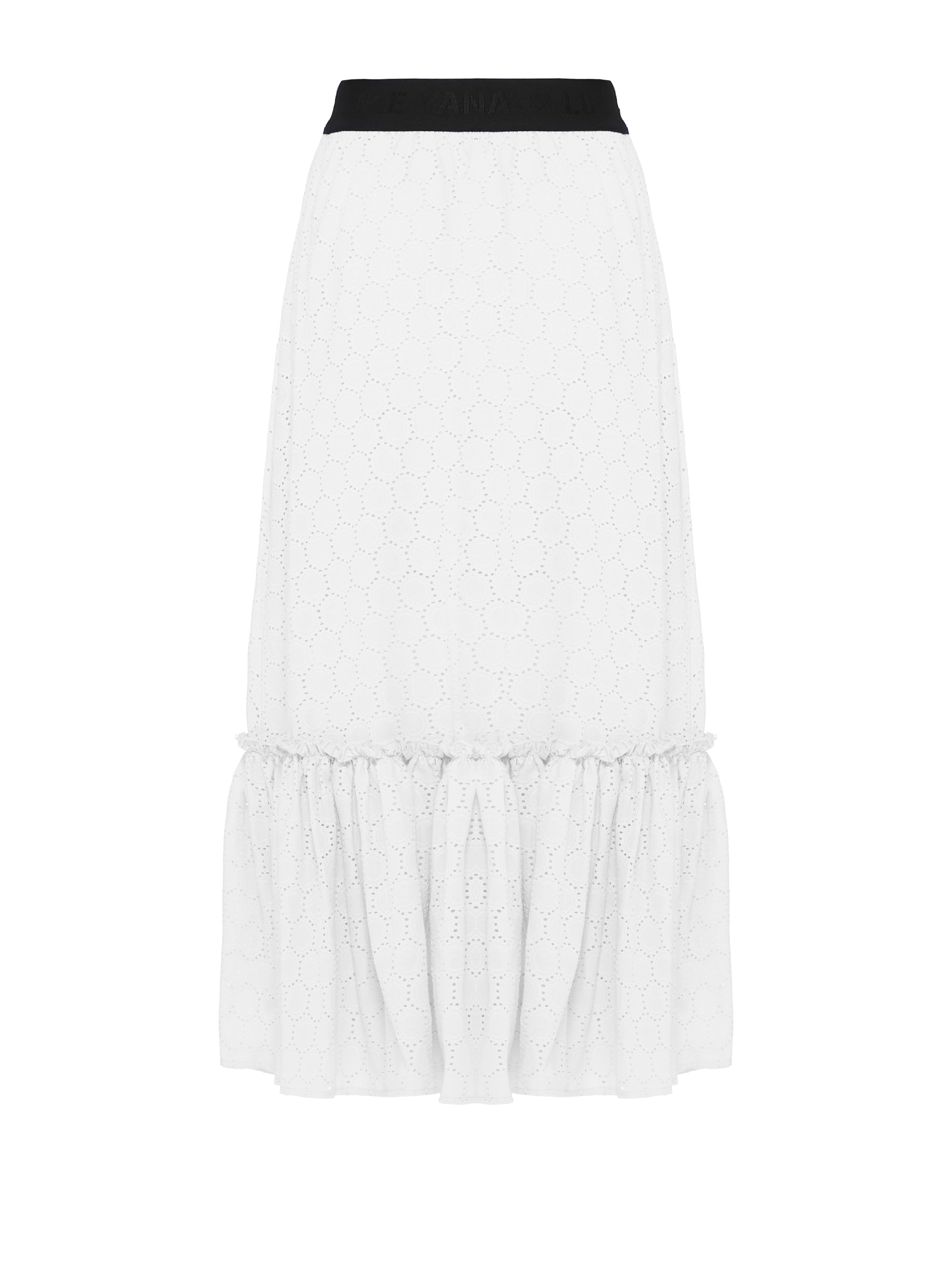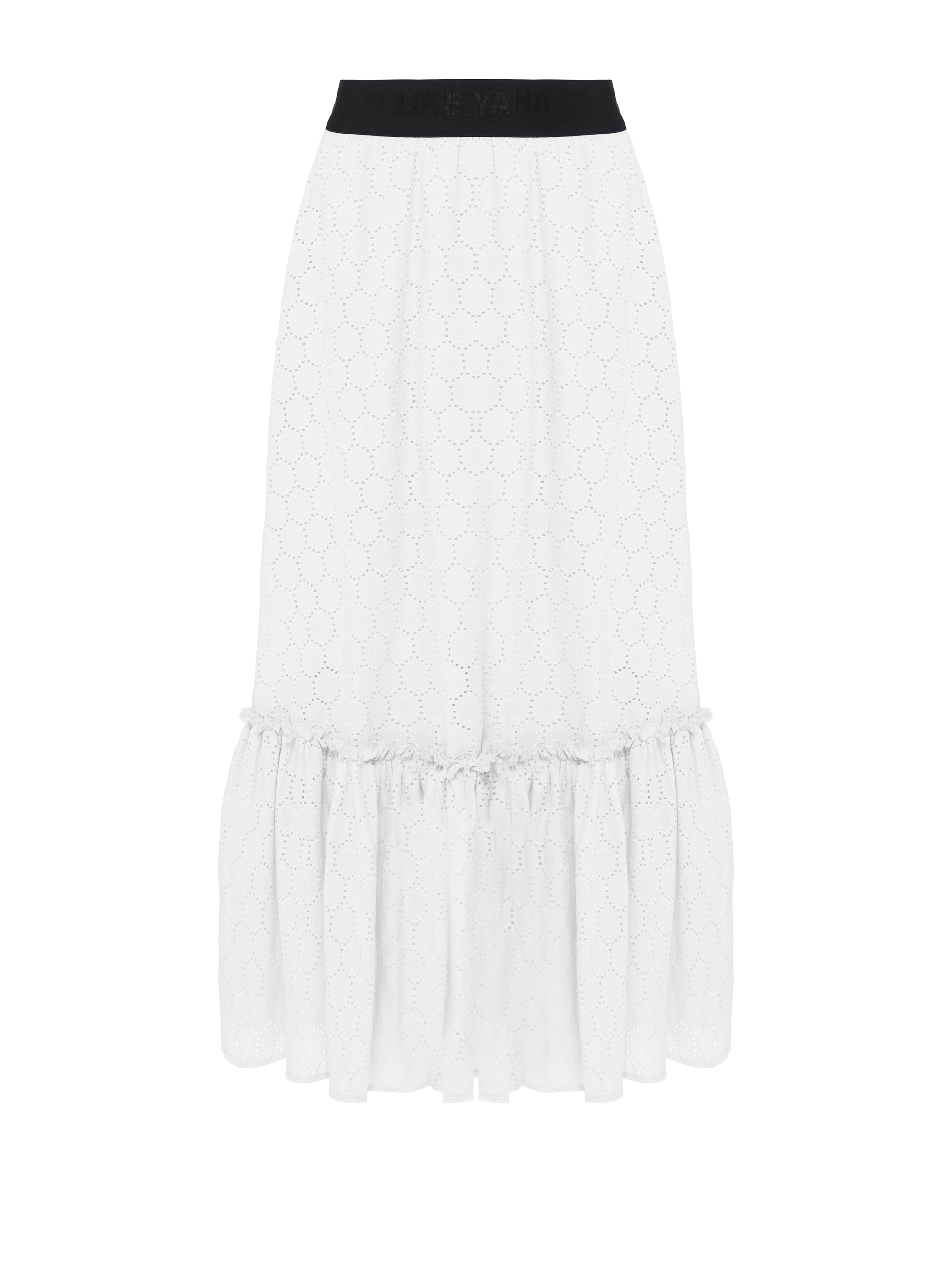A white midi-length skirt is made of cotton lace. The design is complemented by a detachable flounce at the hem and a wide black elastic waistband that gently hugs the waist. Wear it with cropped blouses or tops.