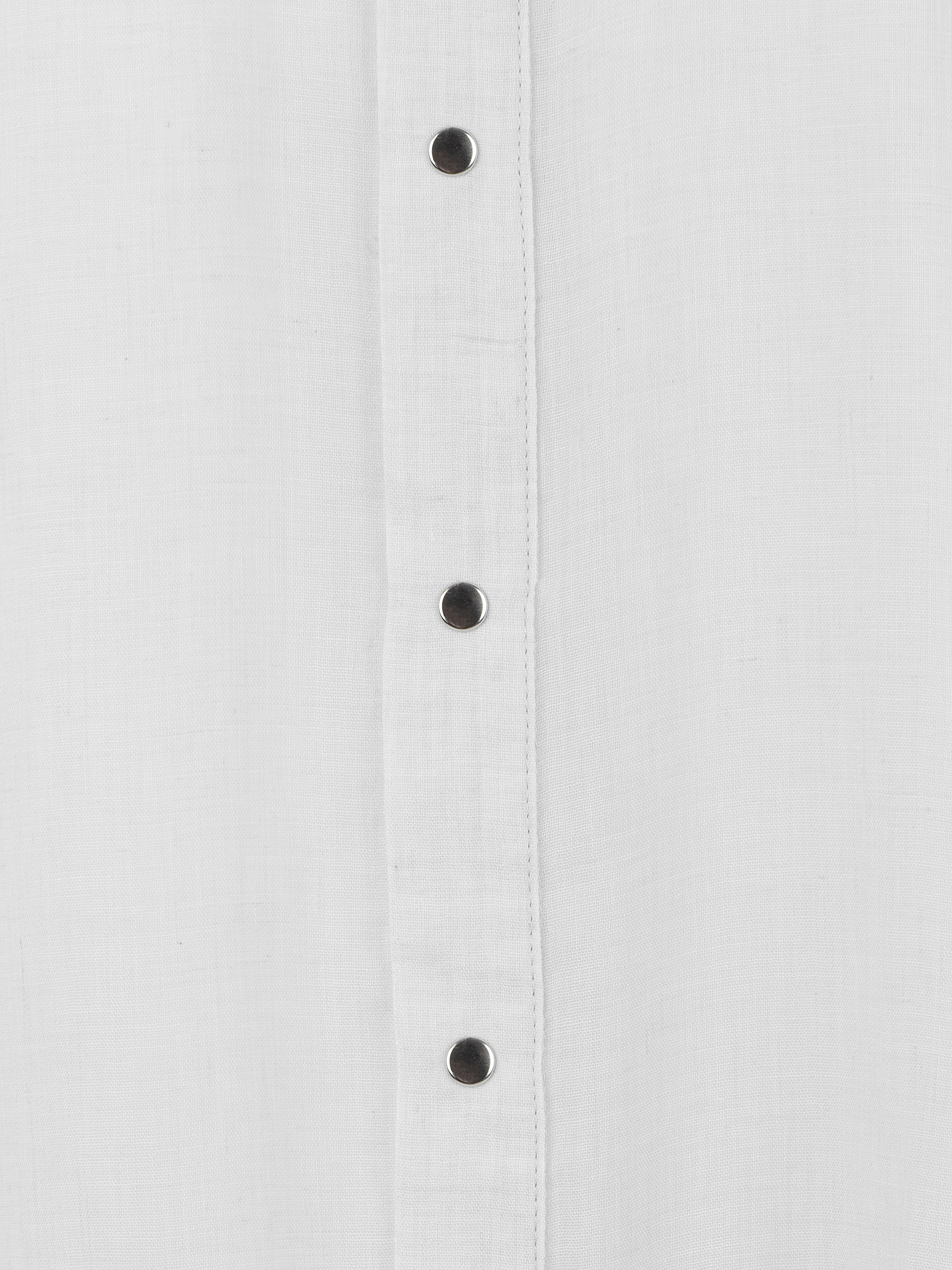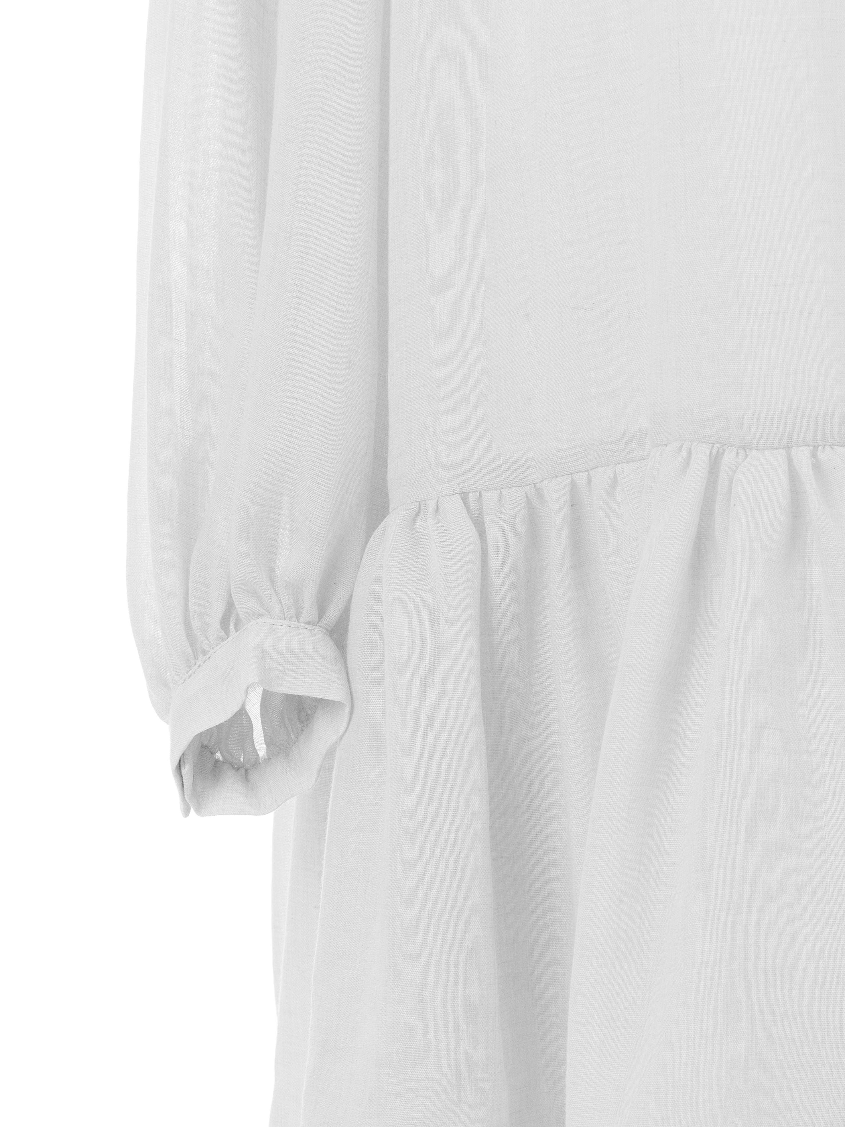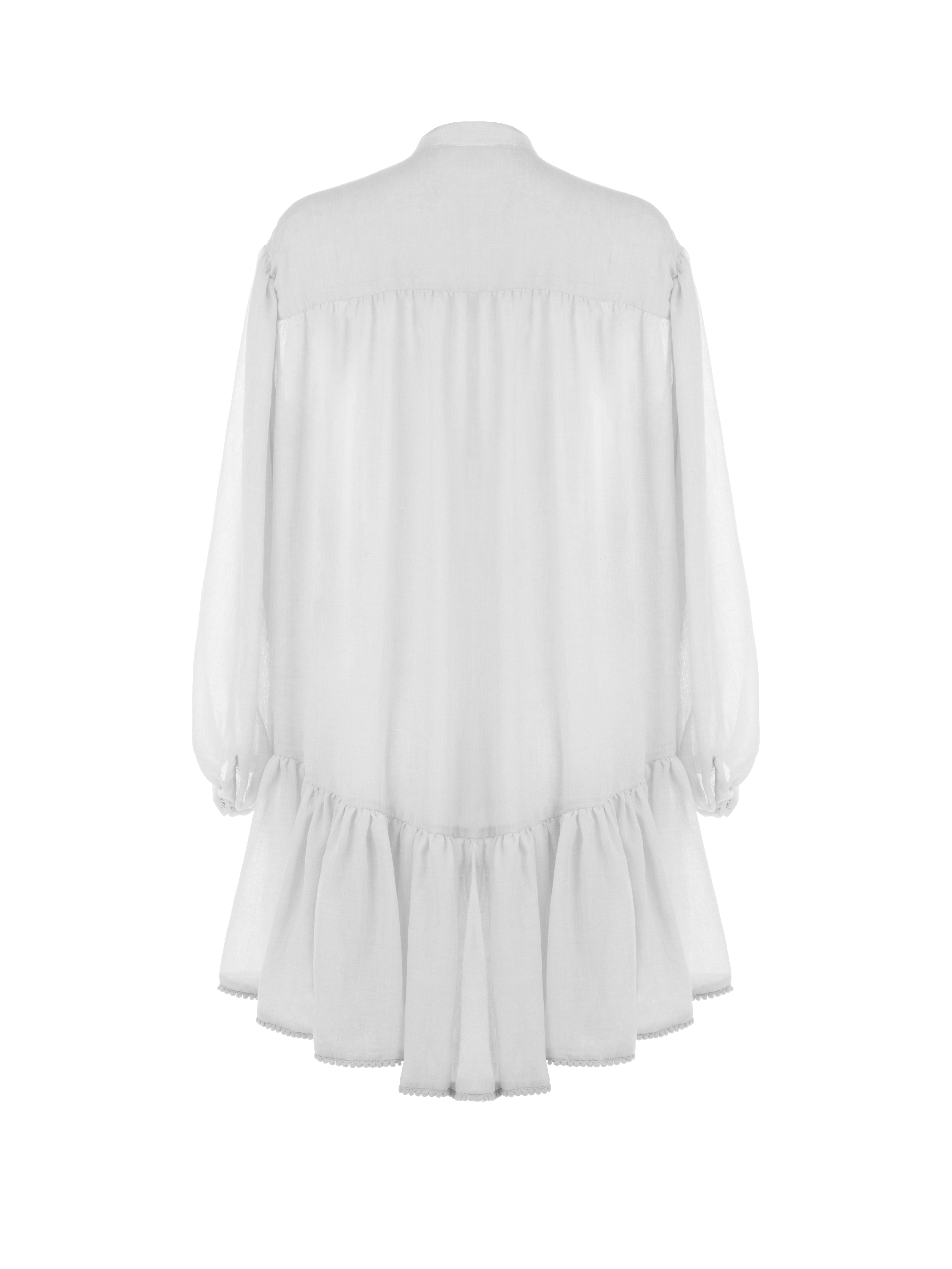 Short white cotton dress. Free-flowing silhouette is completed with a stand-up collar, long puffed sleeves and a cut-off flounce on the hem.