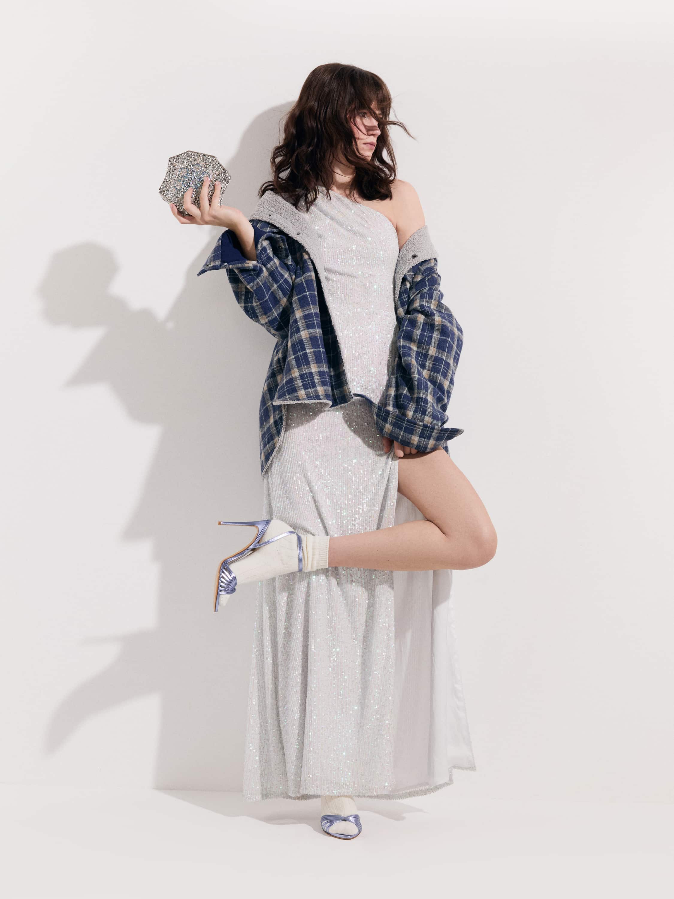 Asymmetrical maxi dress embroided with white sequins. A floor-length skirt with a slit in the front, drapery on the shoulder and a hidden zipper on the side.
