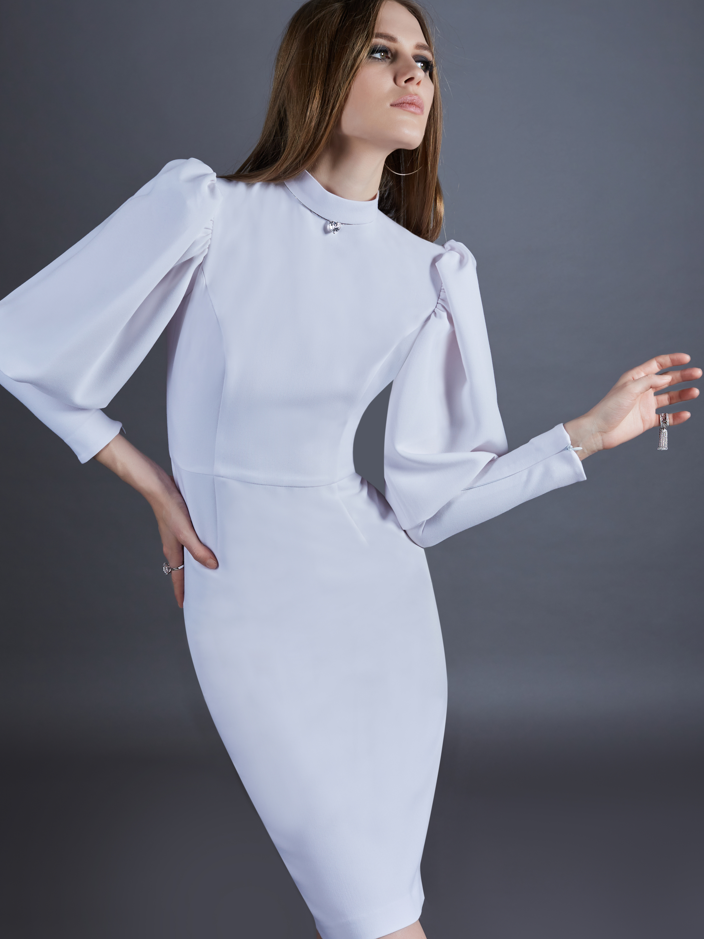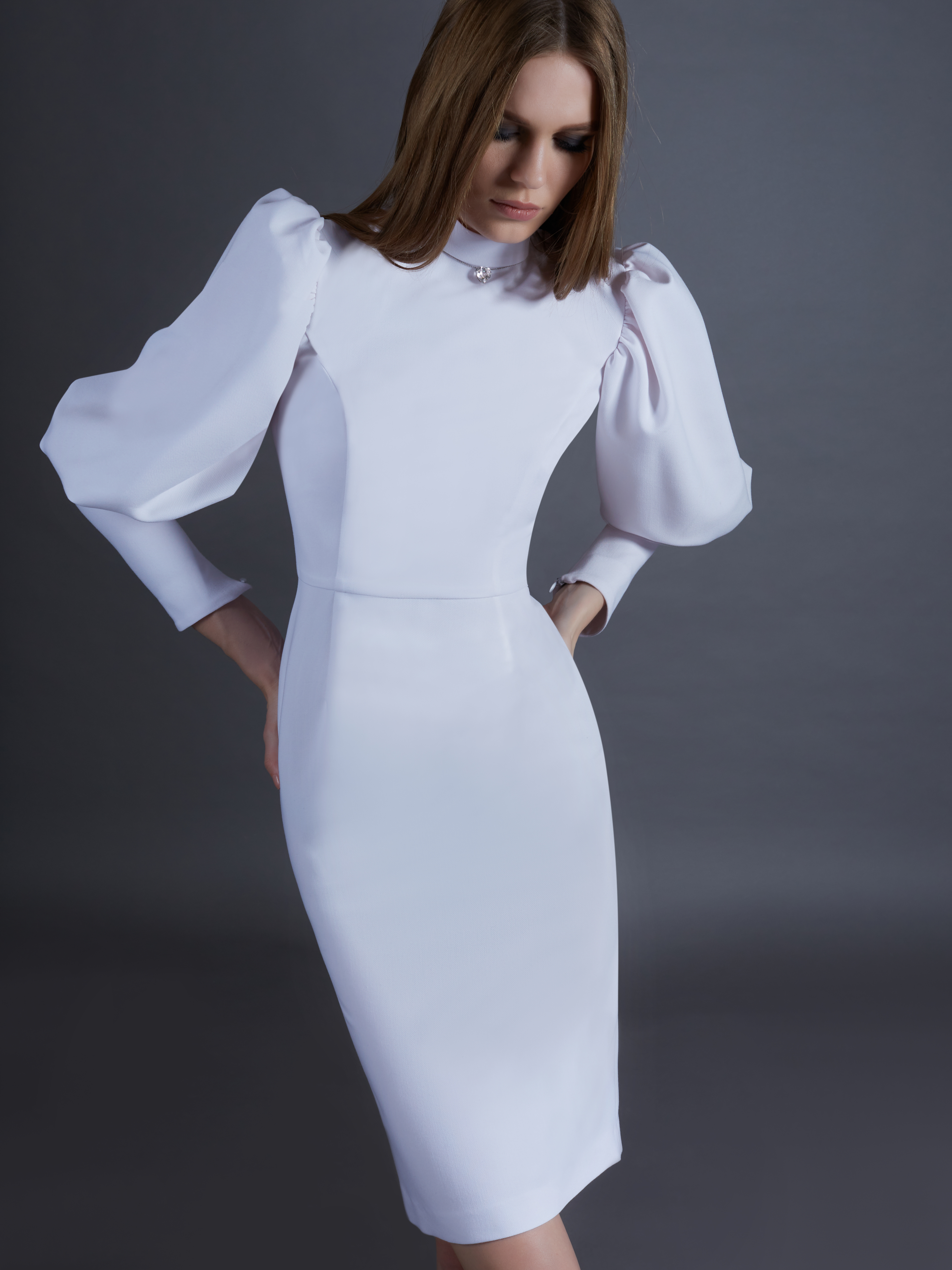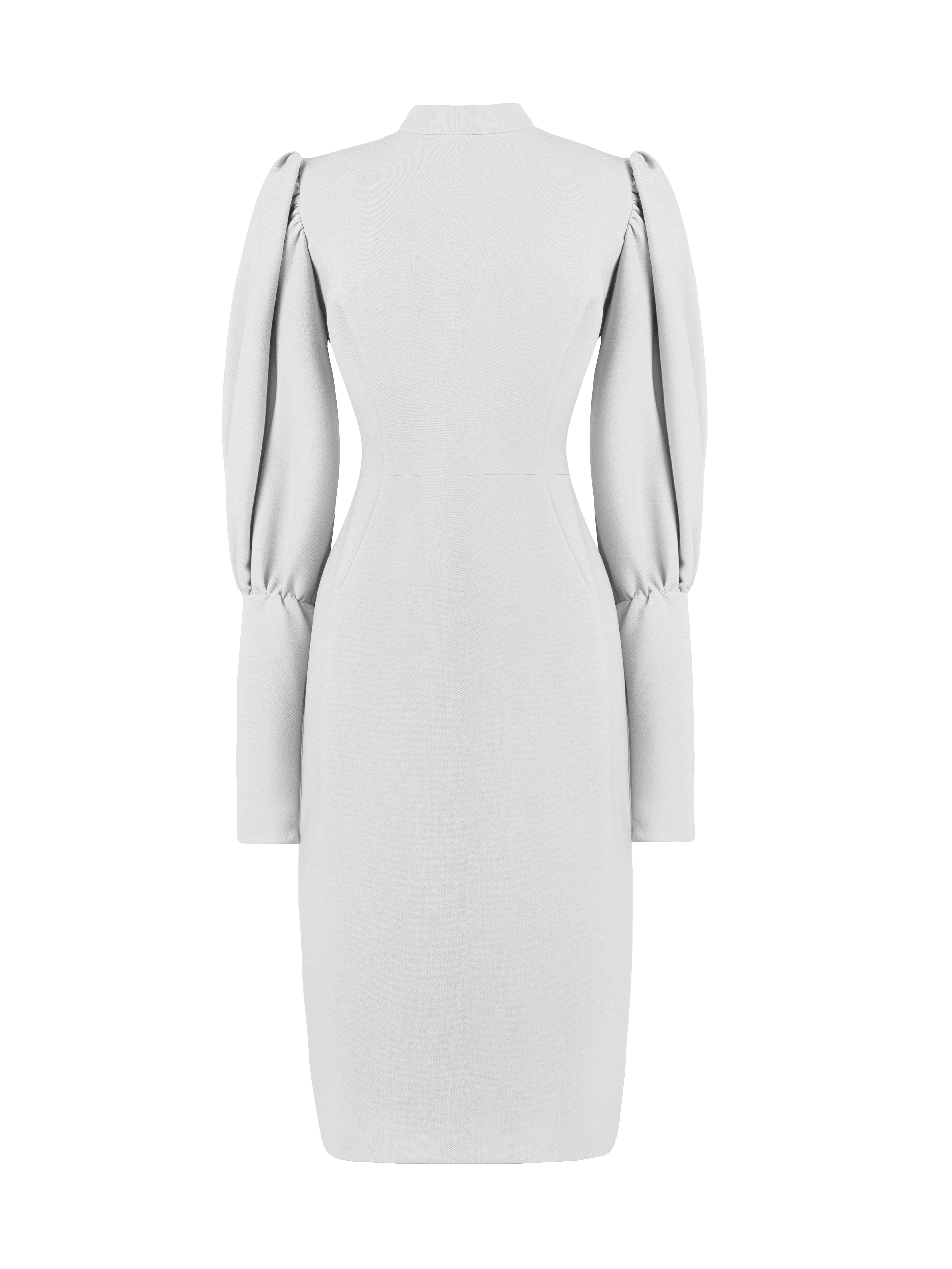 White midi dress with long puffy sleeves and high cuffs is made of rayon-blend. The model opens the back, and long ribbons are tied in an elegant bow in the back.