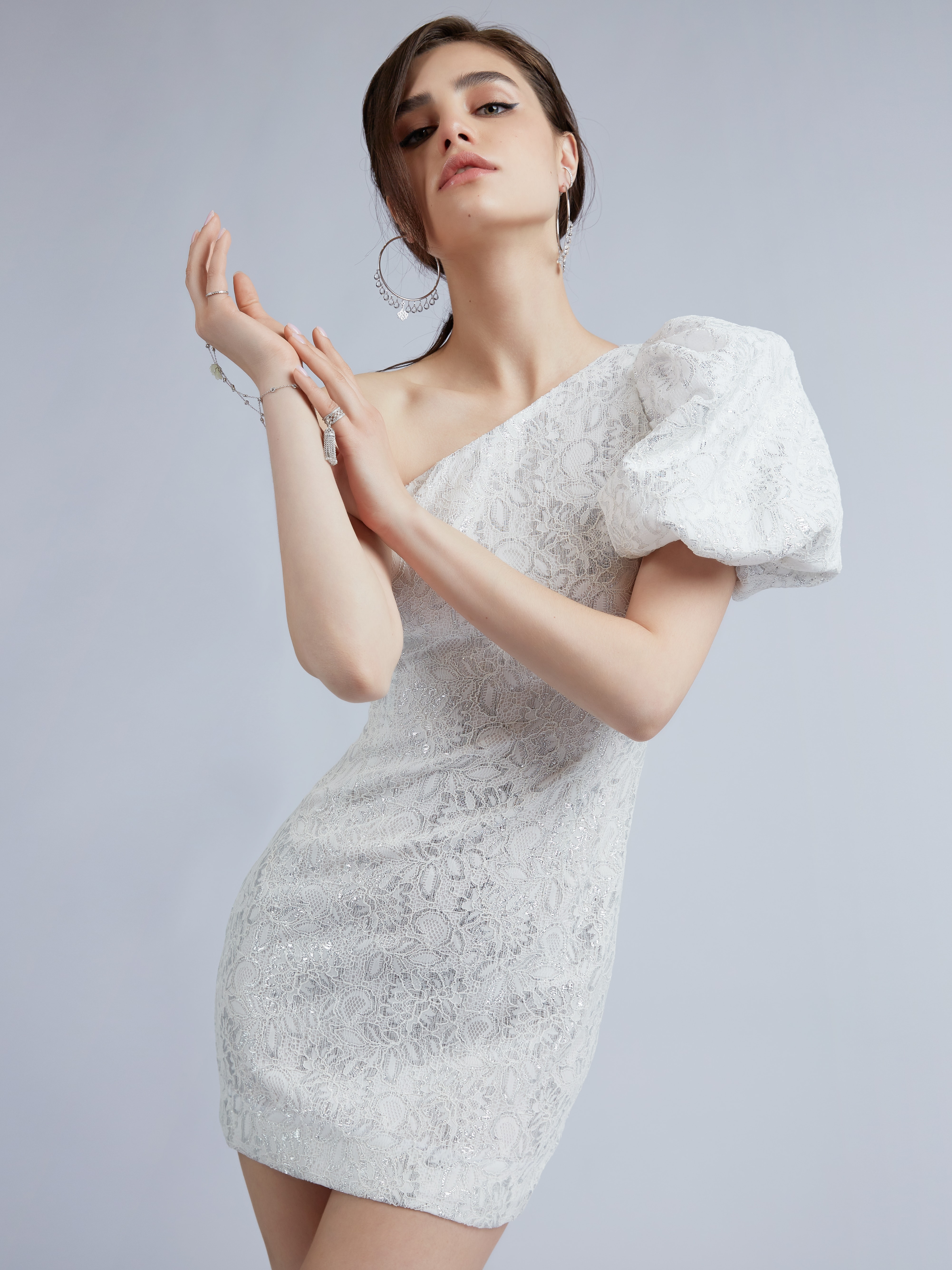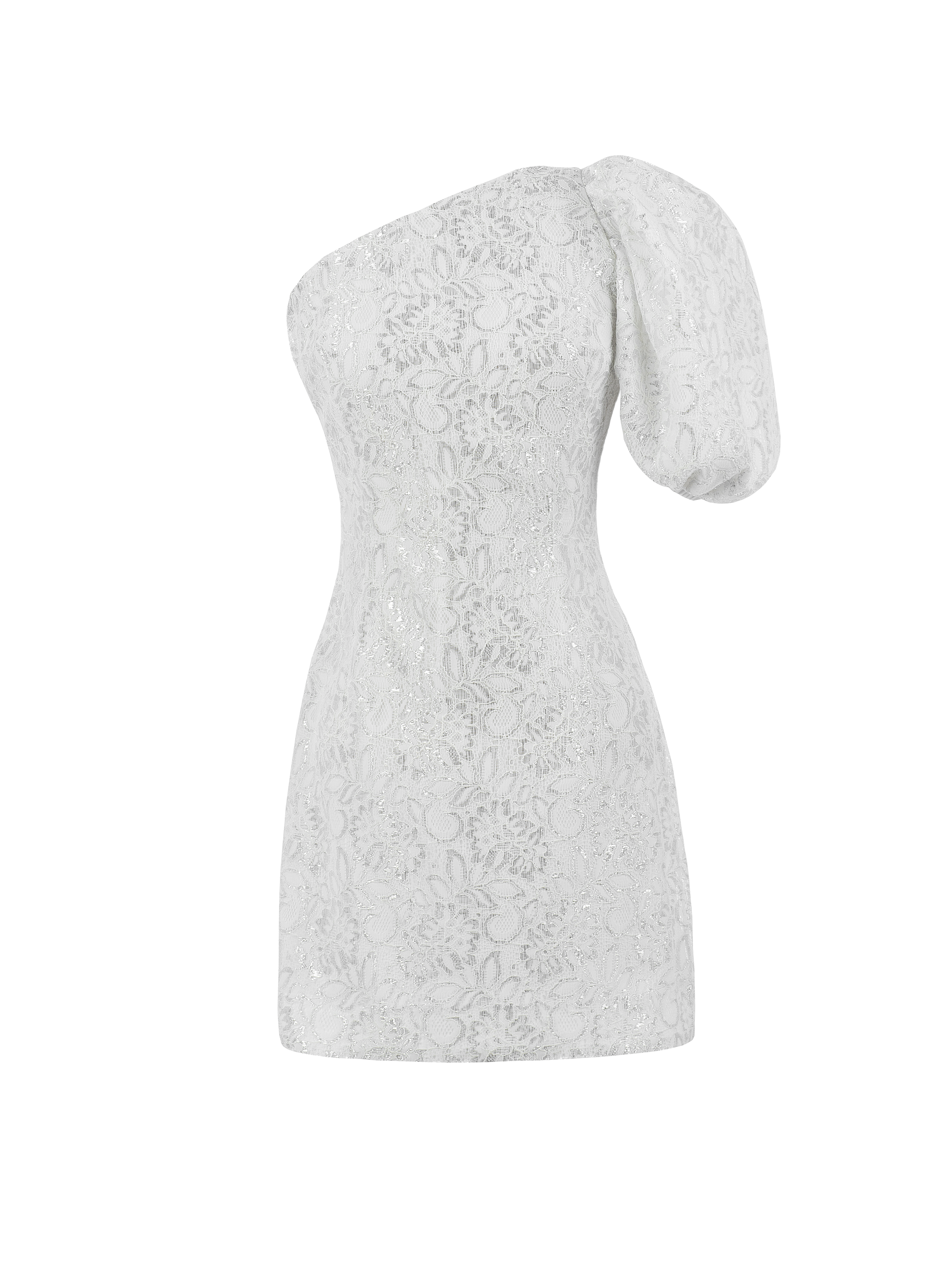 Mini dress with an asymmetrical top is made of thin white lace with the addition of lurex thread, which gives it solemnity. The model is completed with a voluminous buff sleeve on one shoulder.