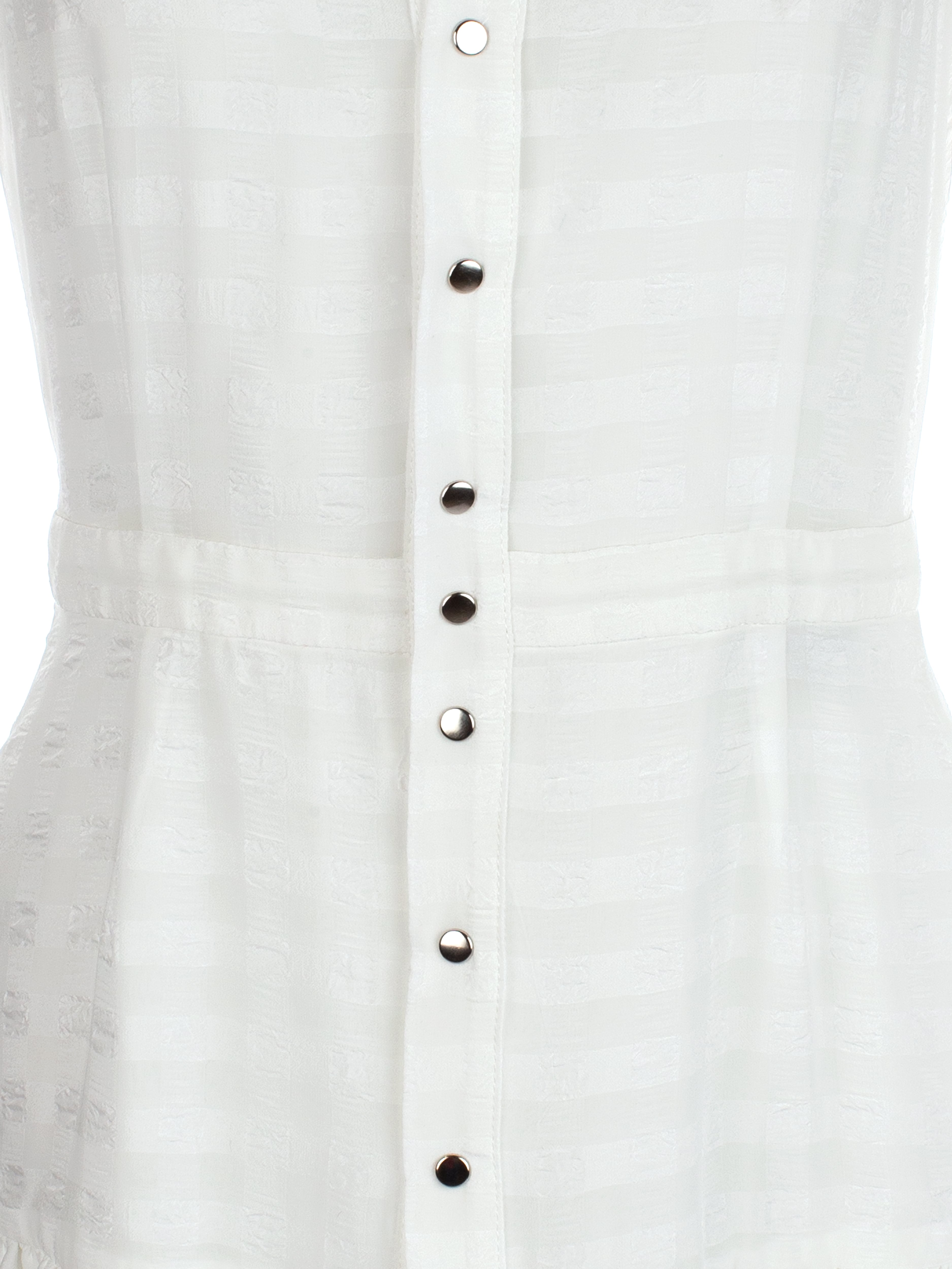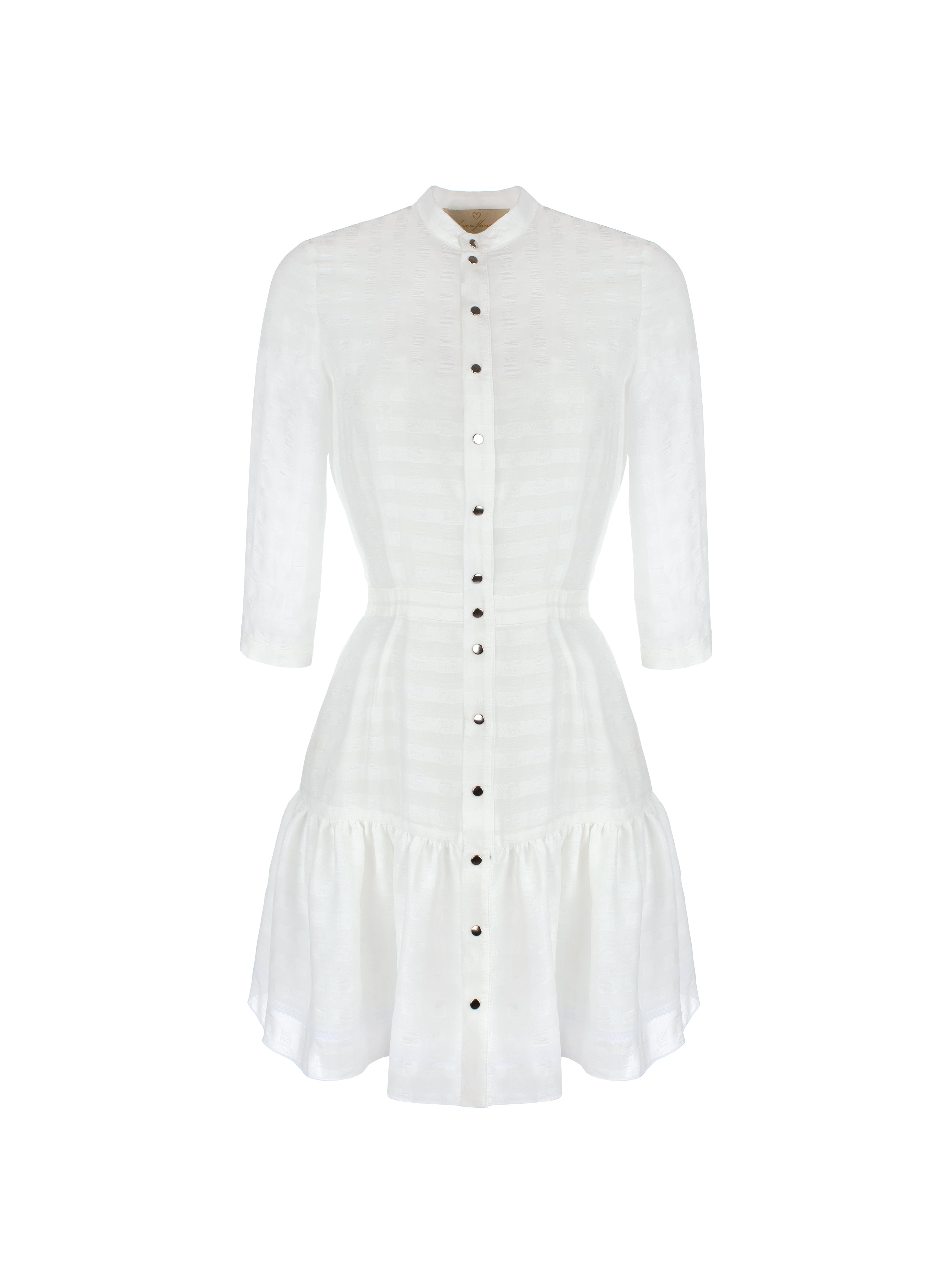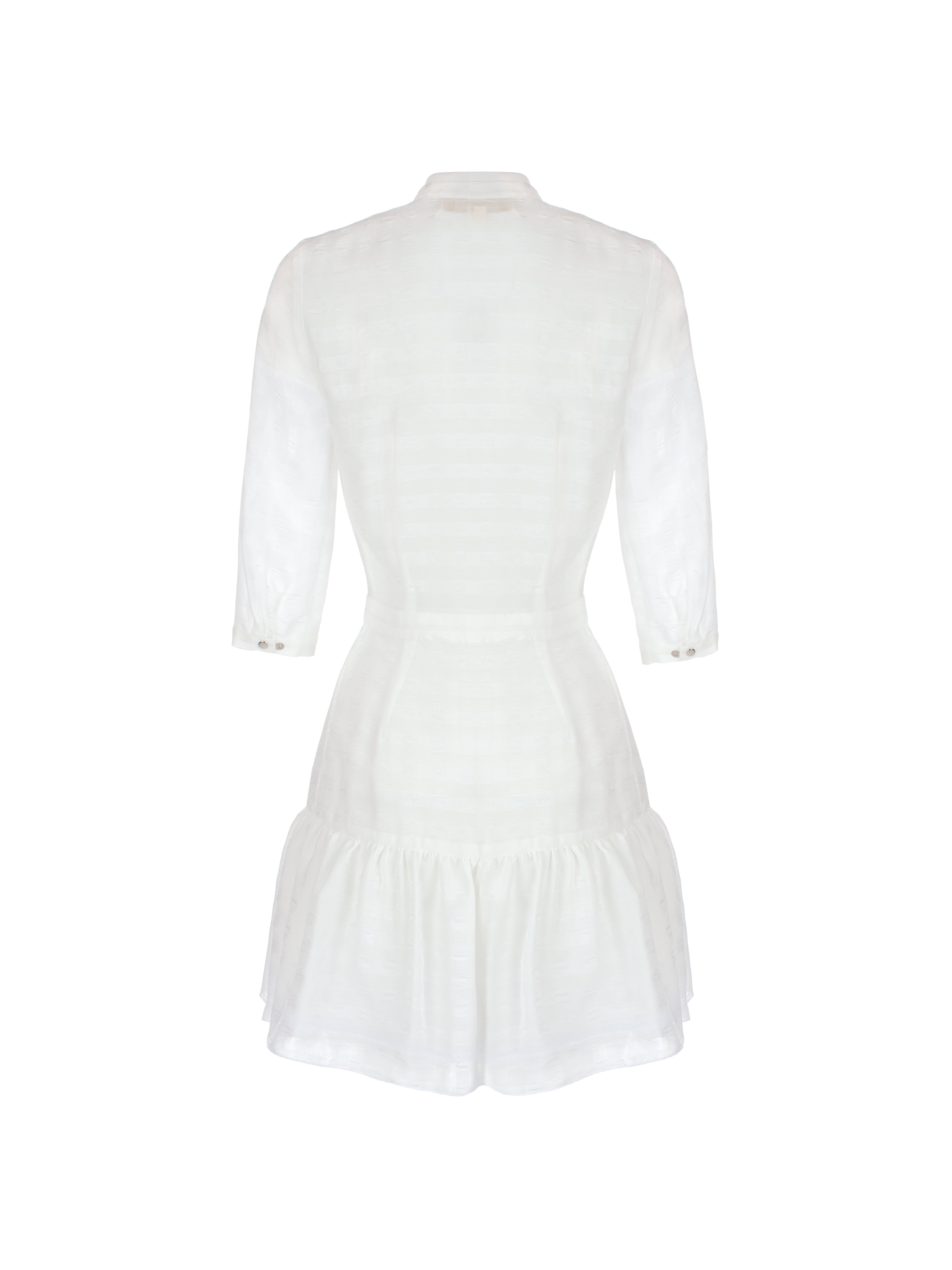 White mini dress made of lightweight checked chiffon. A stand-up collar, shortened 3/4 sleeves, a two-layer hem with one tier.