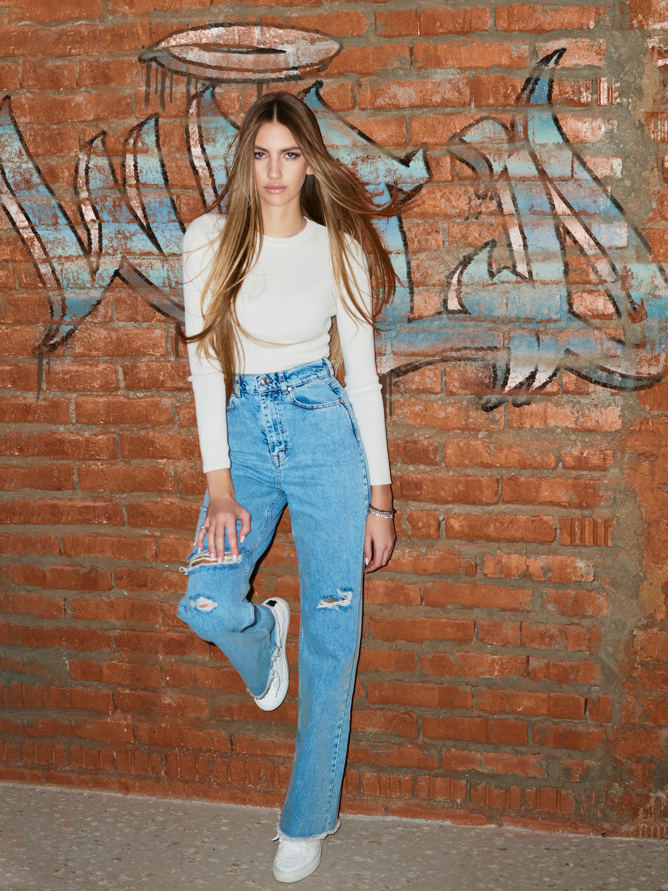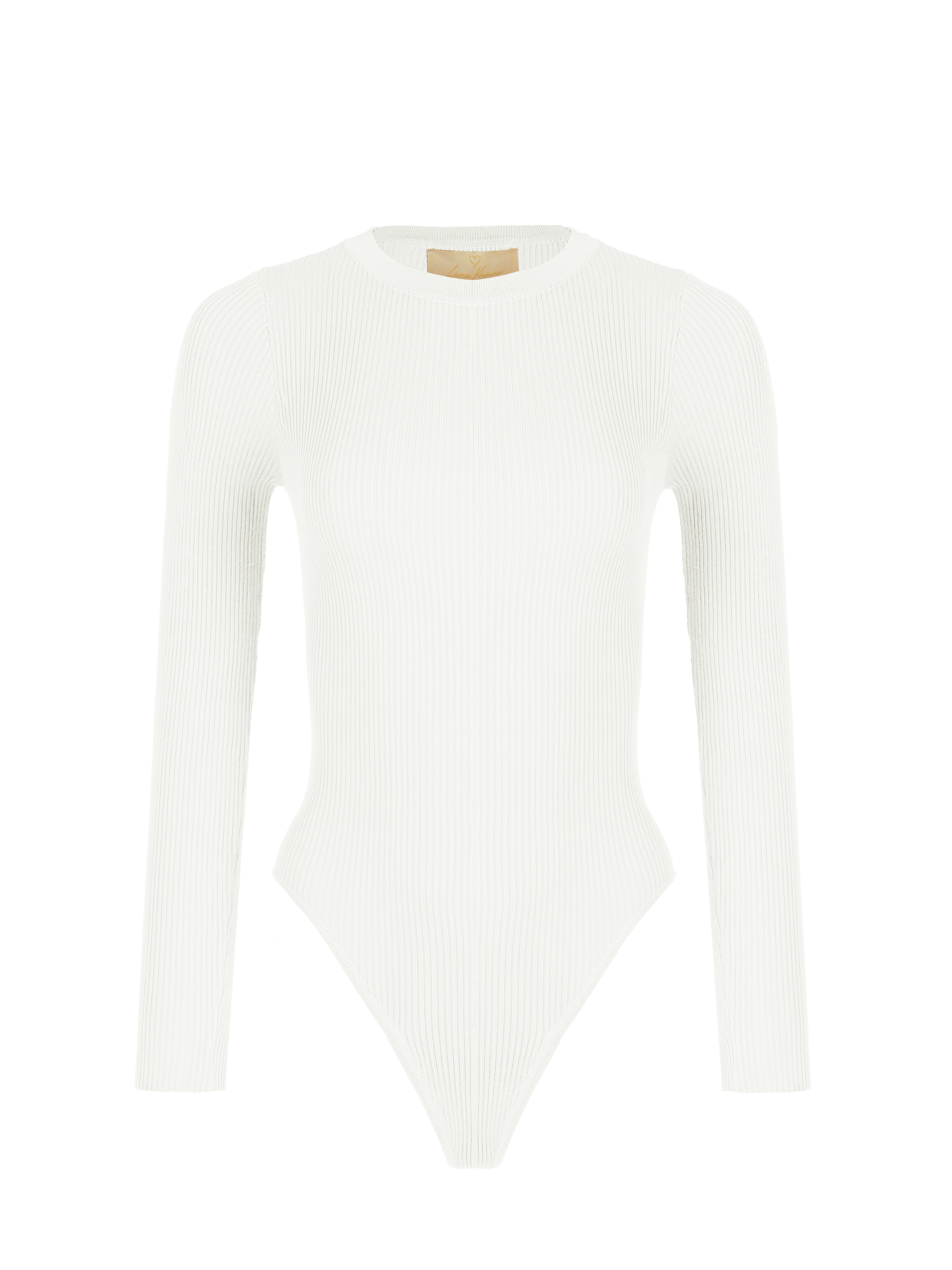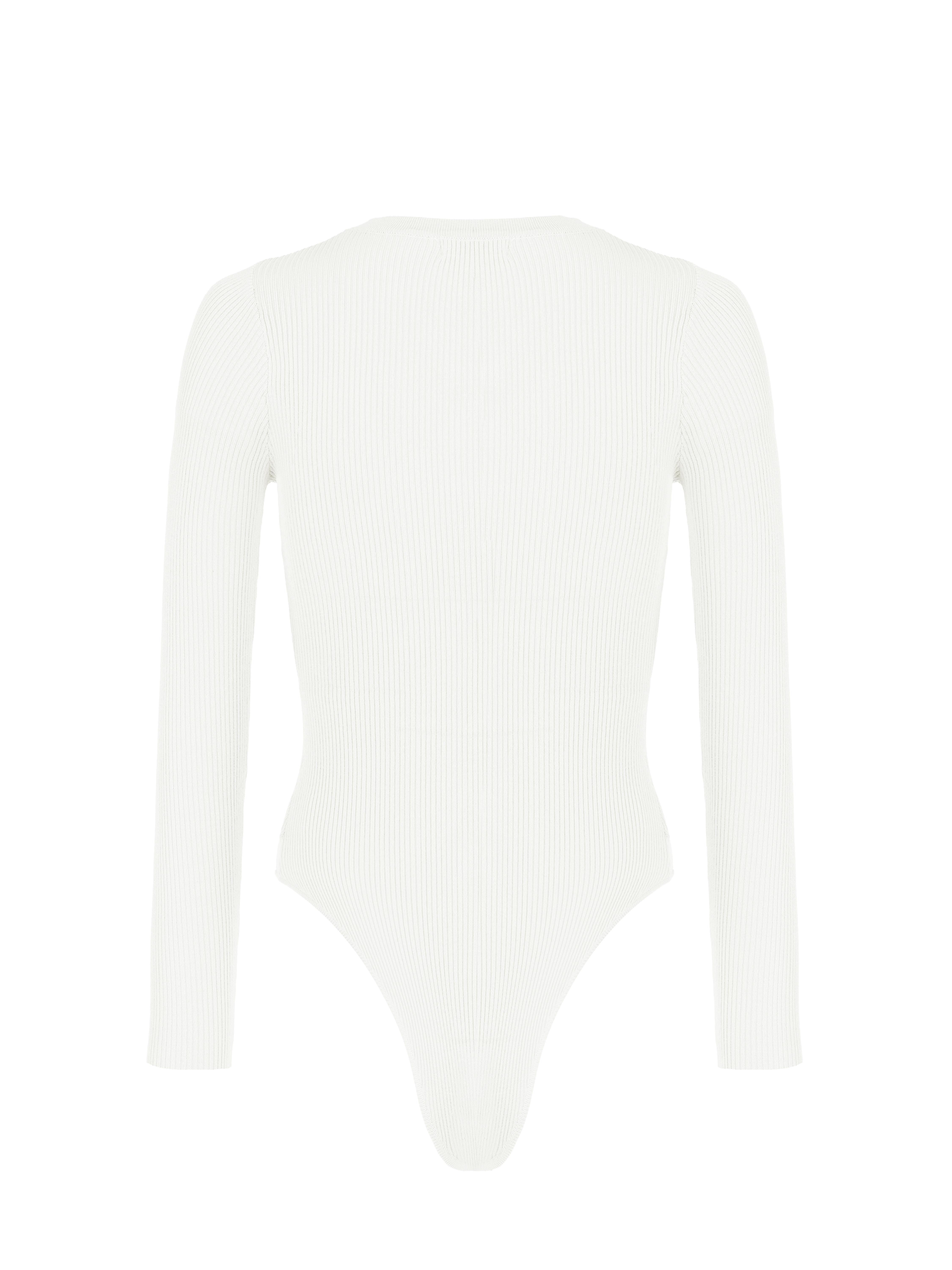 Ivory bodysuit with a crew neckline and long sleeves will work perfectly as a basic element both for an everyday look and for an office outfit. The model is made of finely ribbed knitted cotton jersey. The bodysuit fastens with snap buttons at the bottom.