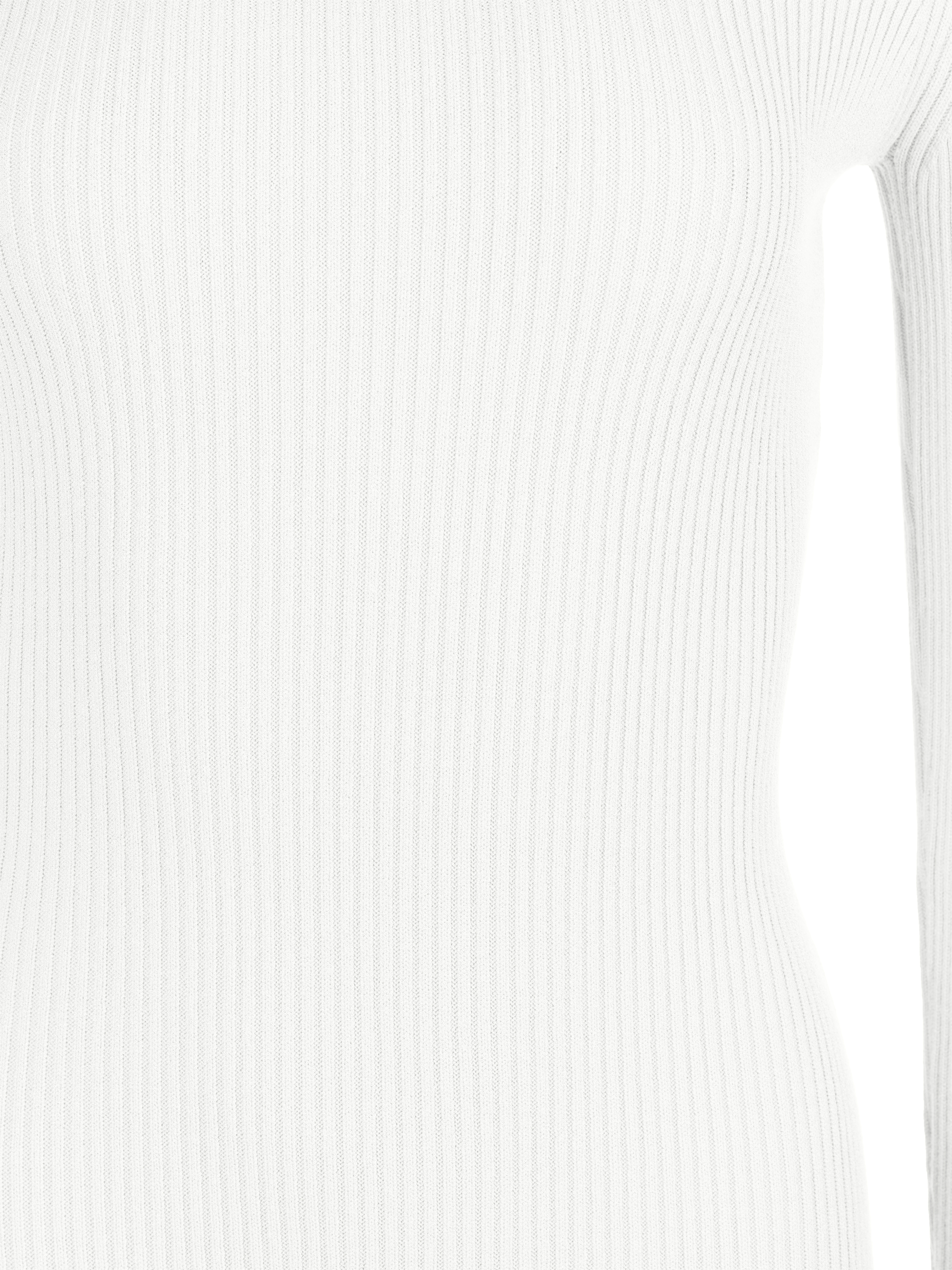 Maxi-length turtleneck dress made of white ribbed knit. The dress is complemented by a high slit on the hem.