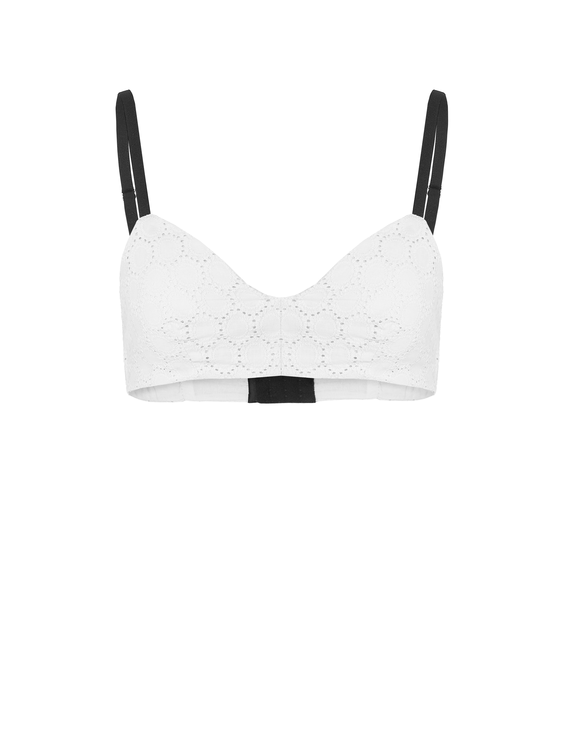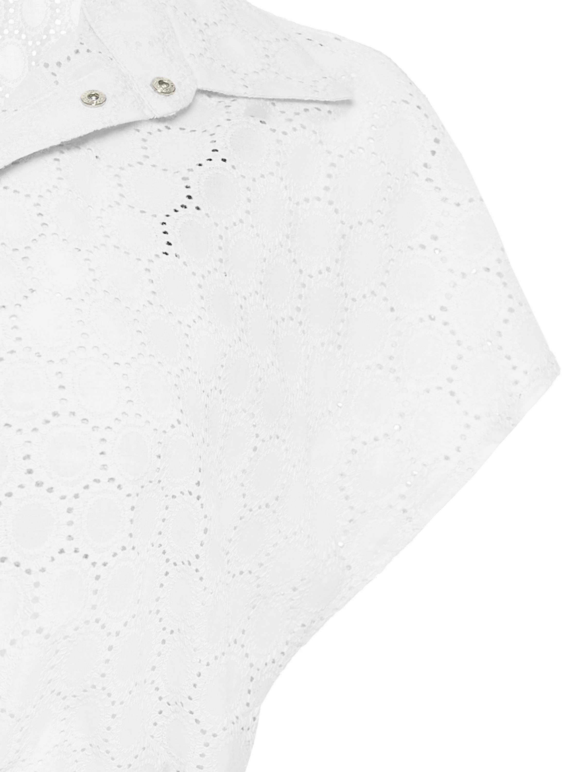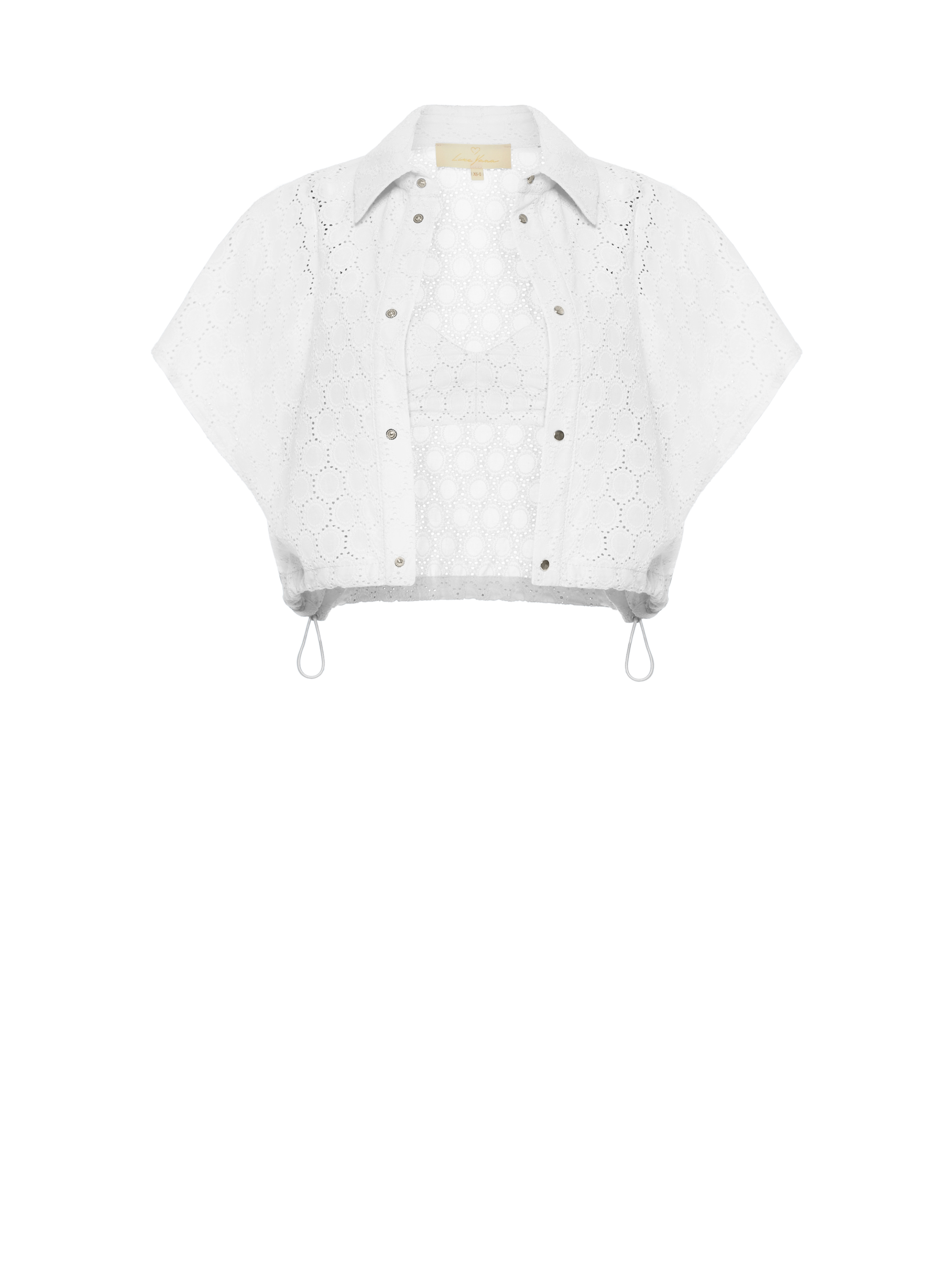 The set of a short-sleeved shirt with a drawstring hem and a bra top with straps is made of white cotton lace. Wear with high-waisted skirts made of the same material.