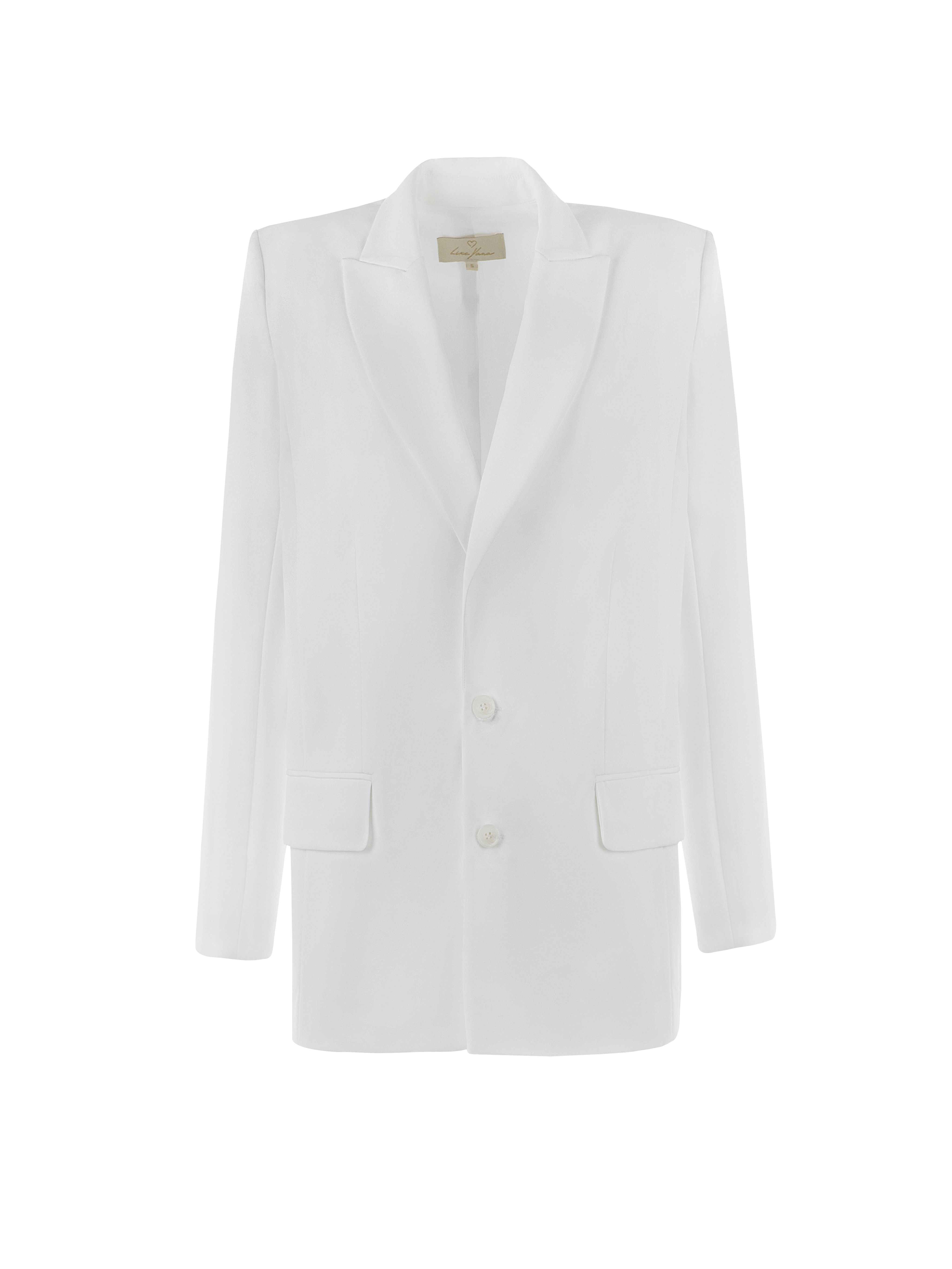 An elongated single-breasted white blazer with two tone-on-tone buttons. Classic lapels, straight cut, side flap pockets, back vent.