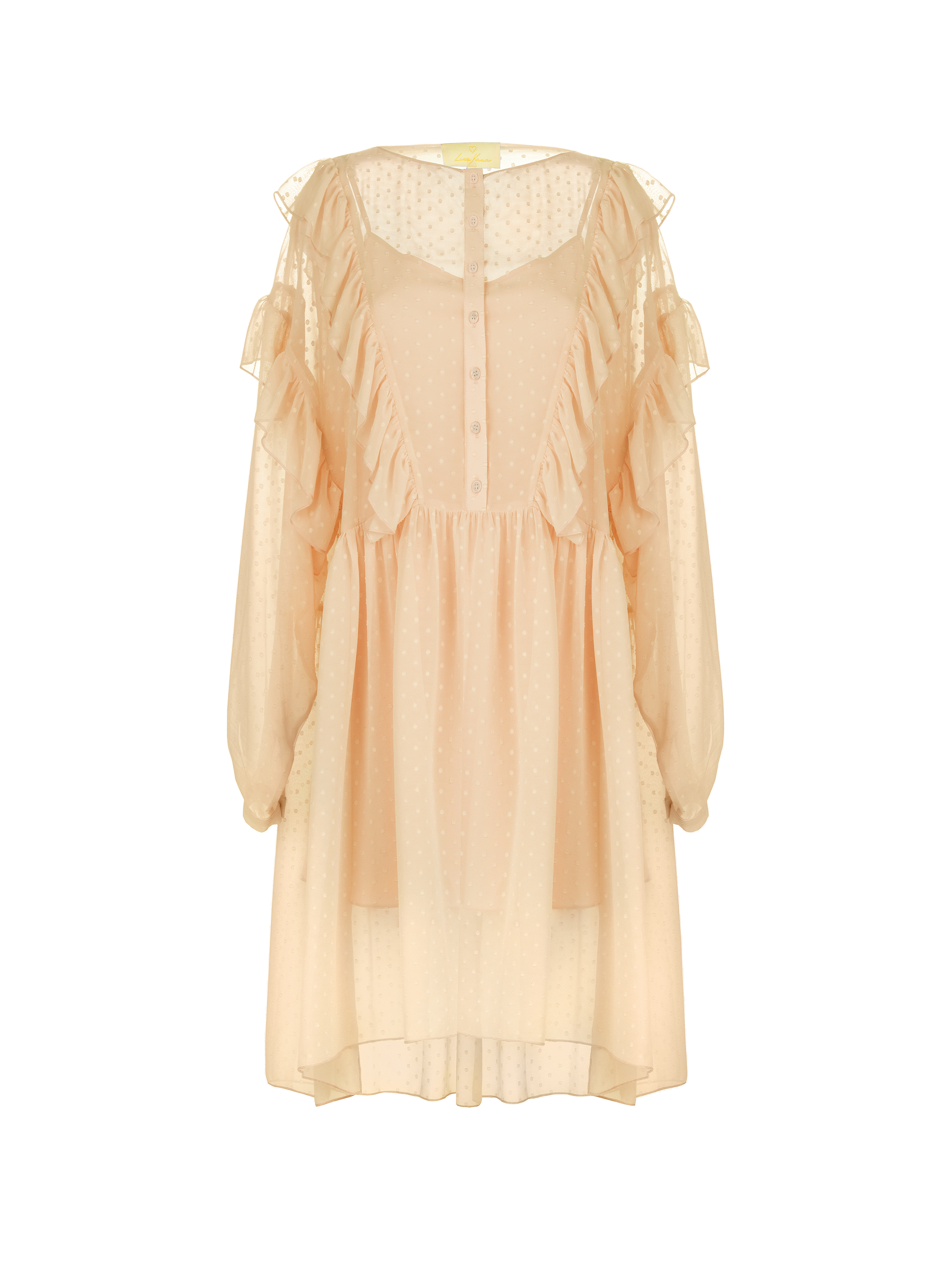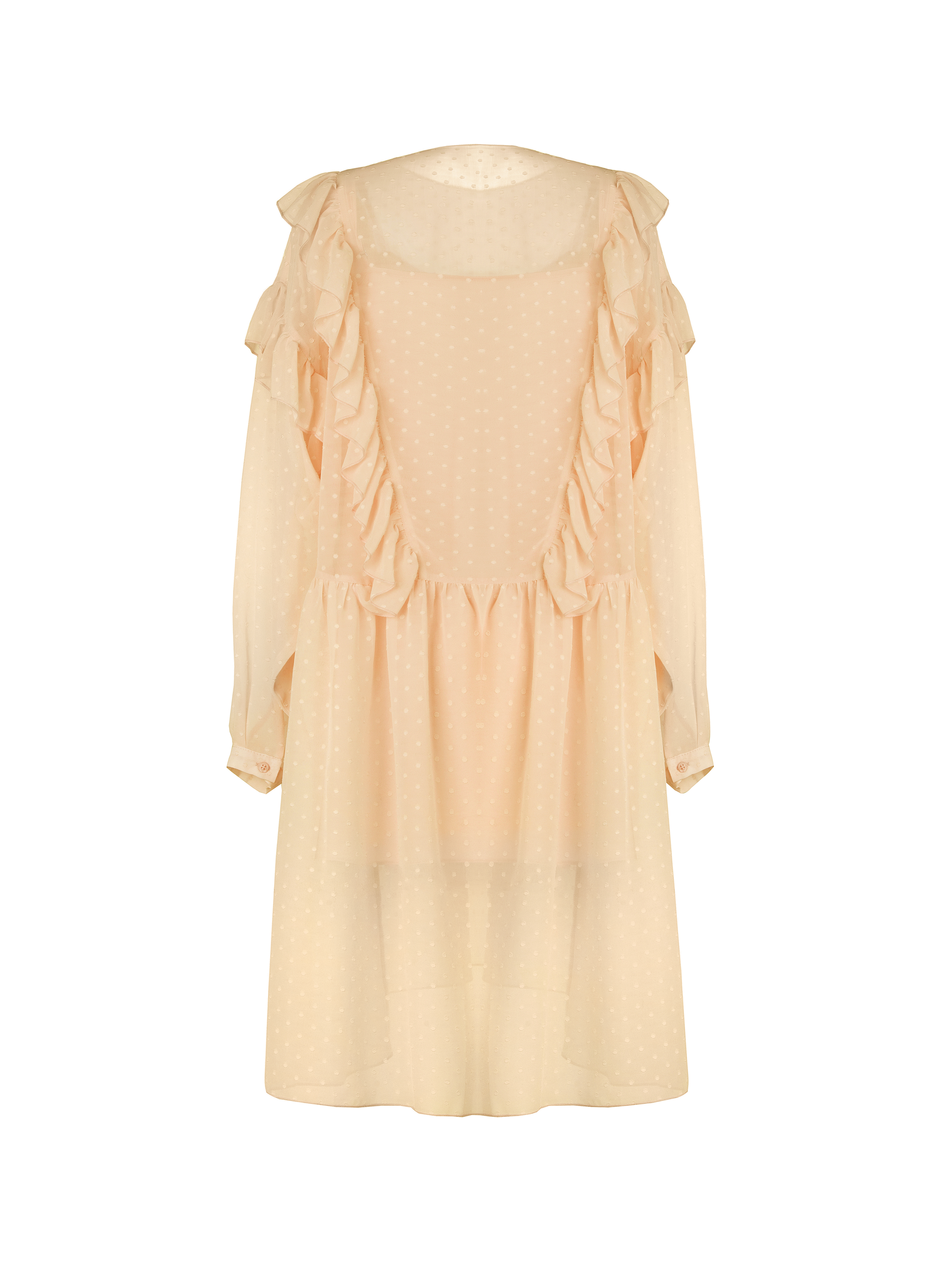 A peach chiffon dress with a textured polka dot pattern. Mini length, long sleeves, loose fit with ruffles and button placket.