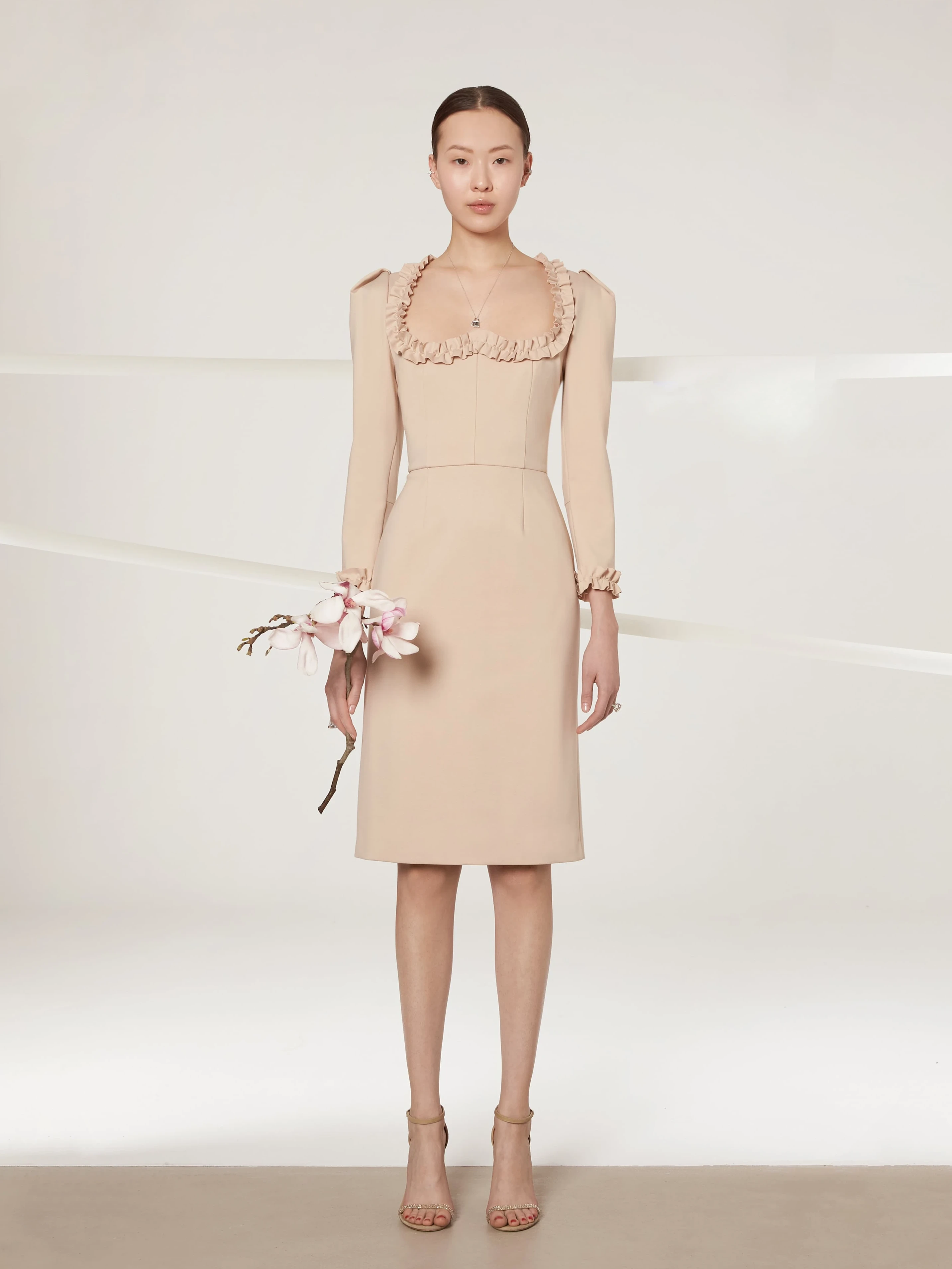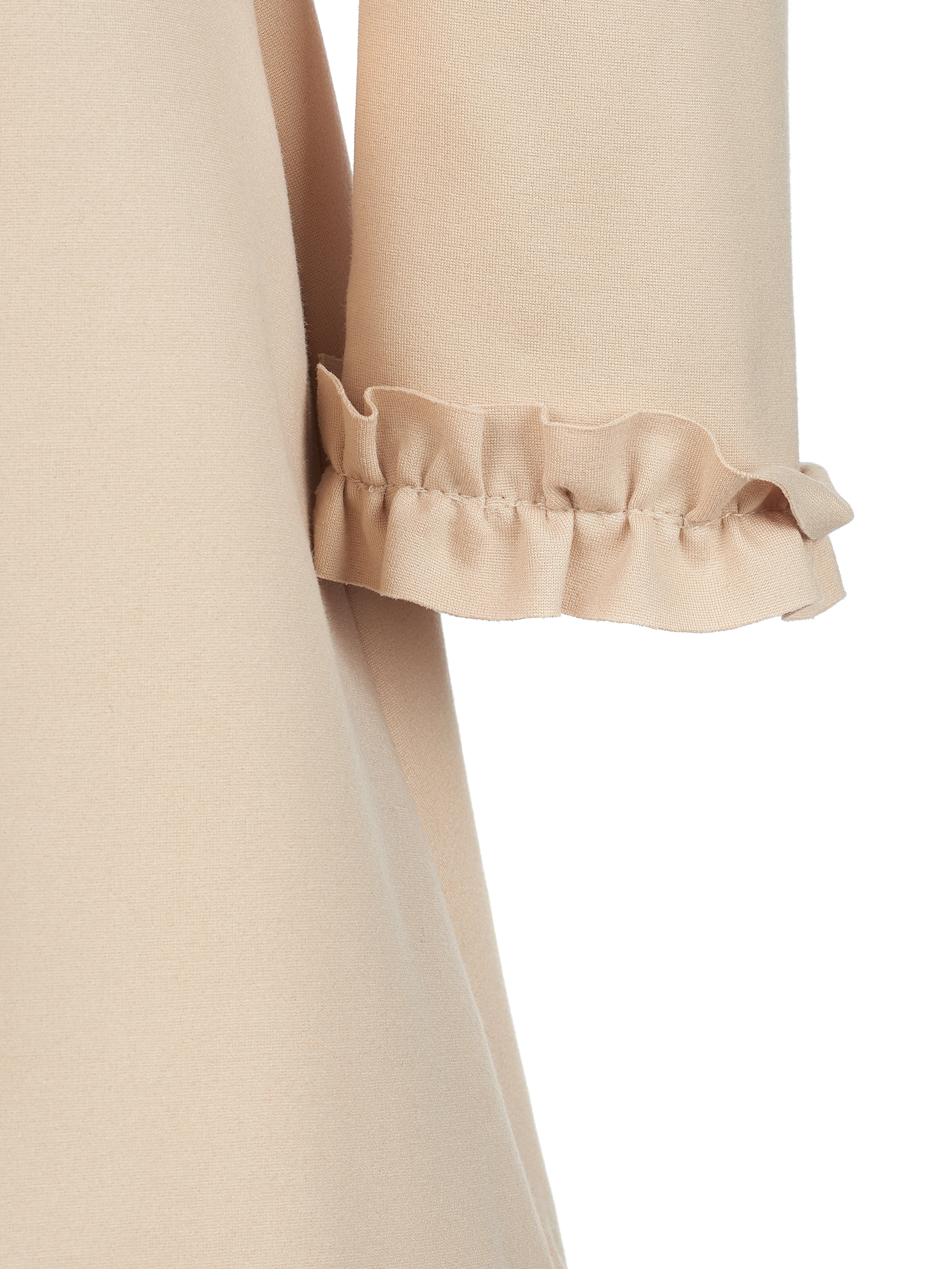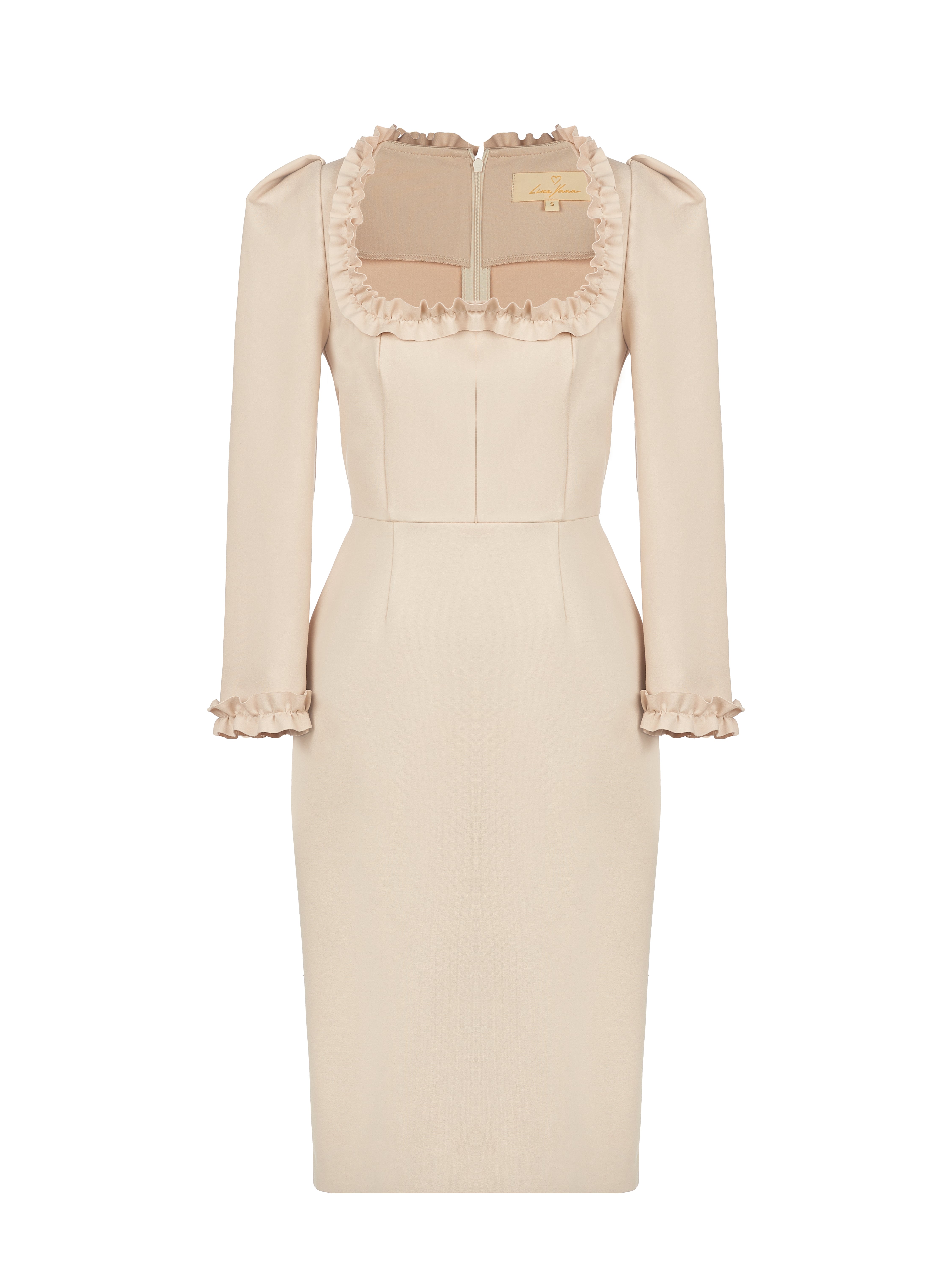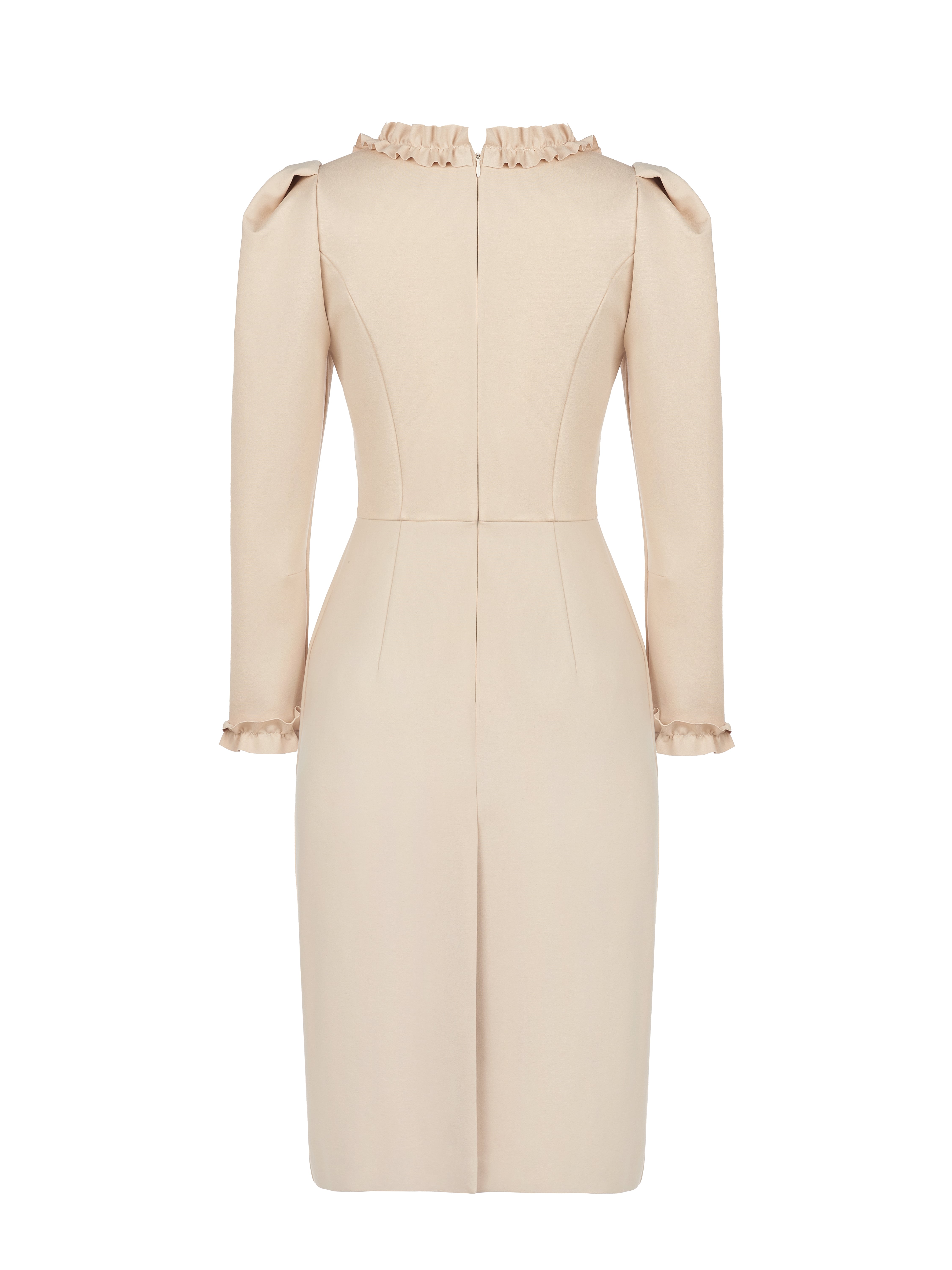 The beige midi dress is made of dense jersey. This material maintains crisp lines and holds the shape set by the cut. The shaped neckline of the model and the sleeves are decorated with ruffles. The dress fastens with a back zipper.