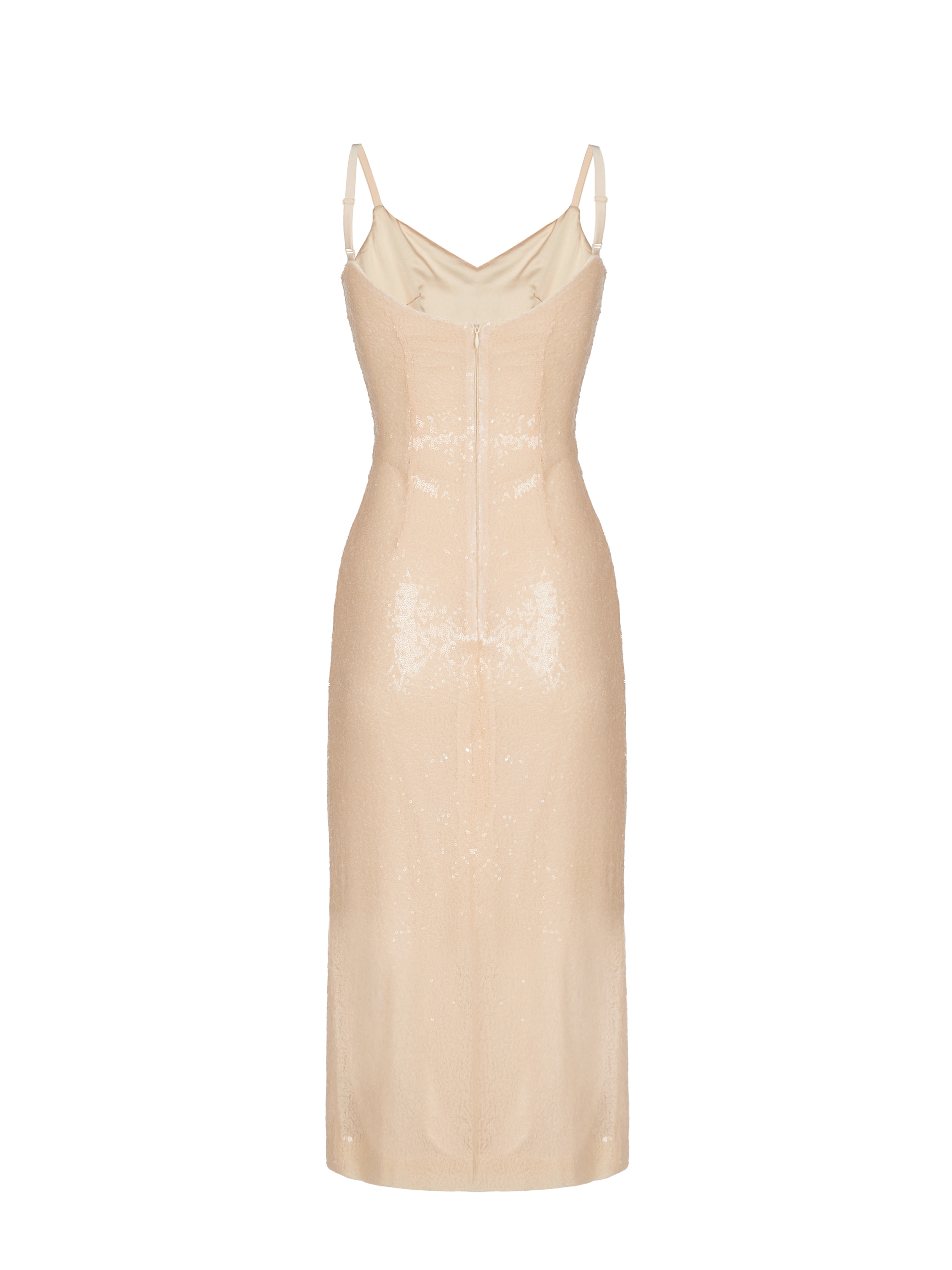 The beige midi dress with thin straps is made of viscose. A mesh embroidered with shimmering sequins creates the effect of a piece woven from precious stones. Front slit and back zip fastening. The fit can be easily adjusted with sliders on the slim straps.