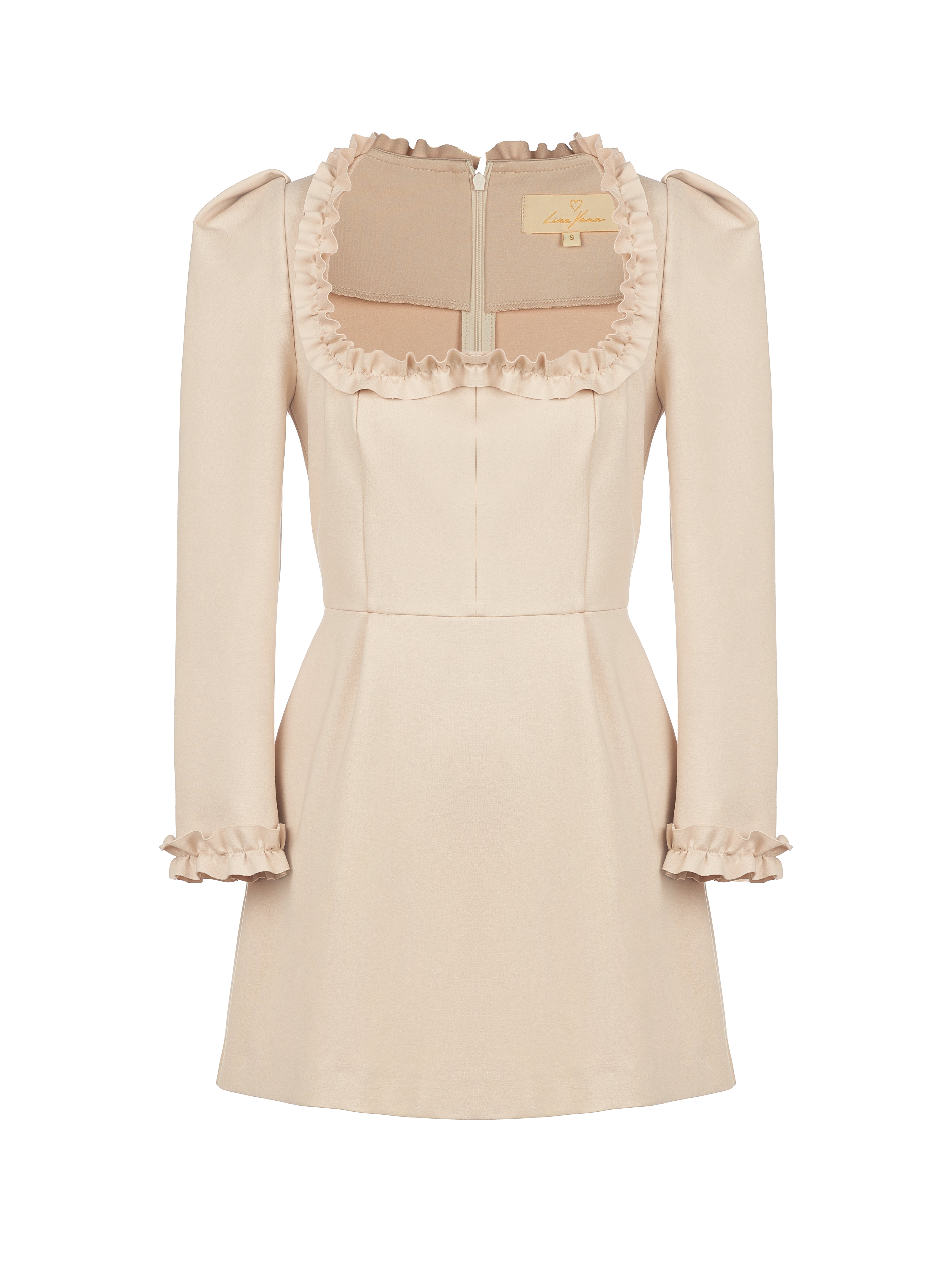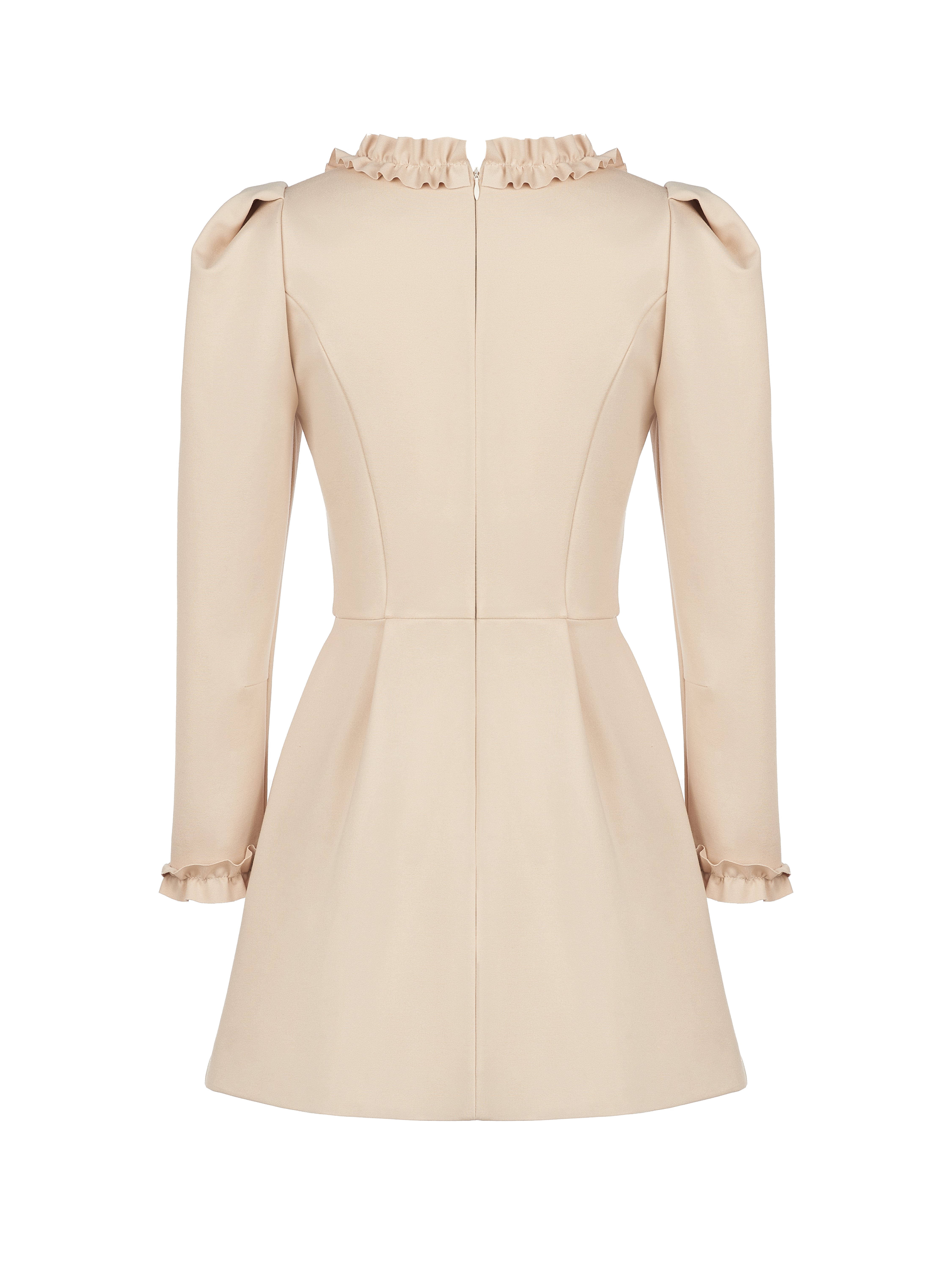 The beige mini dress is made of dense jersey. This material keeps sharp lines and holds the silhouette set by the cut. The shaped neckline and sleeves are decorated with ruffles. The dress fastens with a zipper at the back.