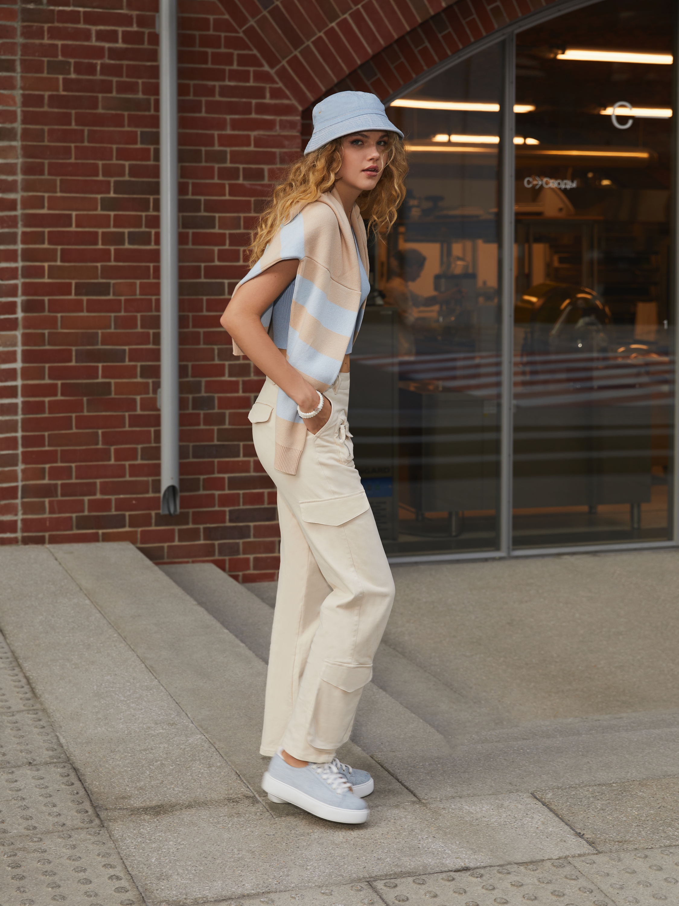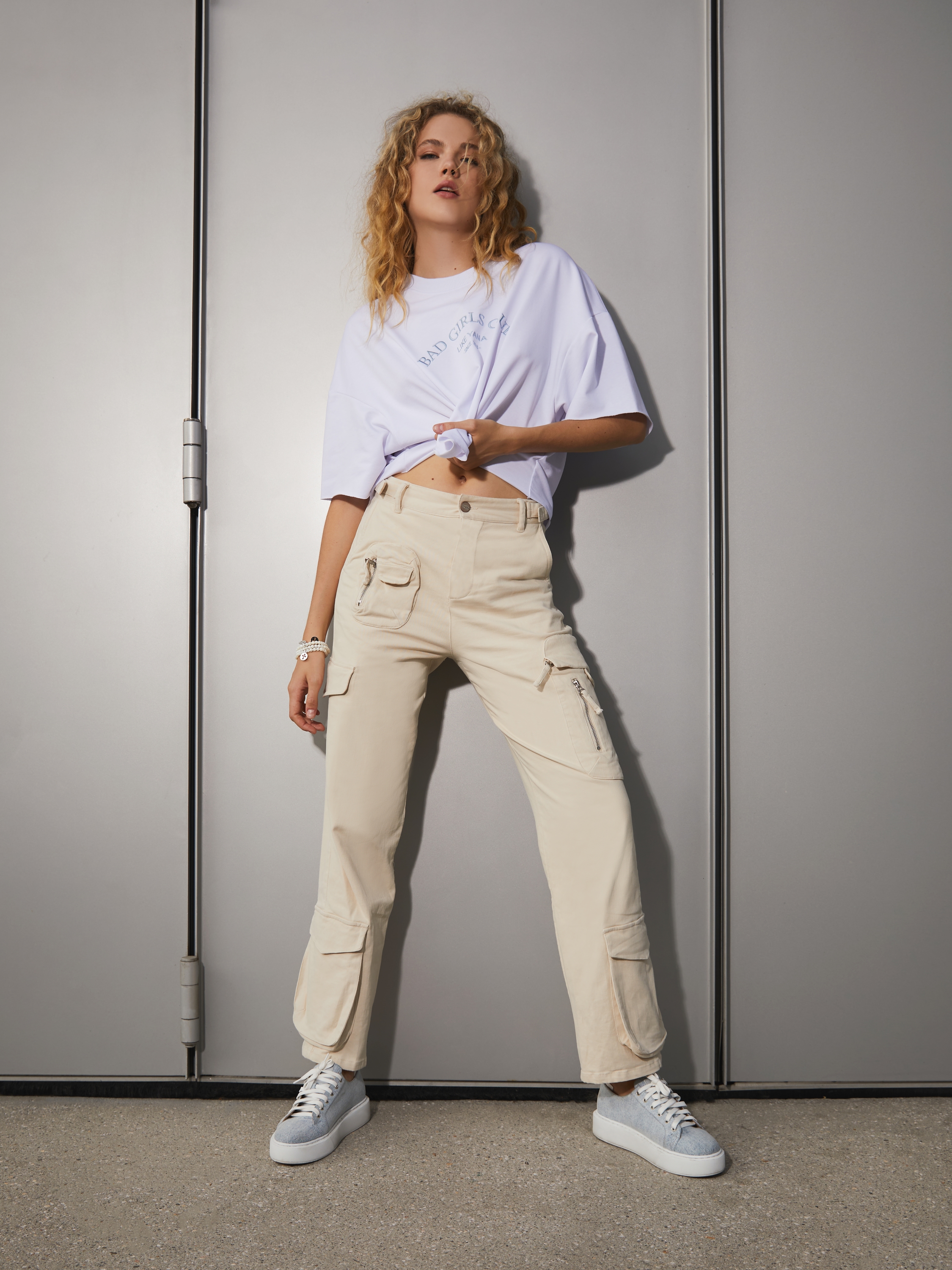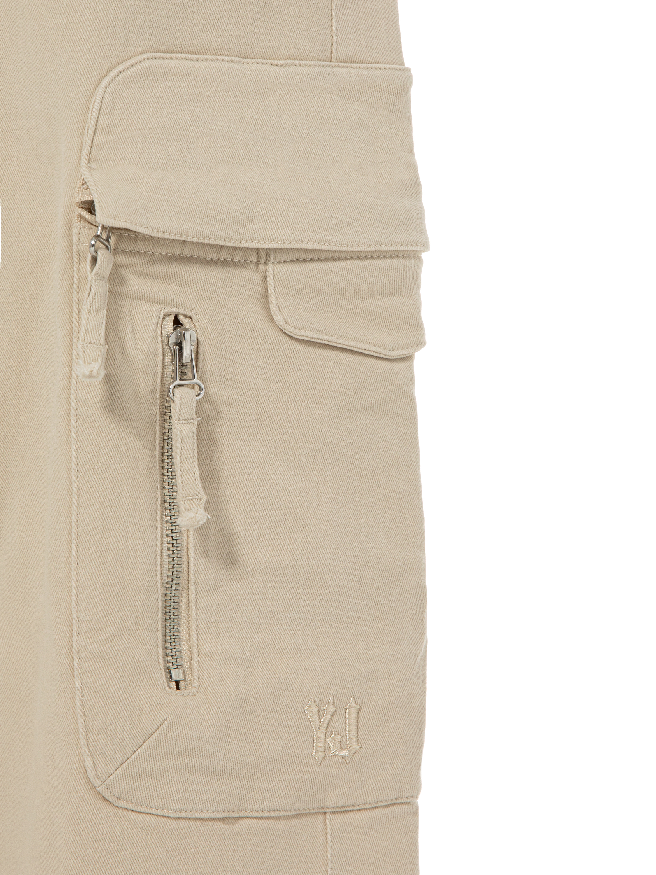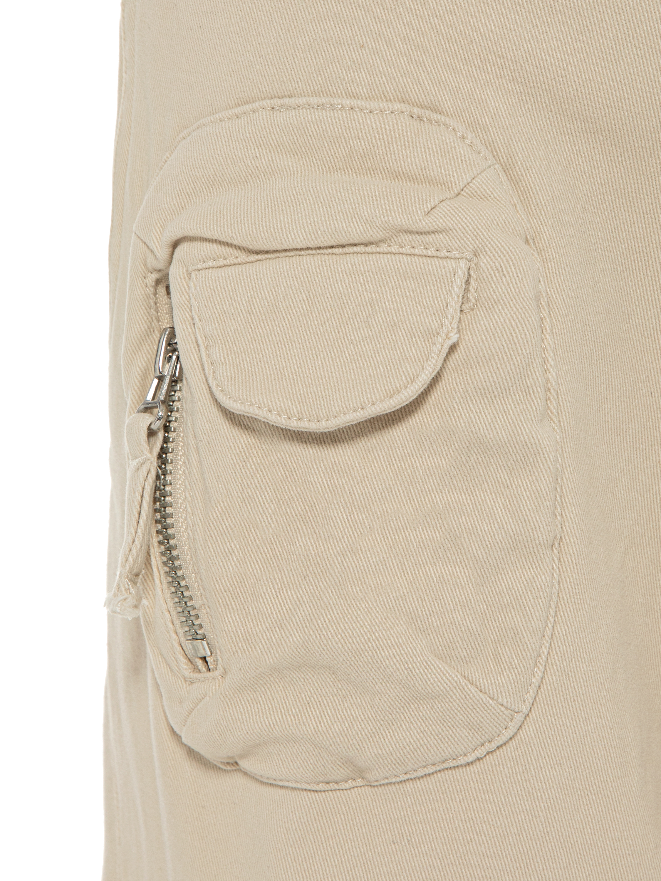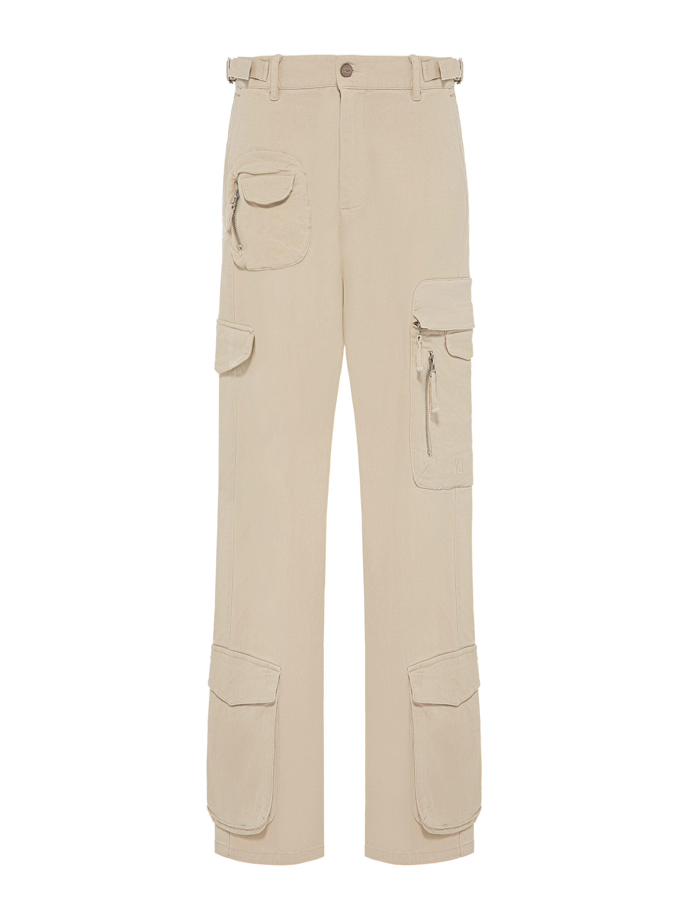 Wide cargo trousers made of beige cotton. The high-waisted model with patch pockets with flaps and zippers is complemented by size adjusters at the waist.