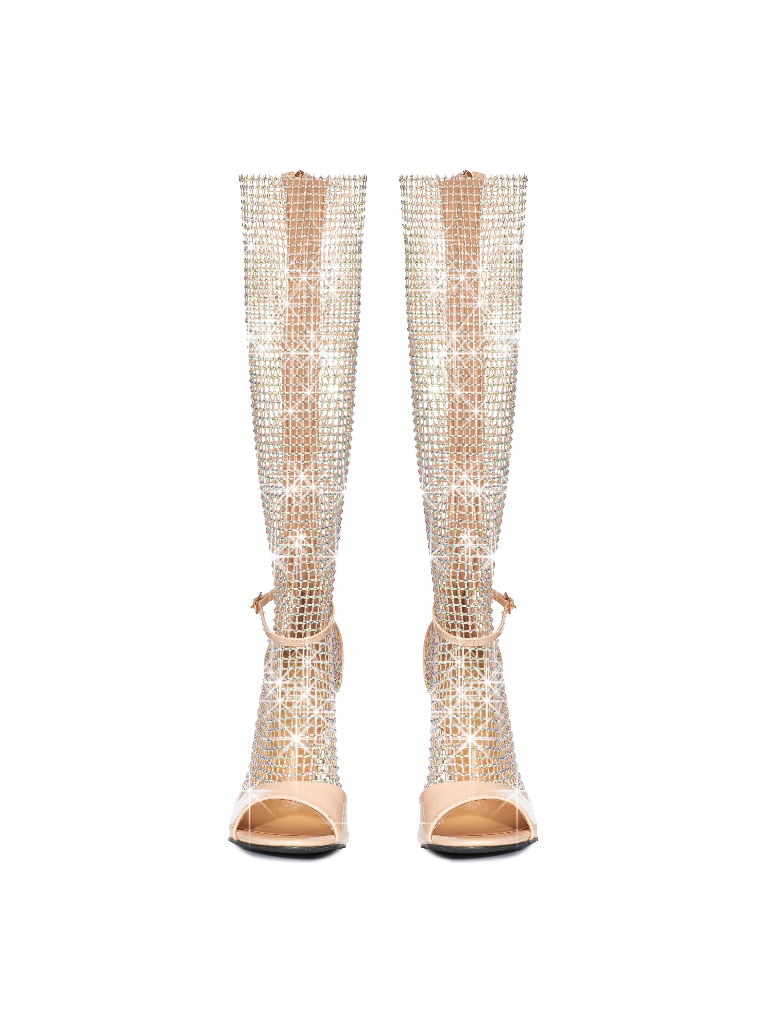 Beige Knee High Mesh Rhinestone Heels