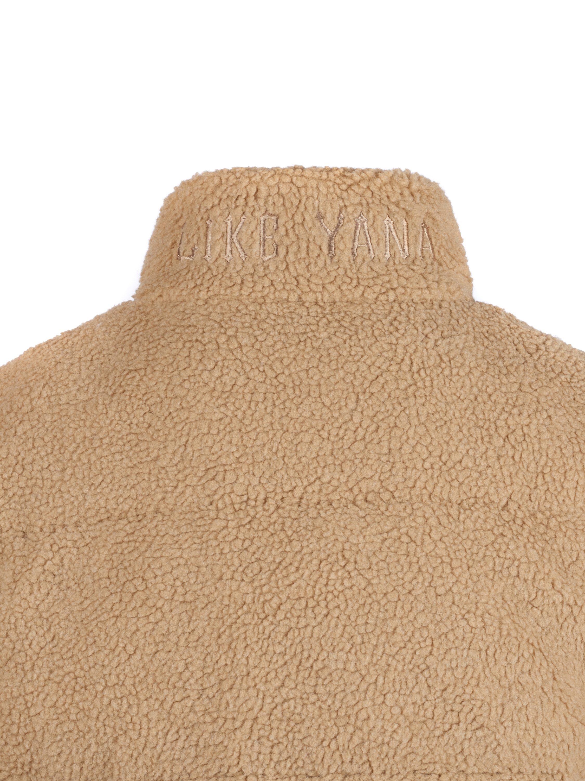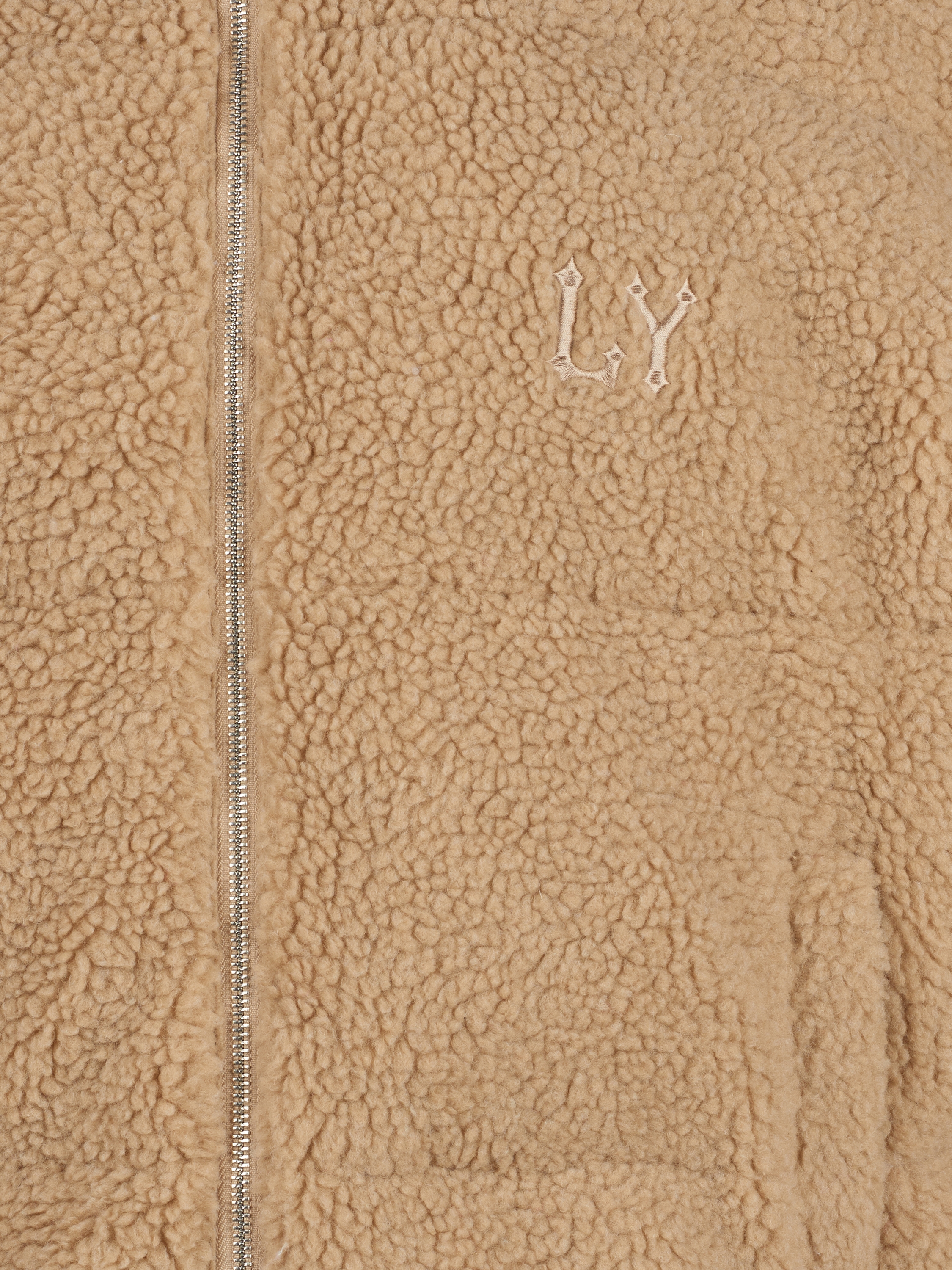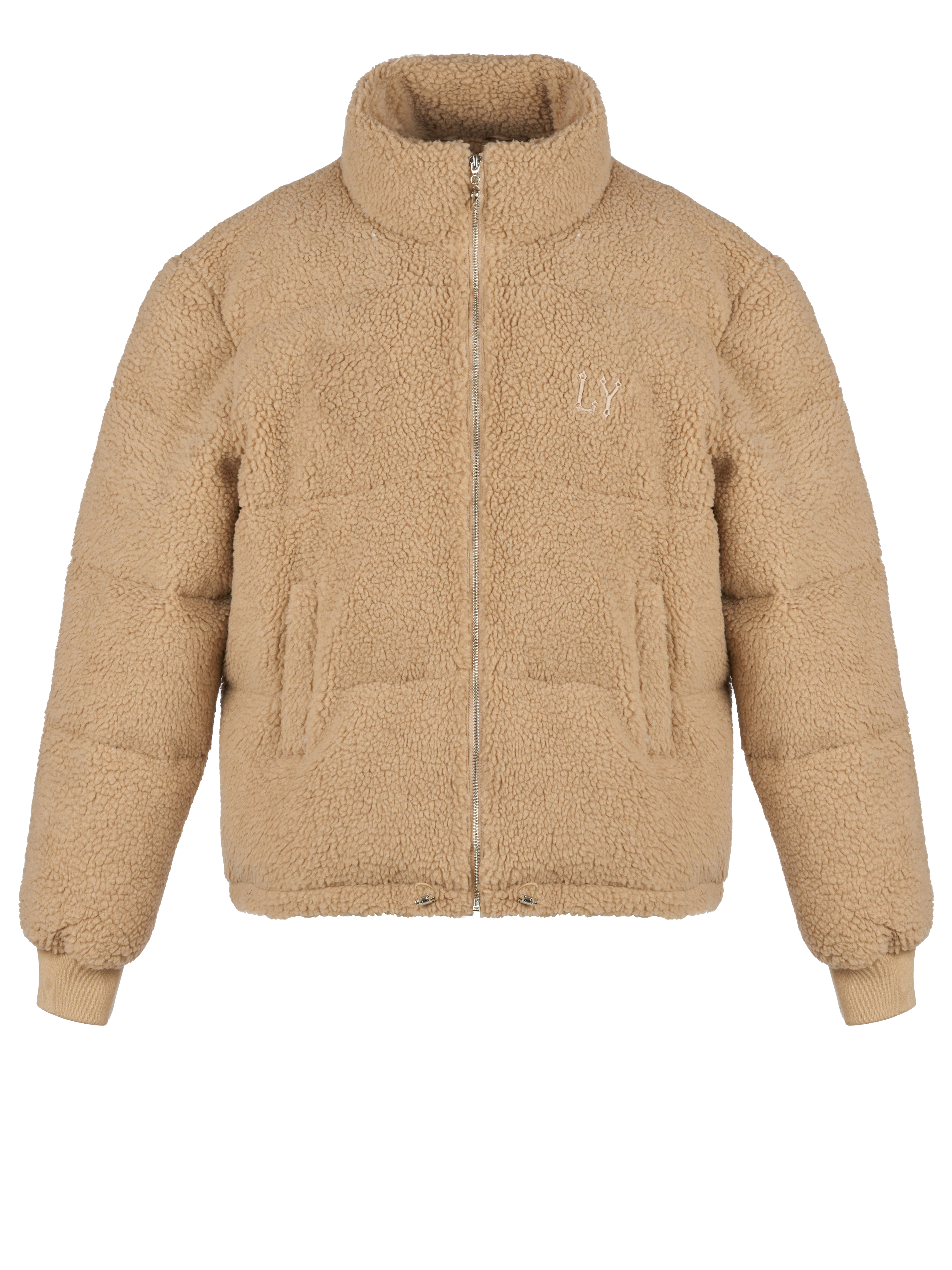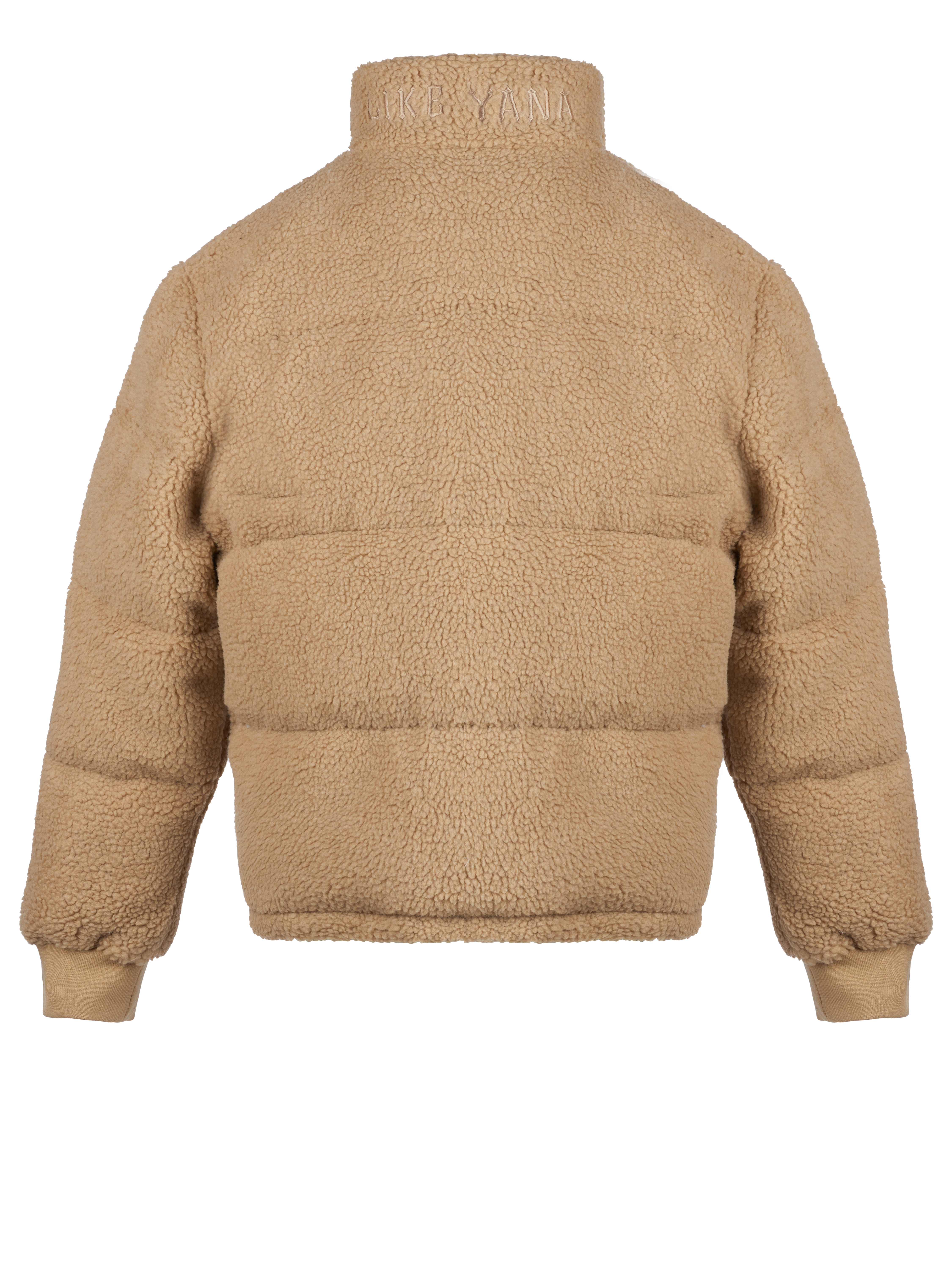 A short beige zip-up down jacket is made of eco teddy fur and complemented by branded embroidery on the chest and collar. As insulation, high‑quality synthetic down with a density of 420 g/m2 is used, which, combined with the outer layer of eco fur, allows you to wear the jacket at temperatures down to –30 degrees.