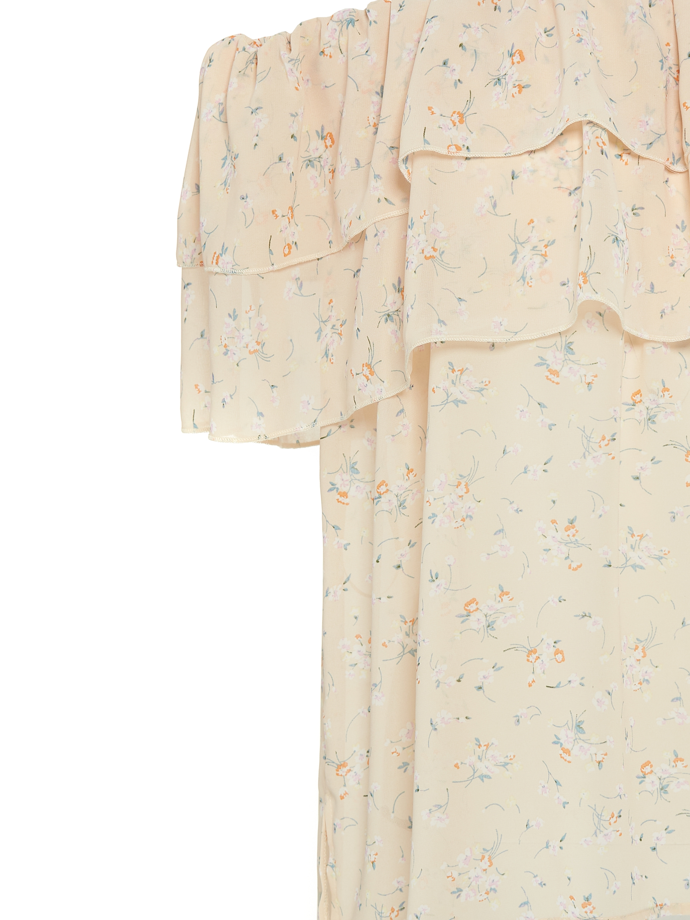 A beige off-the-shoulder top with ruffles will accentuate delicate collarbones. The model is made of lightweight chiffon with a floral print.