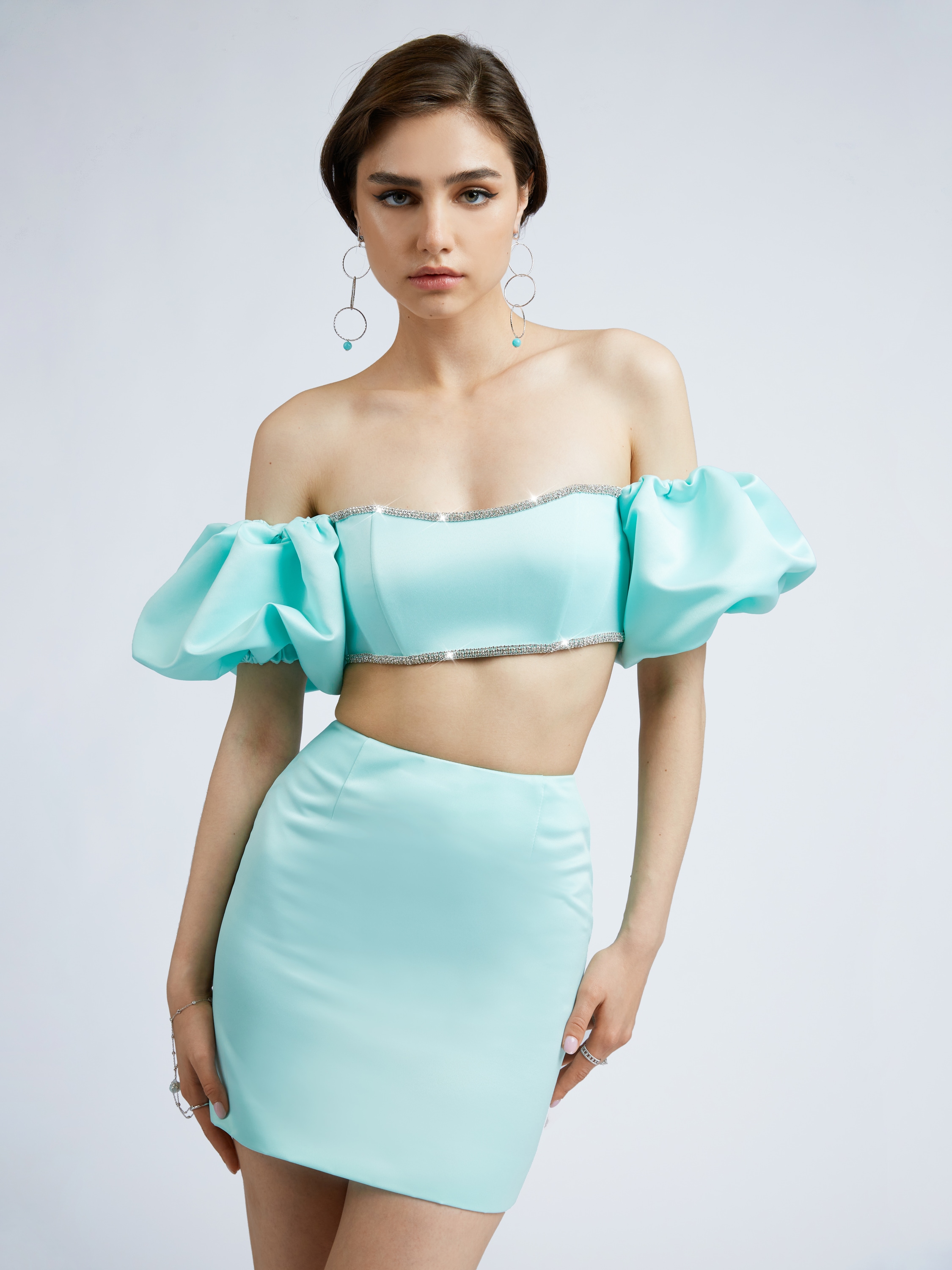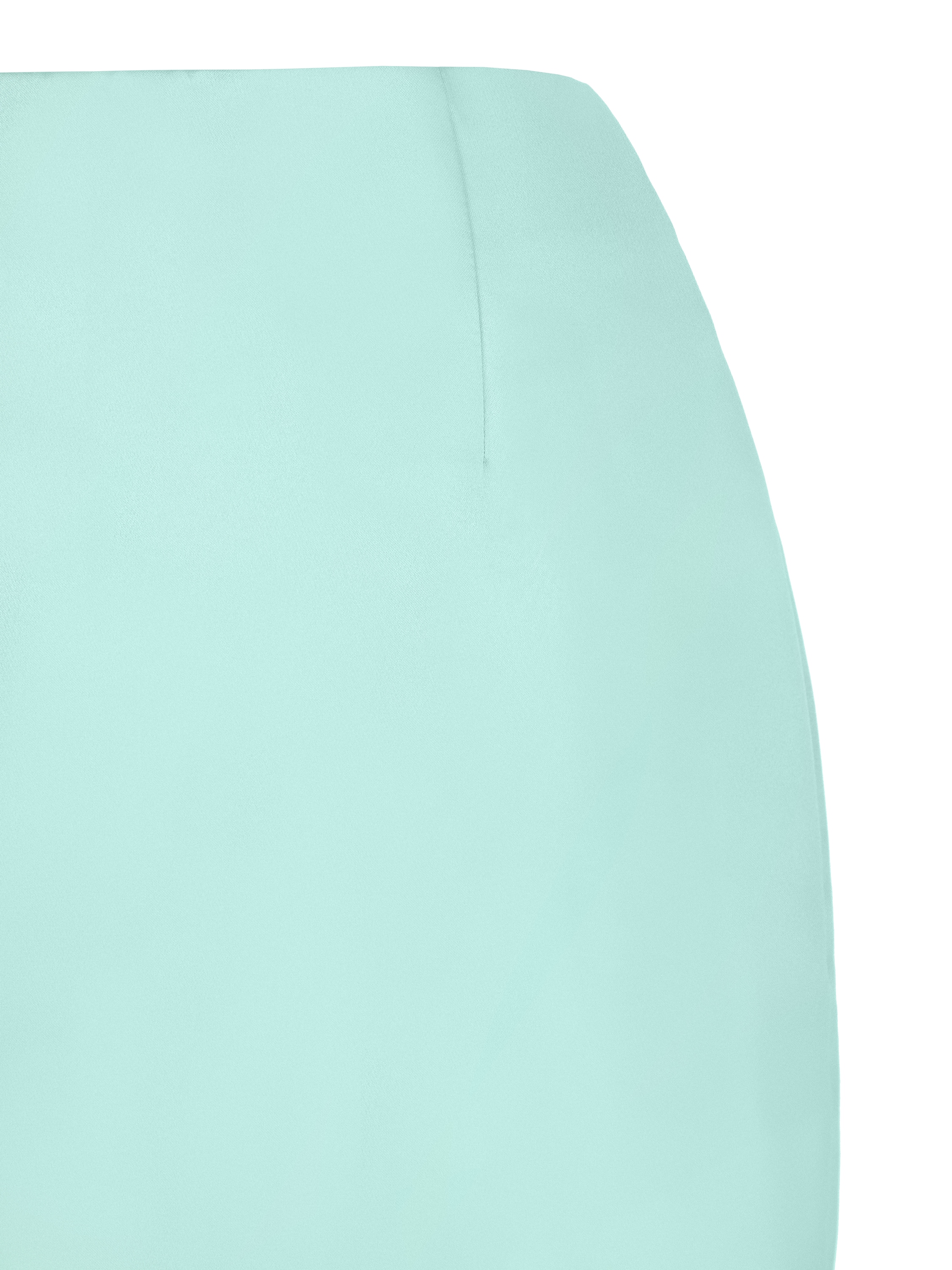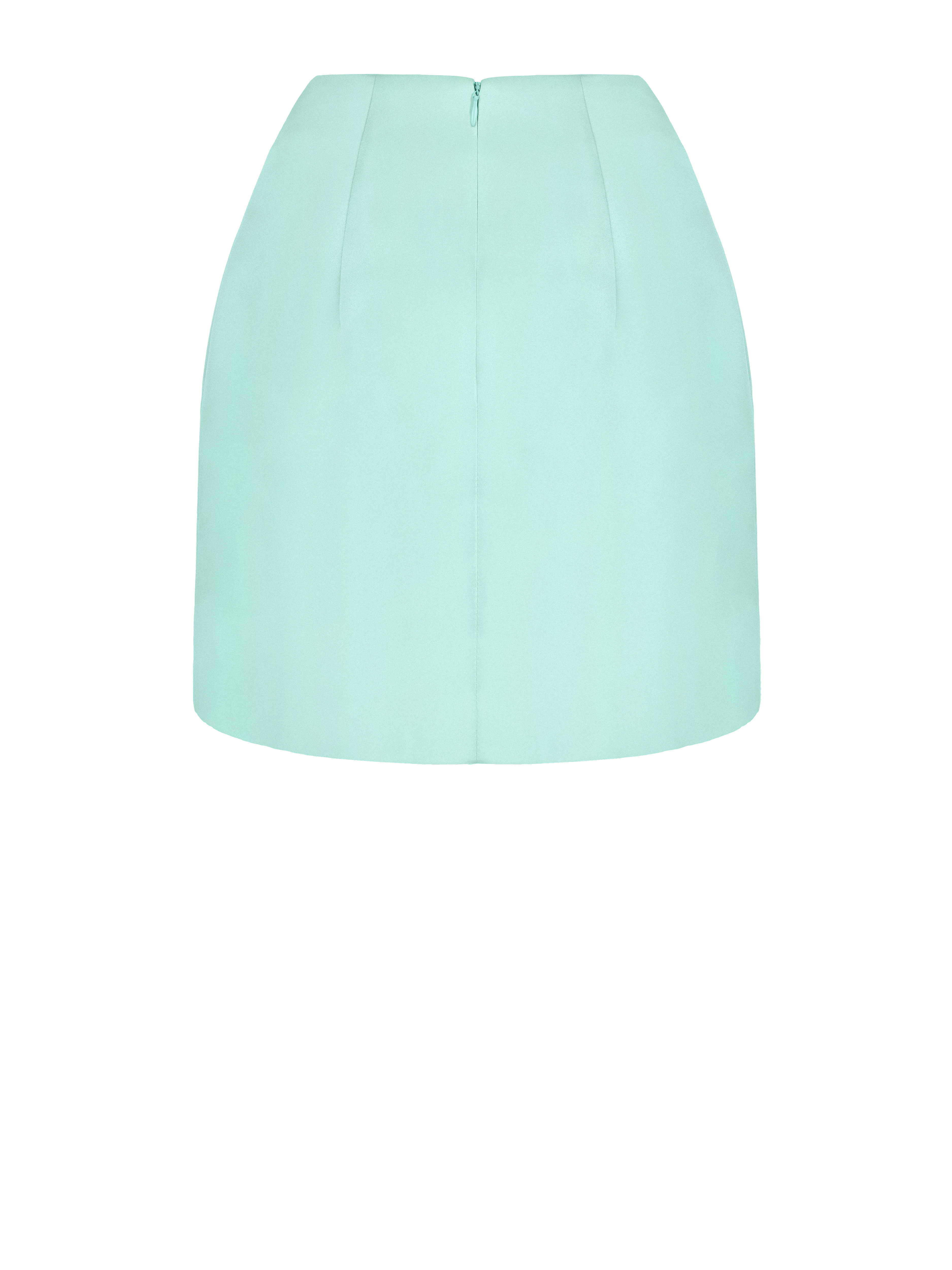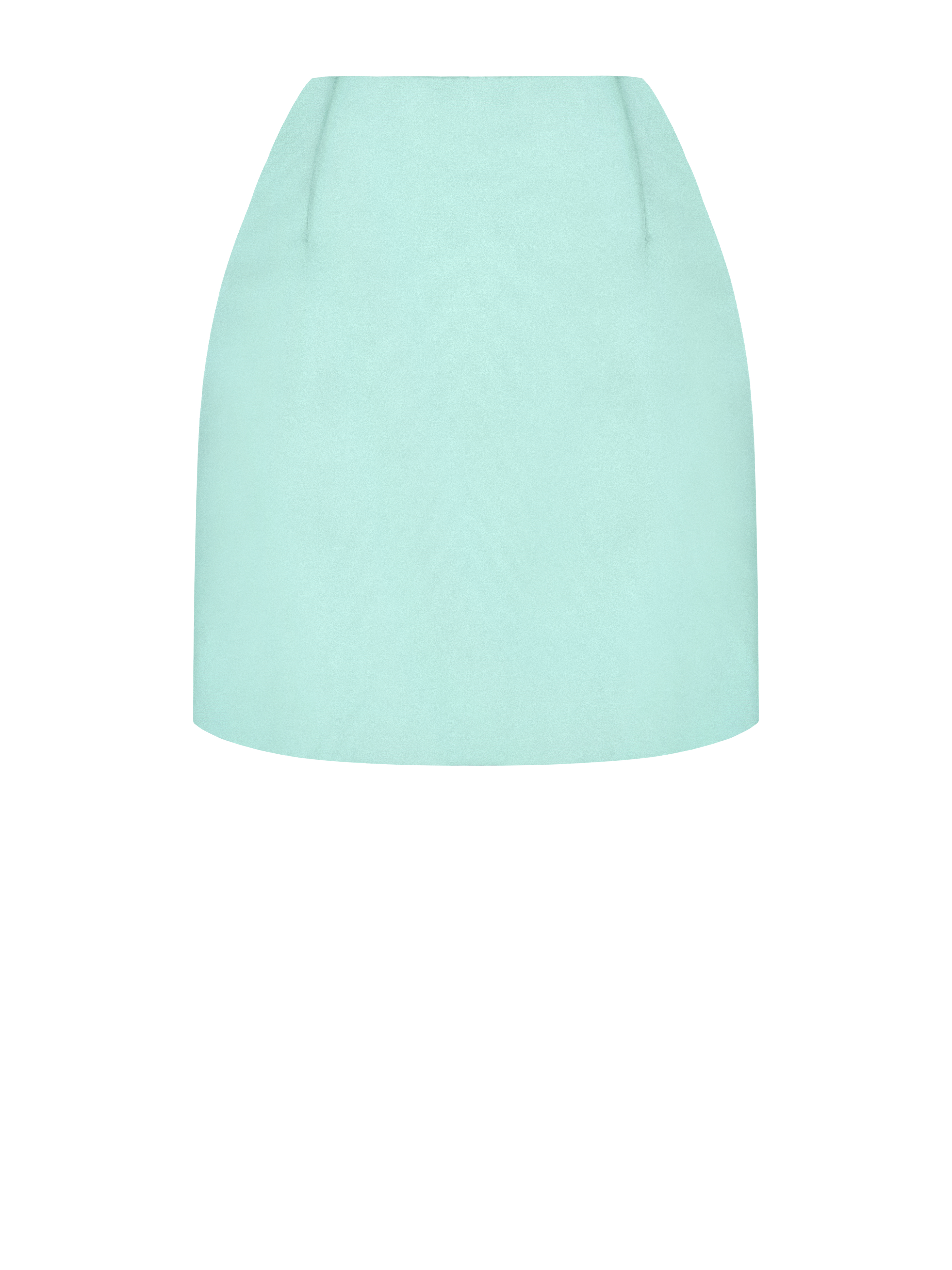 The straight-cut turquoise mini skirt is made of smooth silk satin and complemented with a concealed back zip fastening.