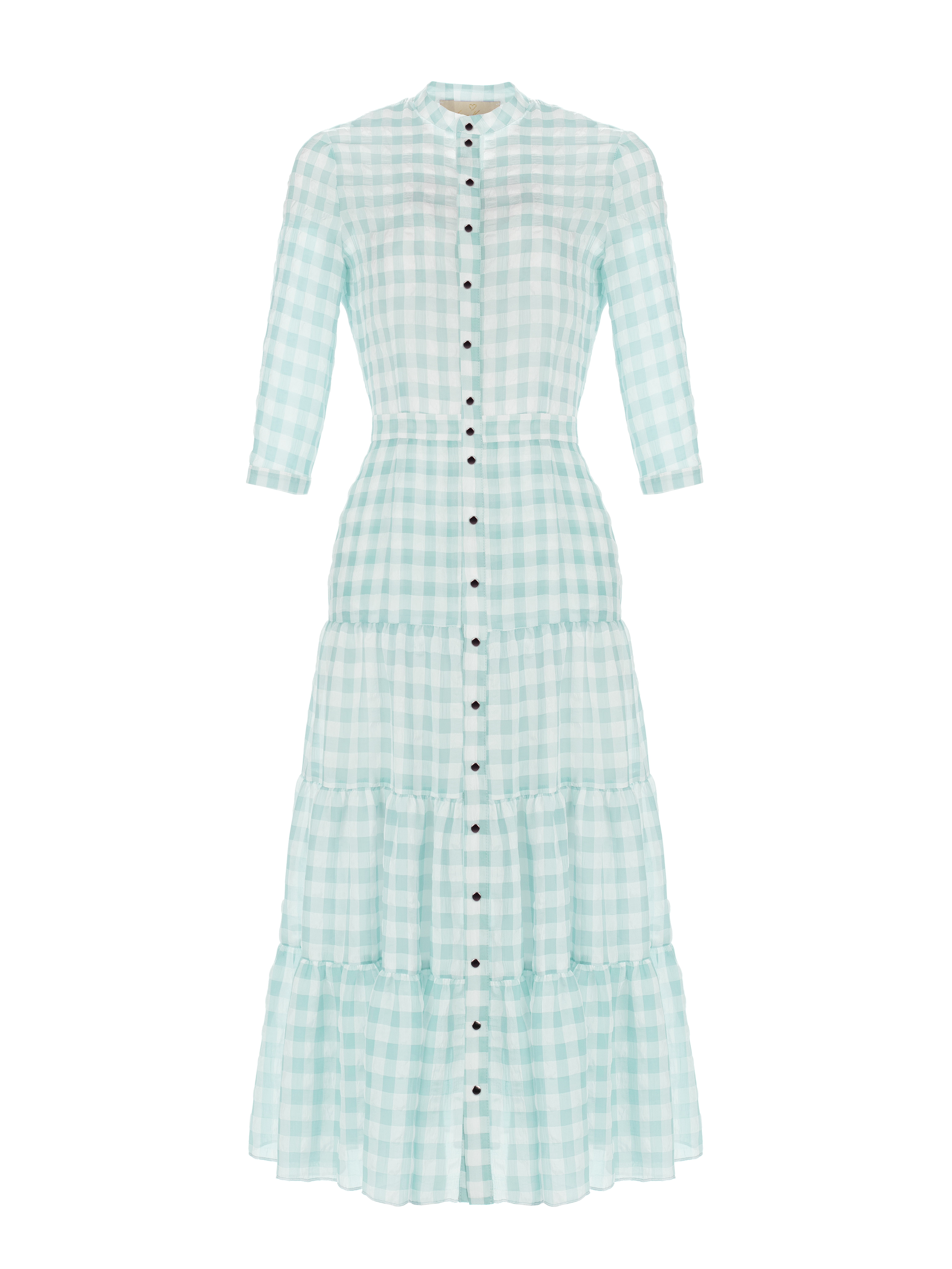 Midi dress is made of lightweight turquoise and white checked chiffon. A stand-up collar, shortened 3/4 sleeves, two-layer and 3-tier flared hem.