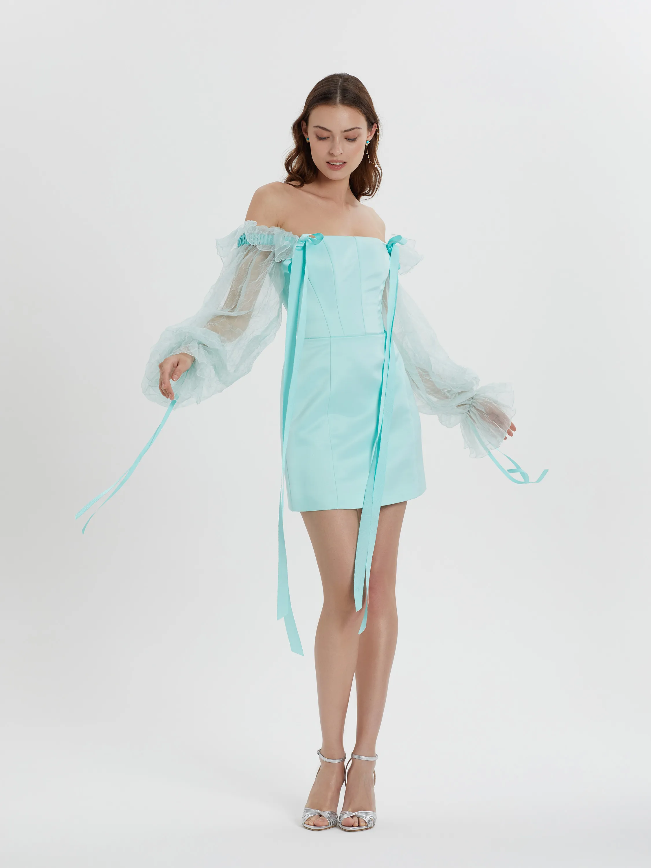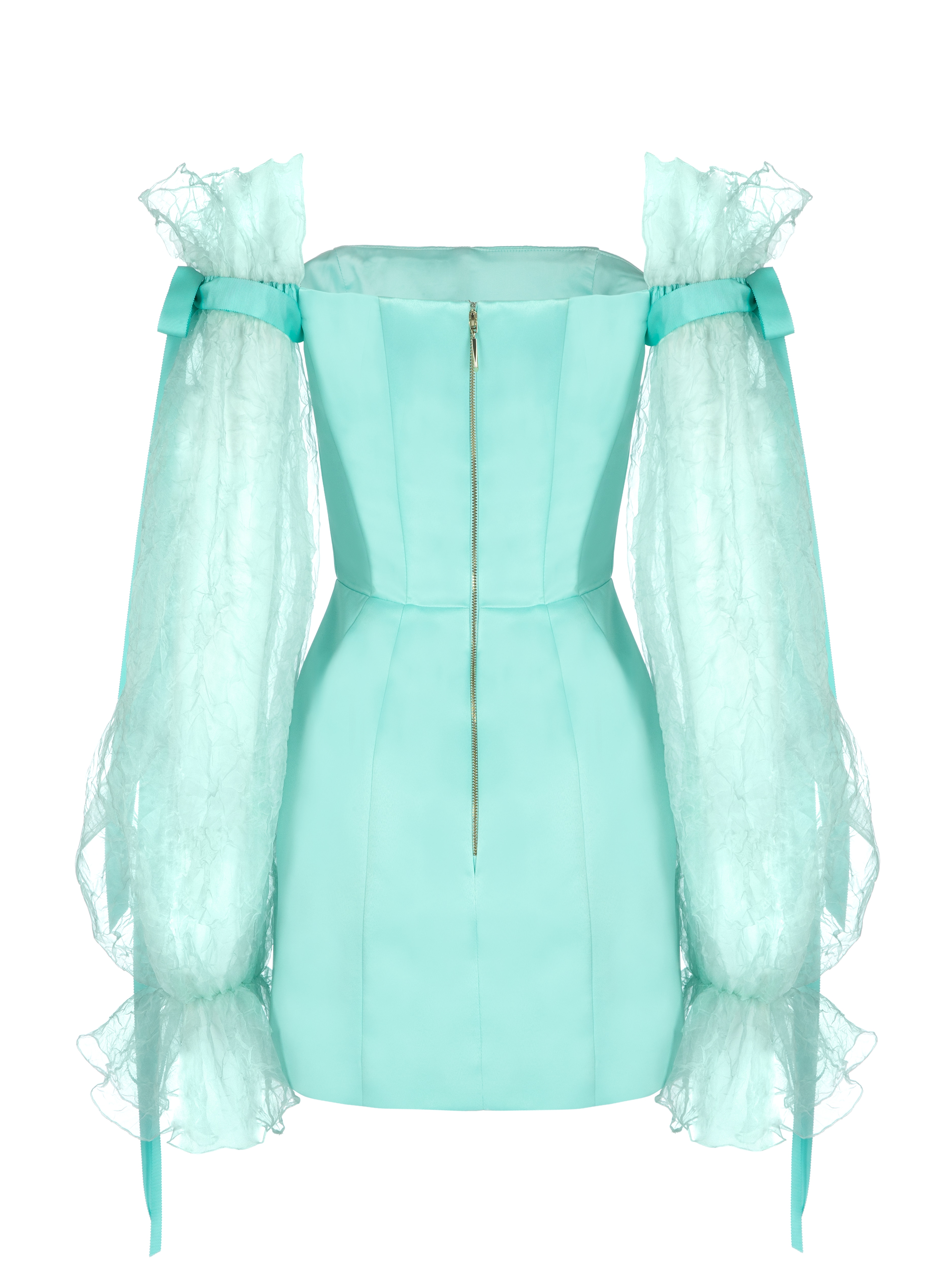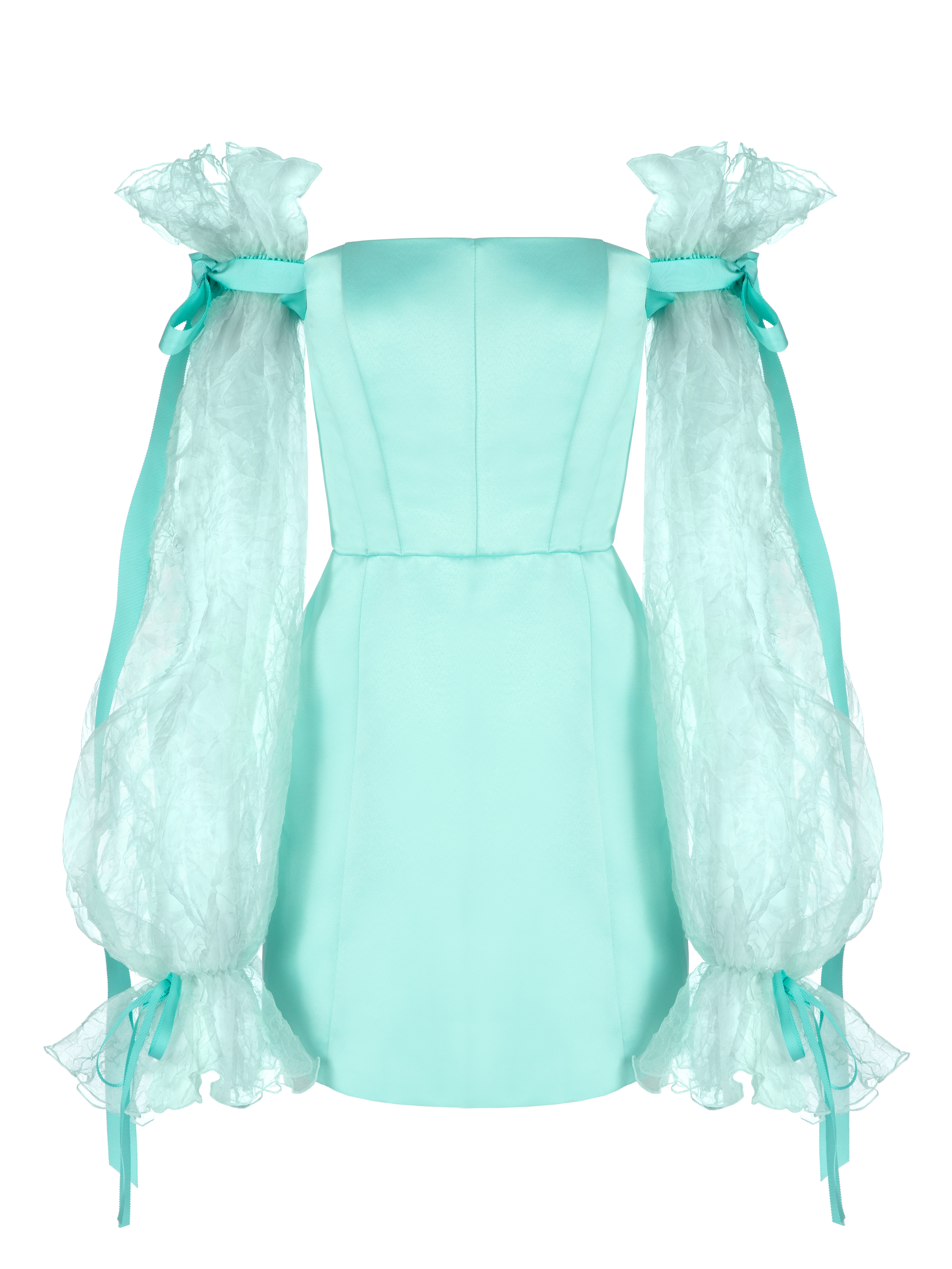 A corset mini sheath dress made of turquoise silk satin. The strict cut is balanced by romantic voluminous puff sleeves made of sheer organza with a “crumpled” effect and ribbon bows in a matching shade.