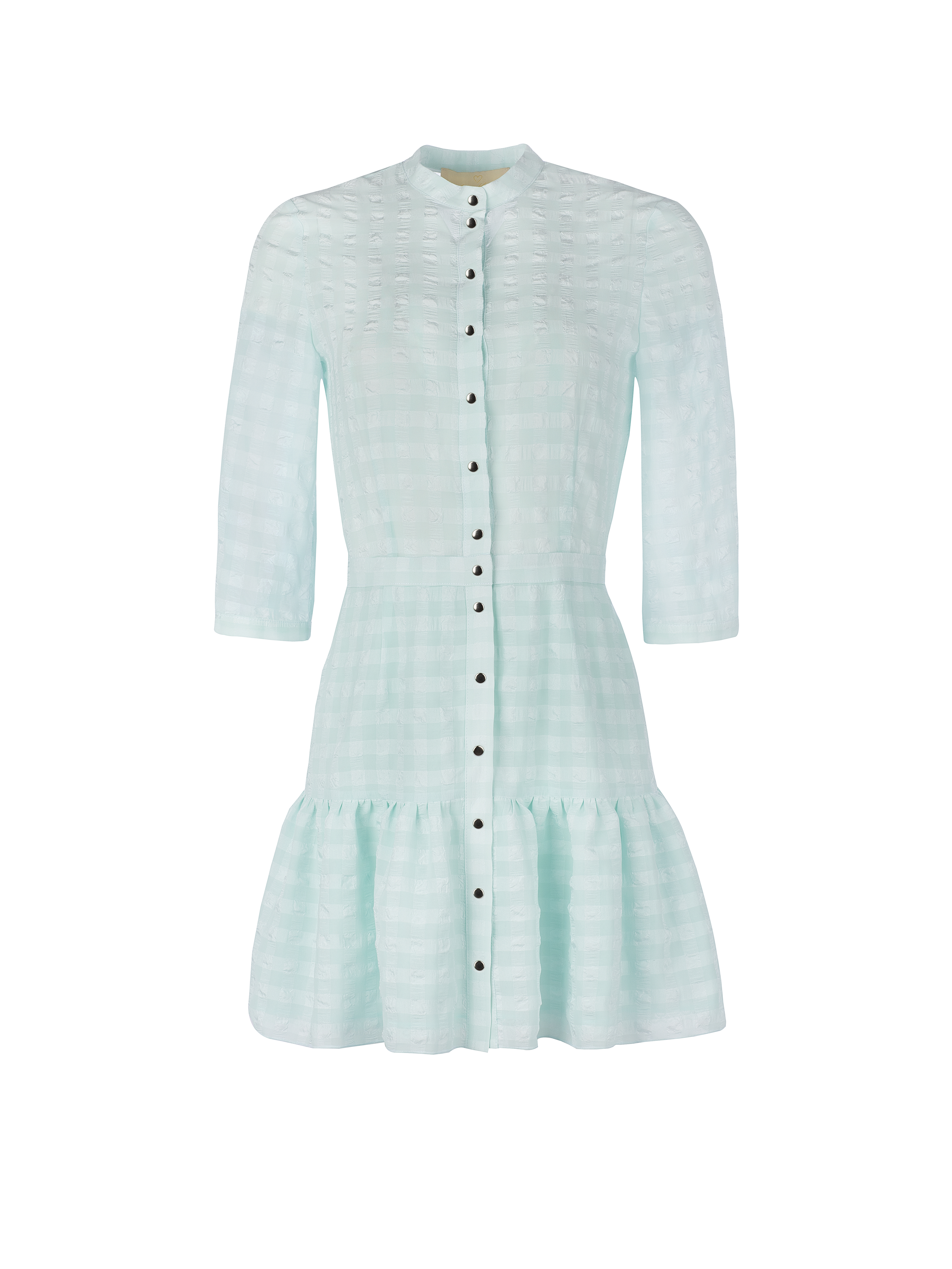 Mini dress made of light-turquoise lightweight checked chiffon. A stand-up collar, shortened 3/4 sleeves, a two-layer hem with one tier.