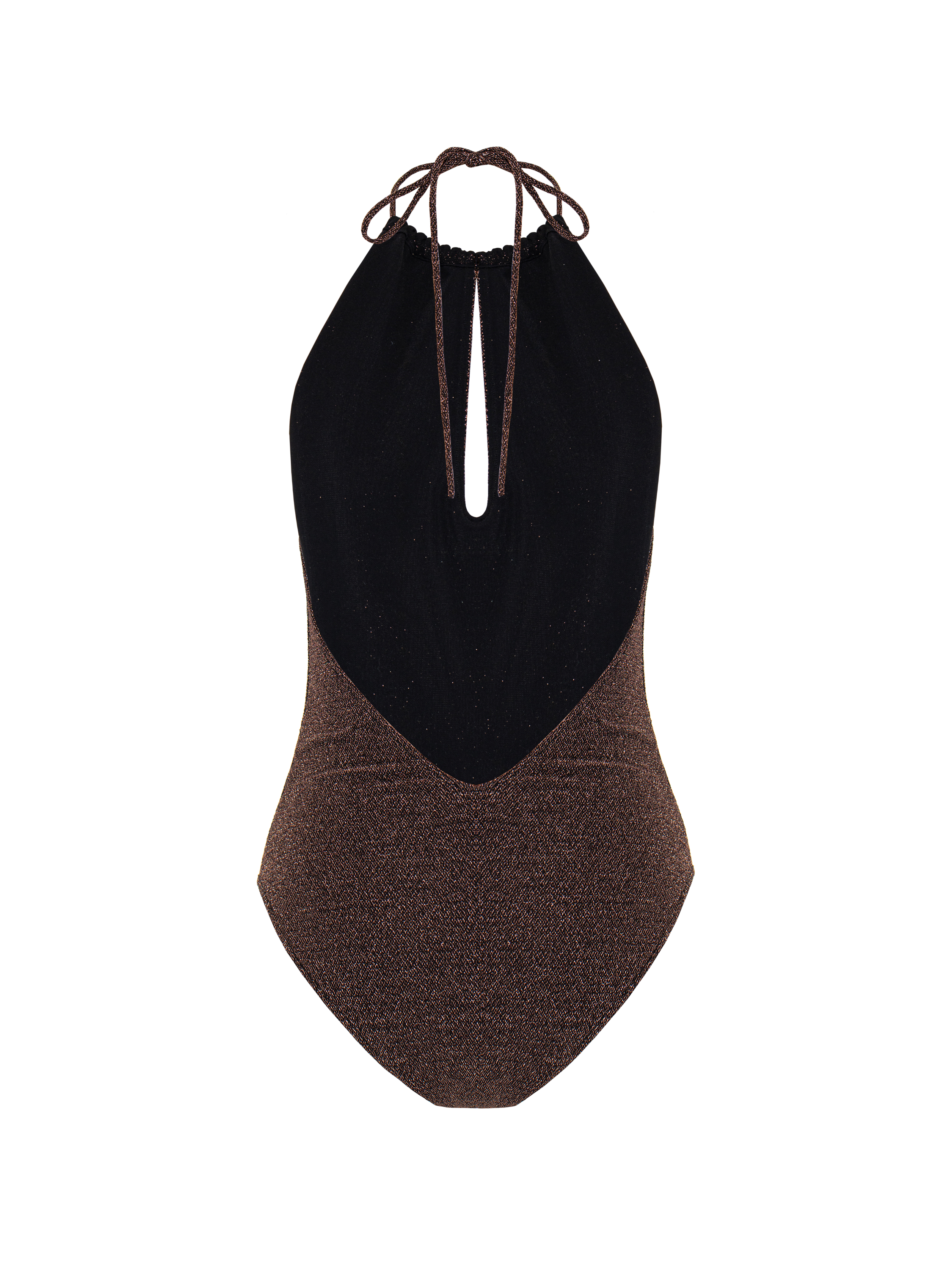 A bodysuit made of black jersey with bronze lurex will become a basic element for creating your festive look. The tie-neck model with a high neckline and keyhole cutout pairs well with both skirts and trousers.