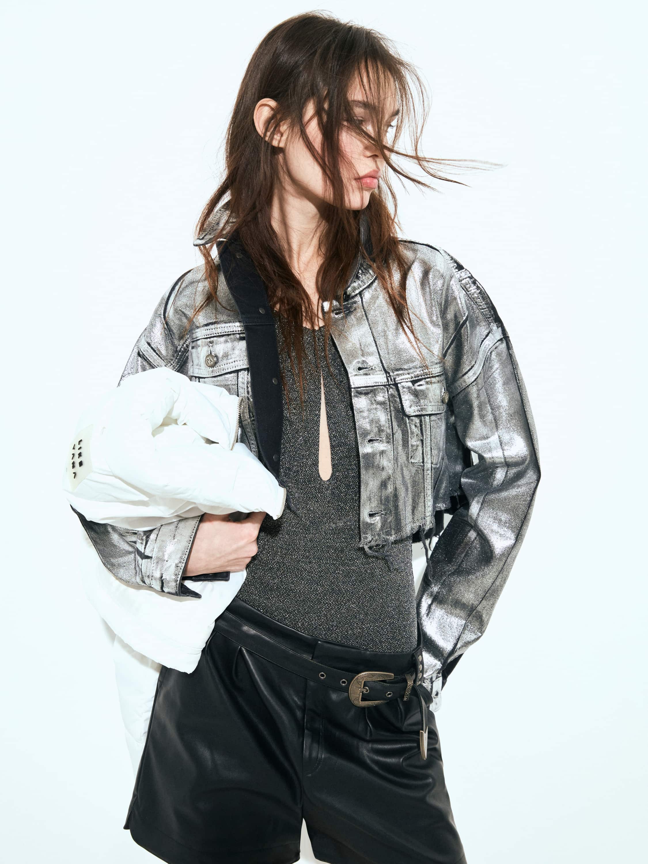 A cropped jacket made of black denim with a silver coating is complemented by a raw hem. Two patch pockets with flaps on the chest. Fastens with branded logo buttons.