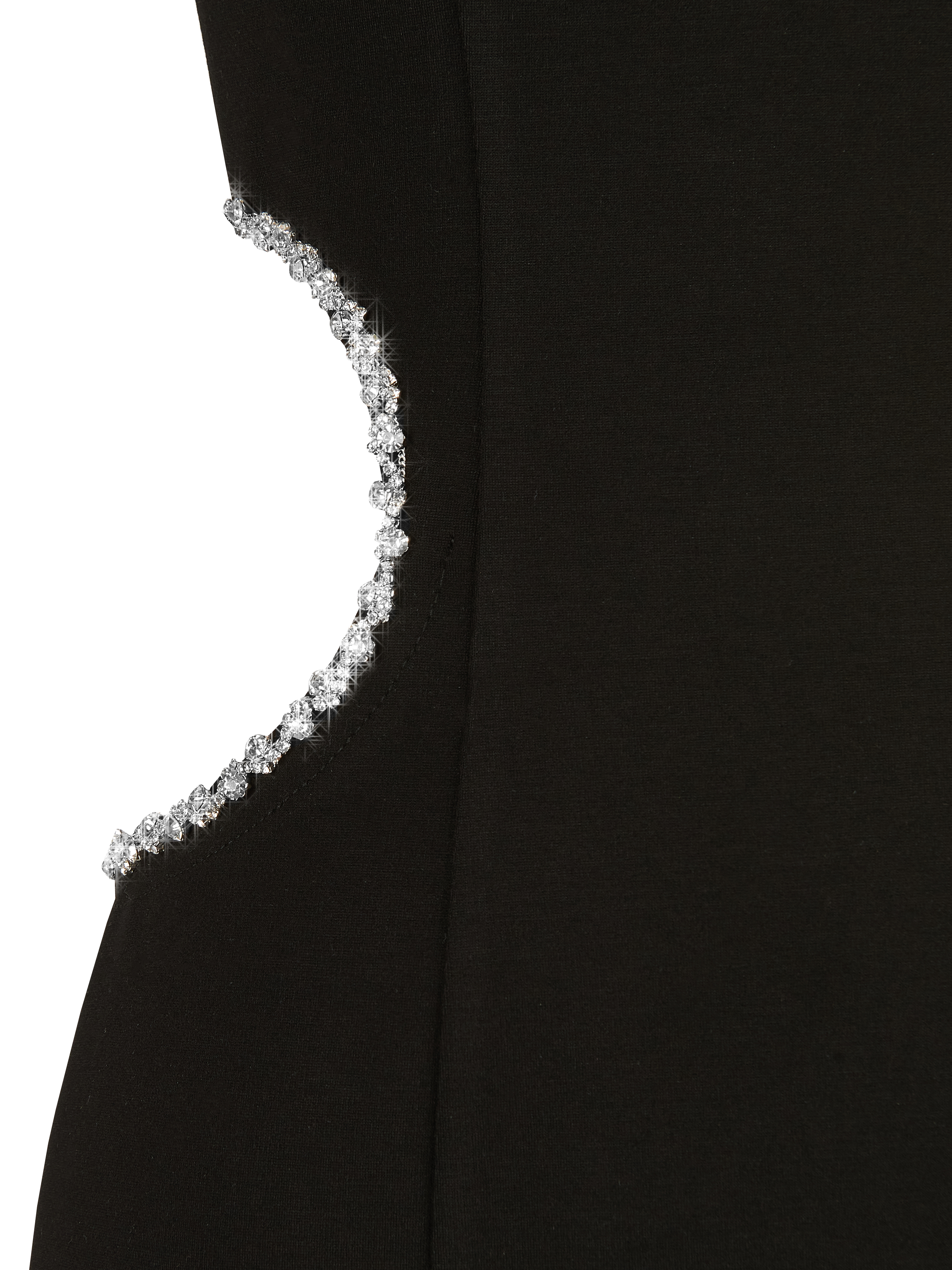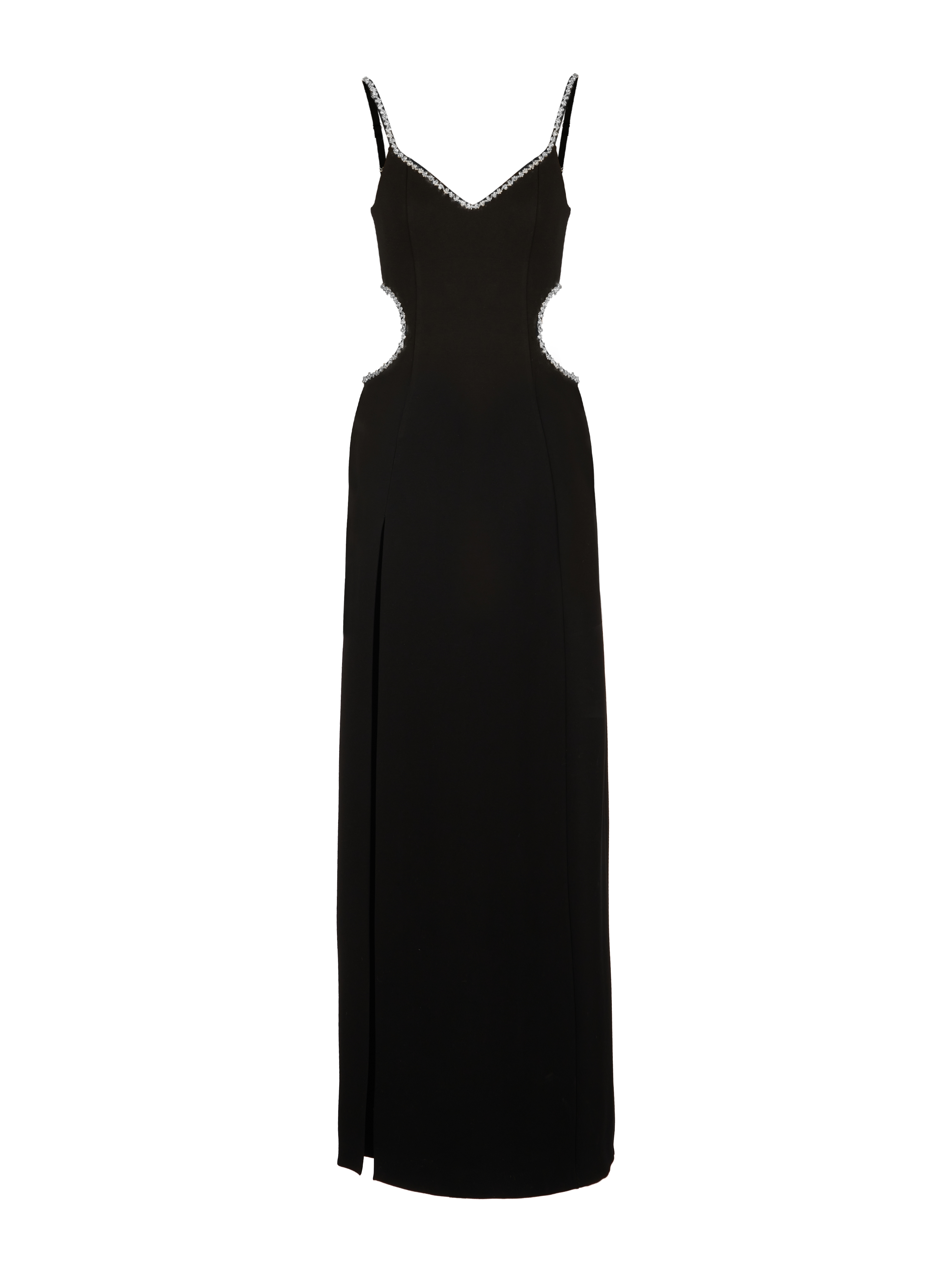 A black maxi dress on thin straps is made of dense jersey. Sensual side cutouts, trimming with crystal and rhinestone braid, and a high slit at the hem give it a special charm. Complete it with Silver by Yana jewelry and shine!