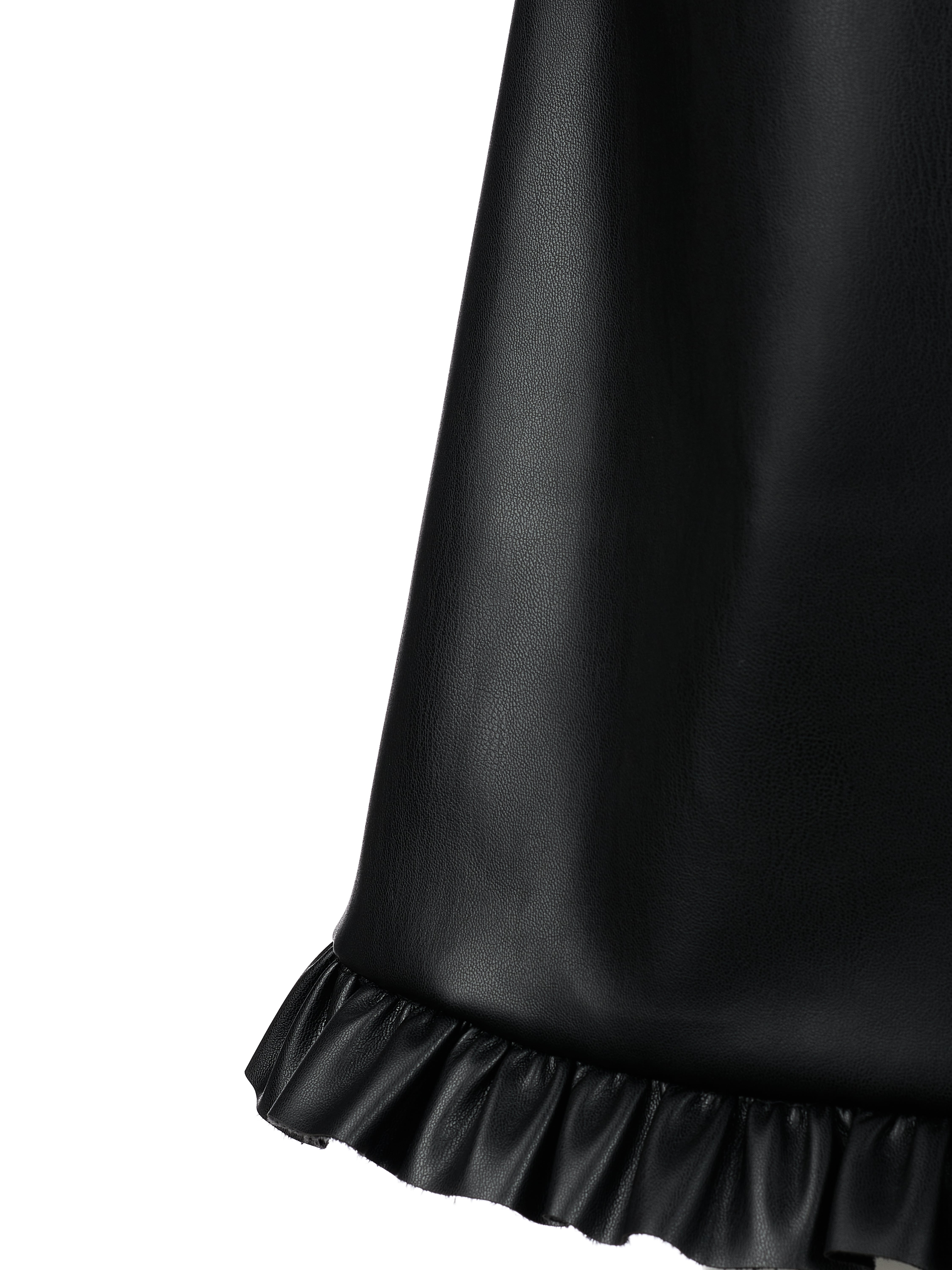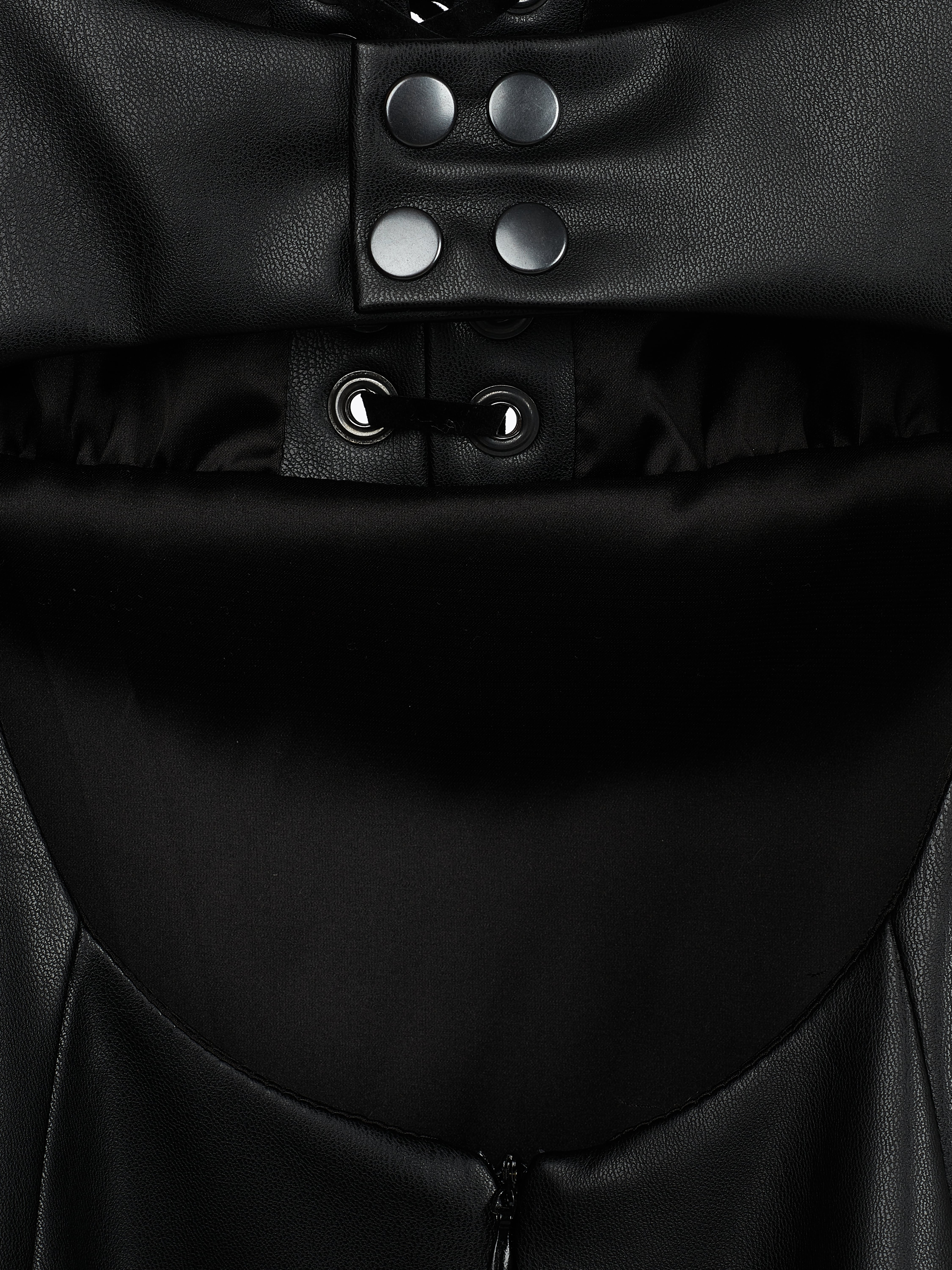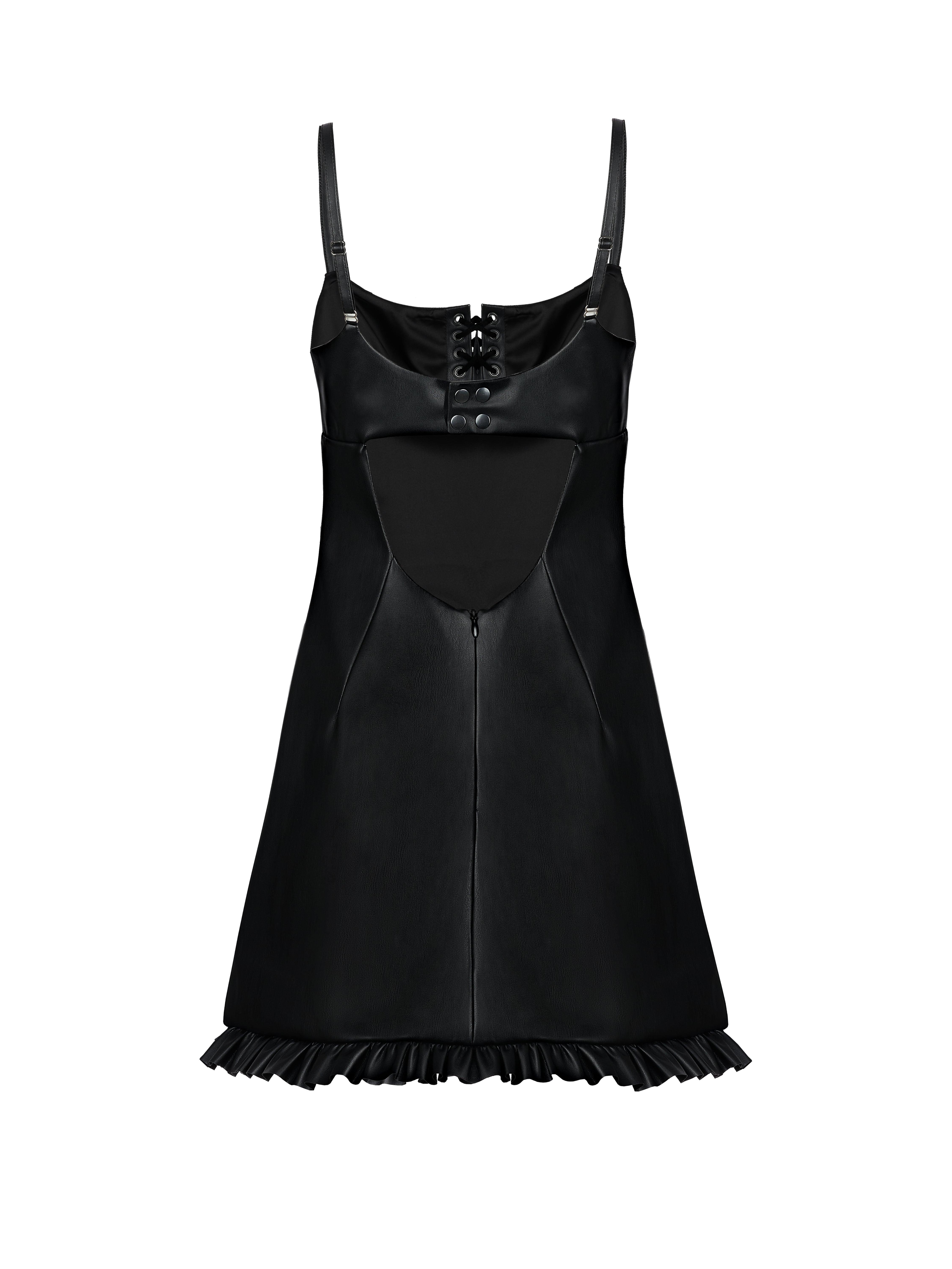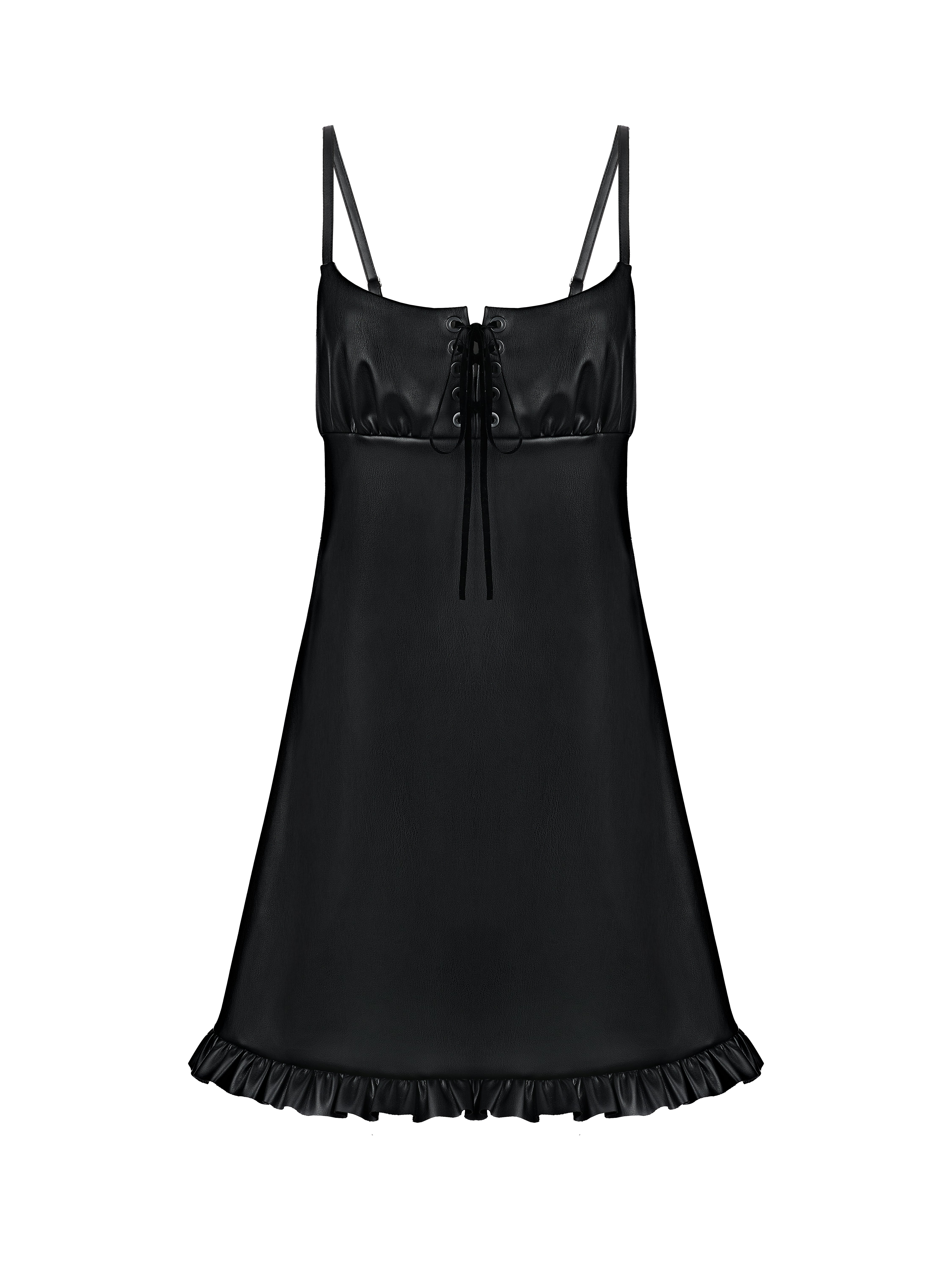 A black mini dress with thin adjustable straps is made of soft faux leather. The bodice of the item is complemented by lacing. At the back there is a cutout with snap-button fastening and a zipper. The hem is decorated with a ruffle.