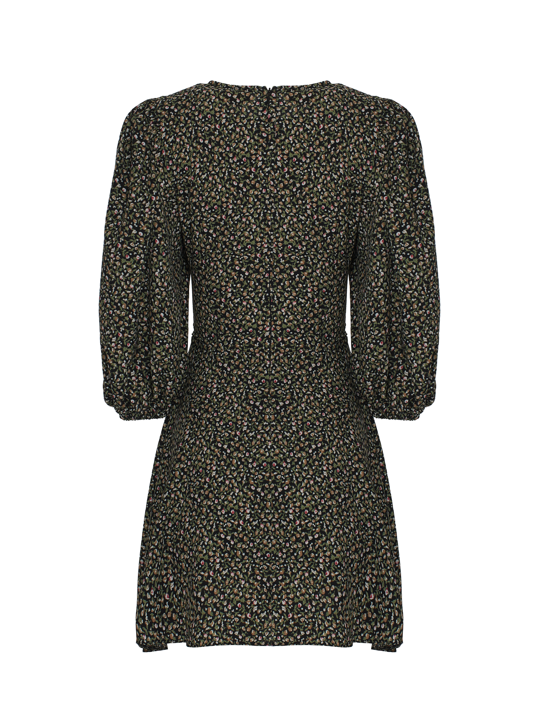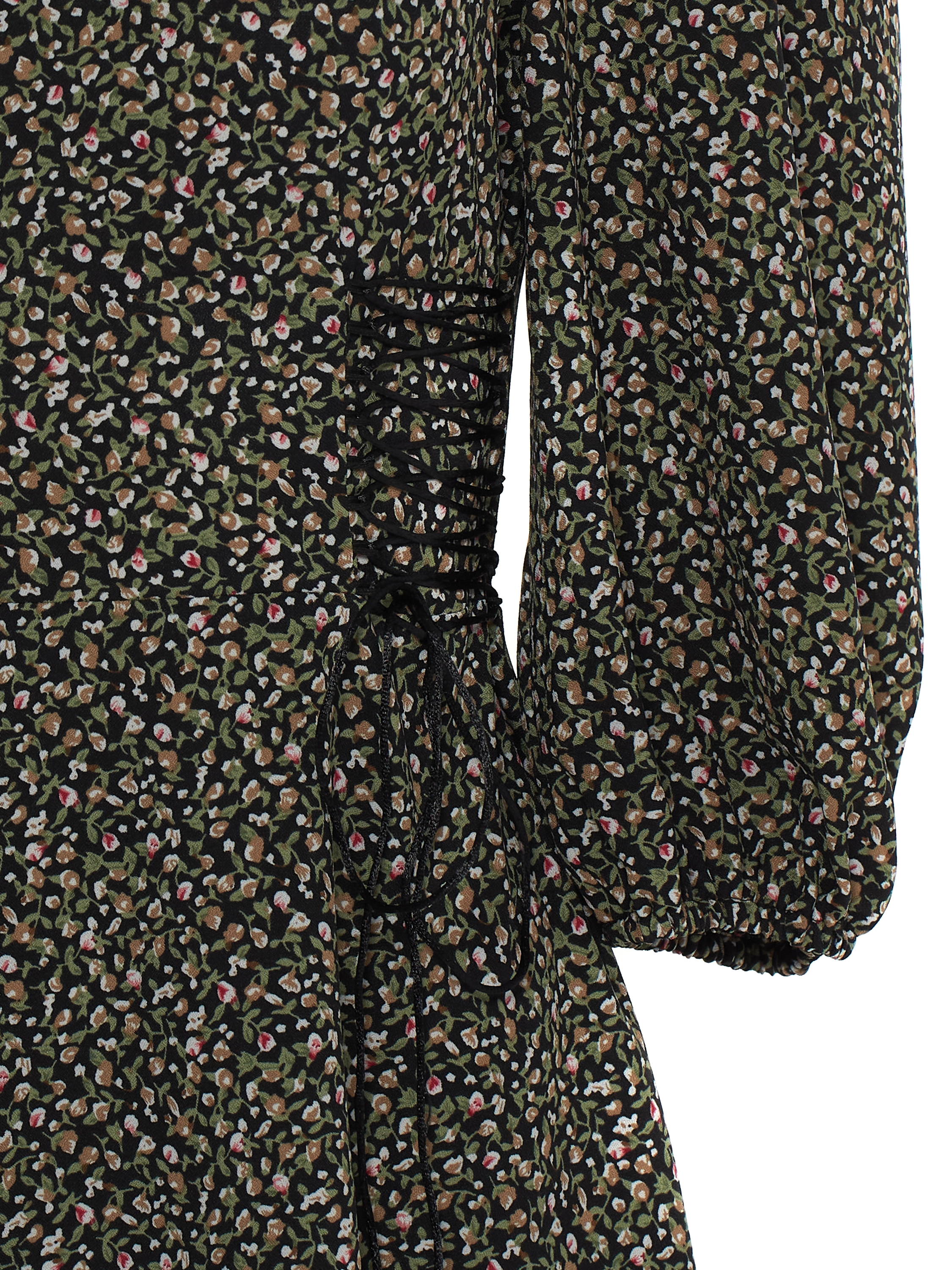 A mini dress with feminine puff sleeves is made of black viscose with a floral print and finished with decorative trim imitating lacing at the waist.
