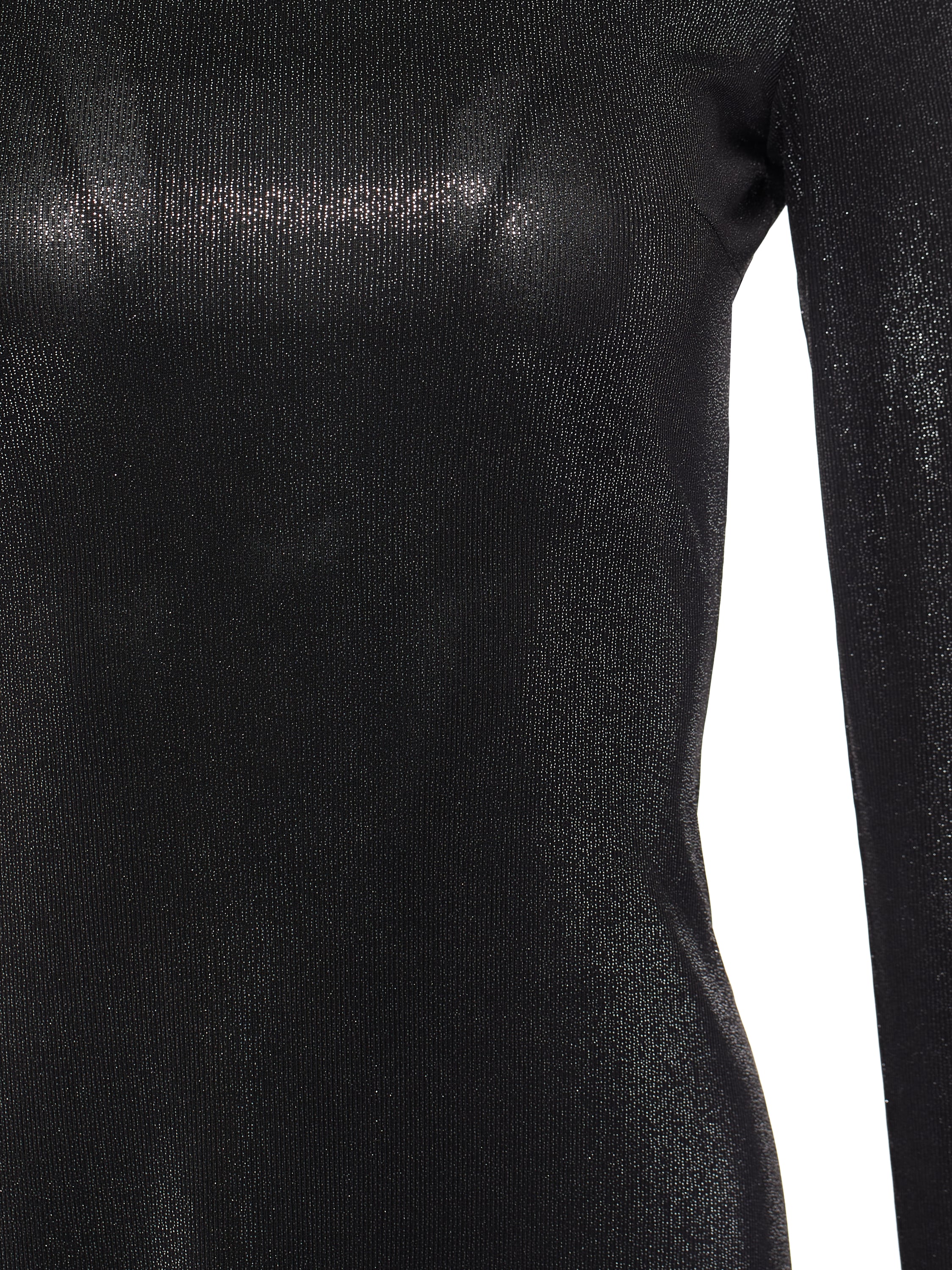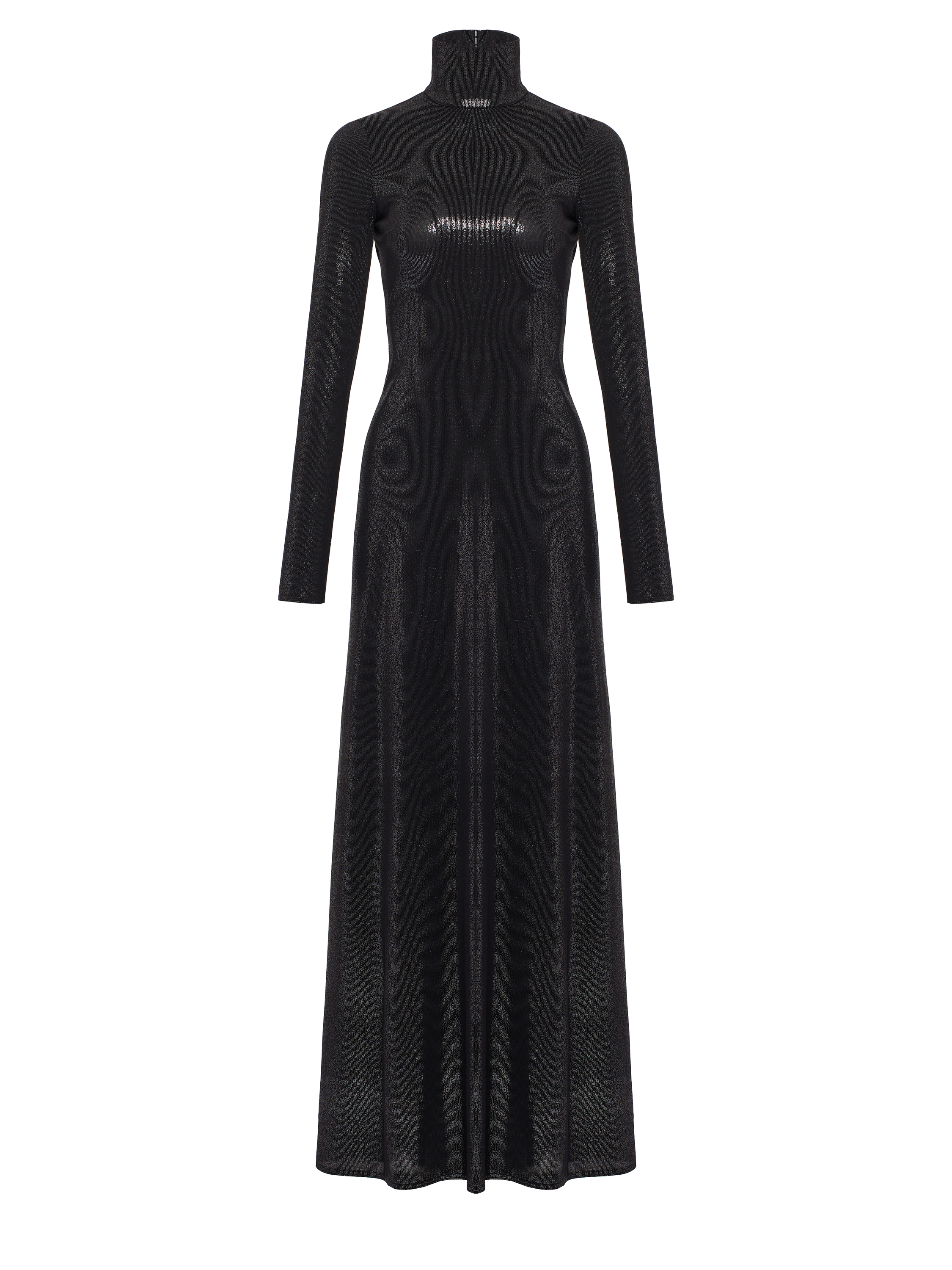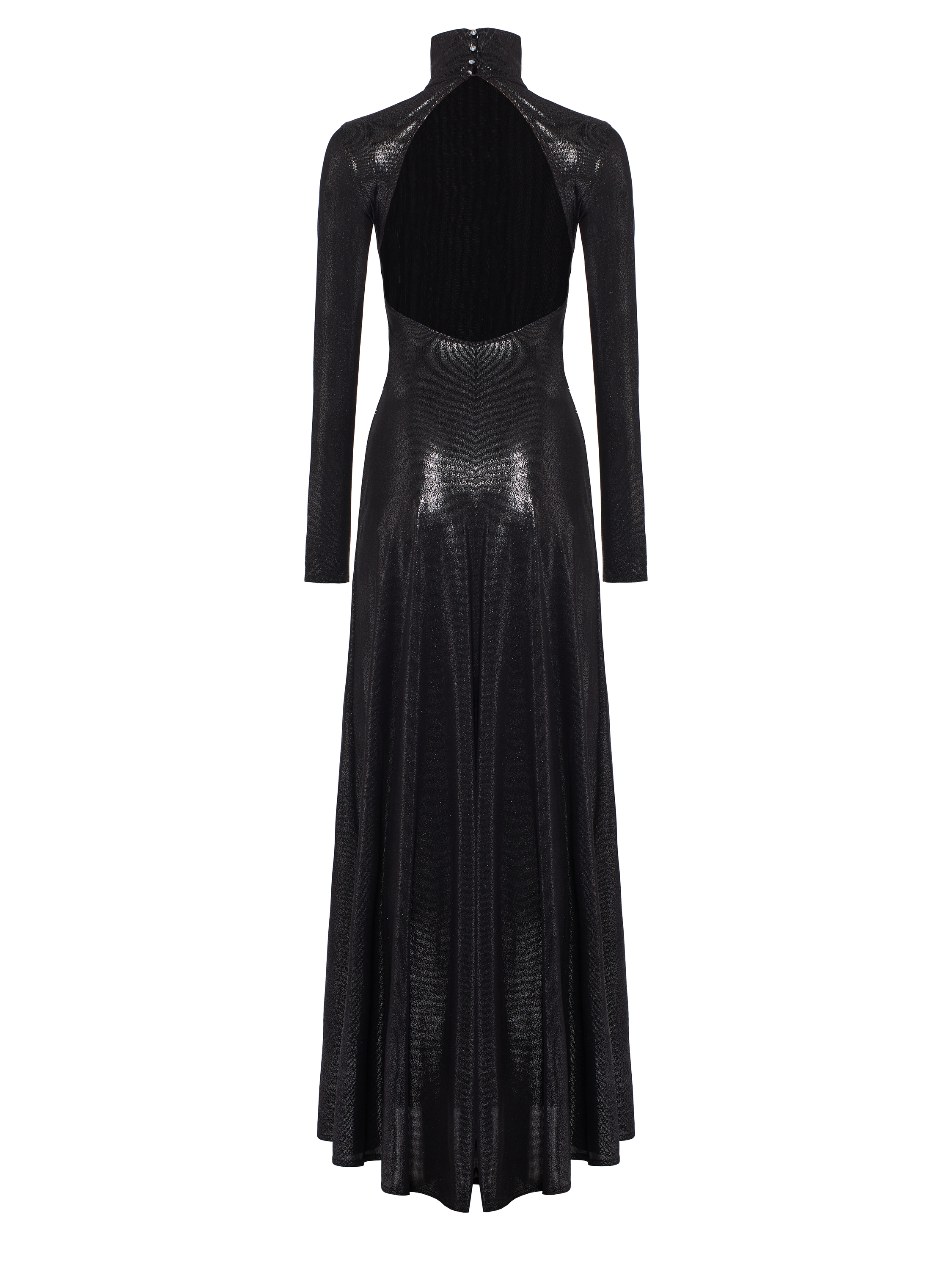 A black maxi dress with long sleeves and a high neck is made of knit fabric with lurex. The model, tightly fitting the figure in the front, is complemented by an intriguing deep cutout at the back. The hem of the piece forms soft folds.