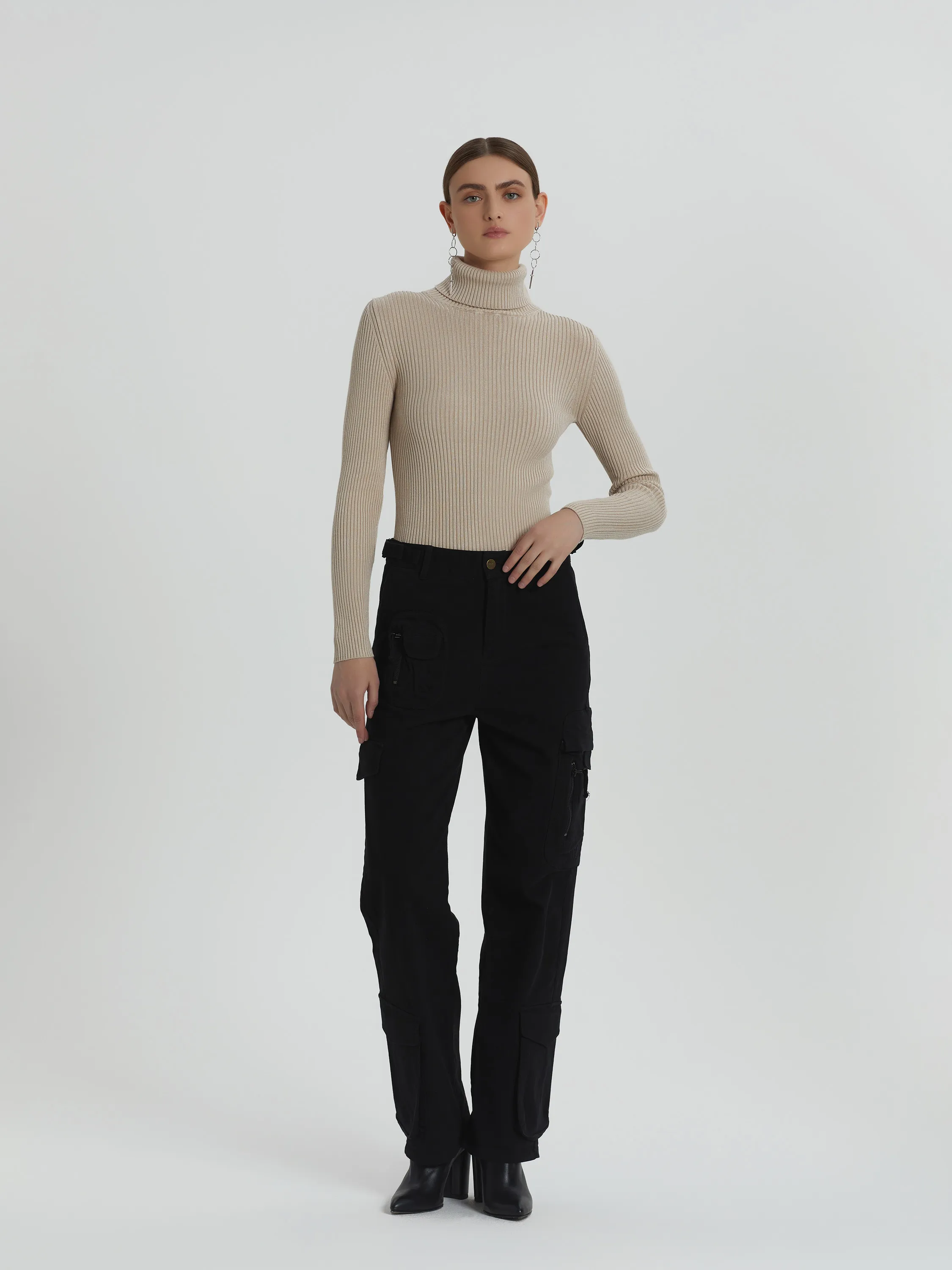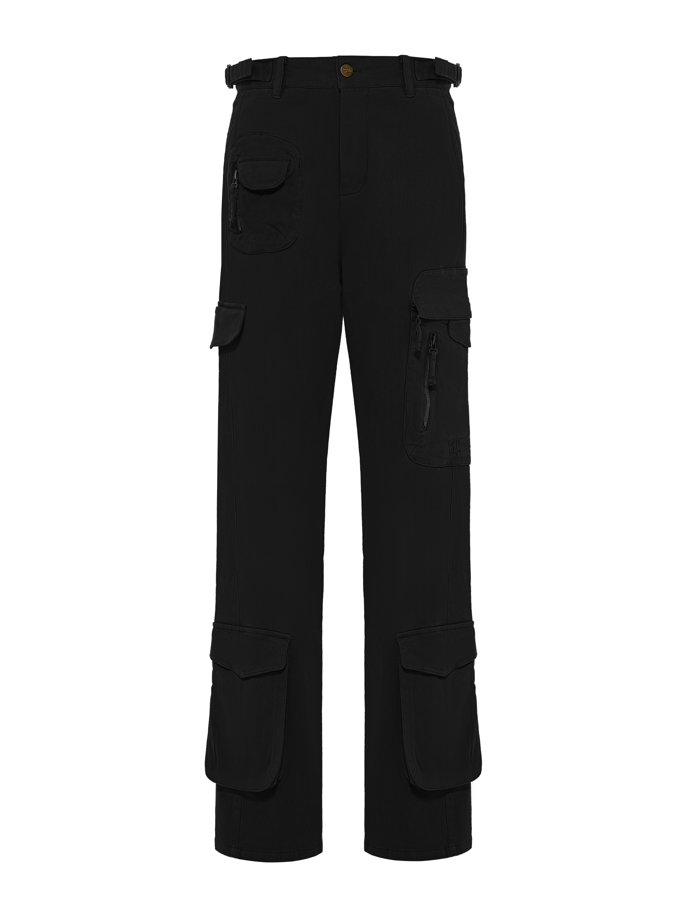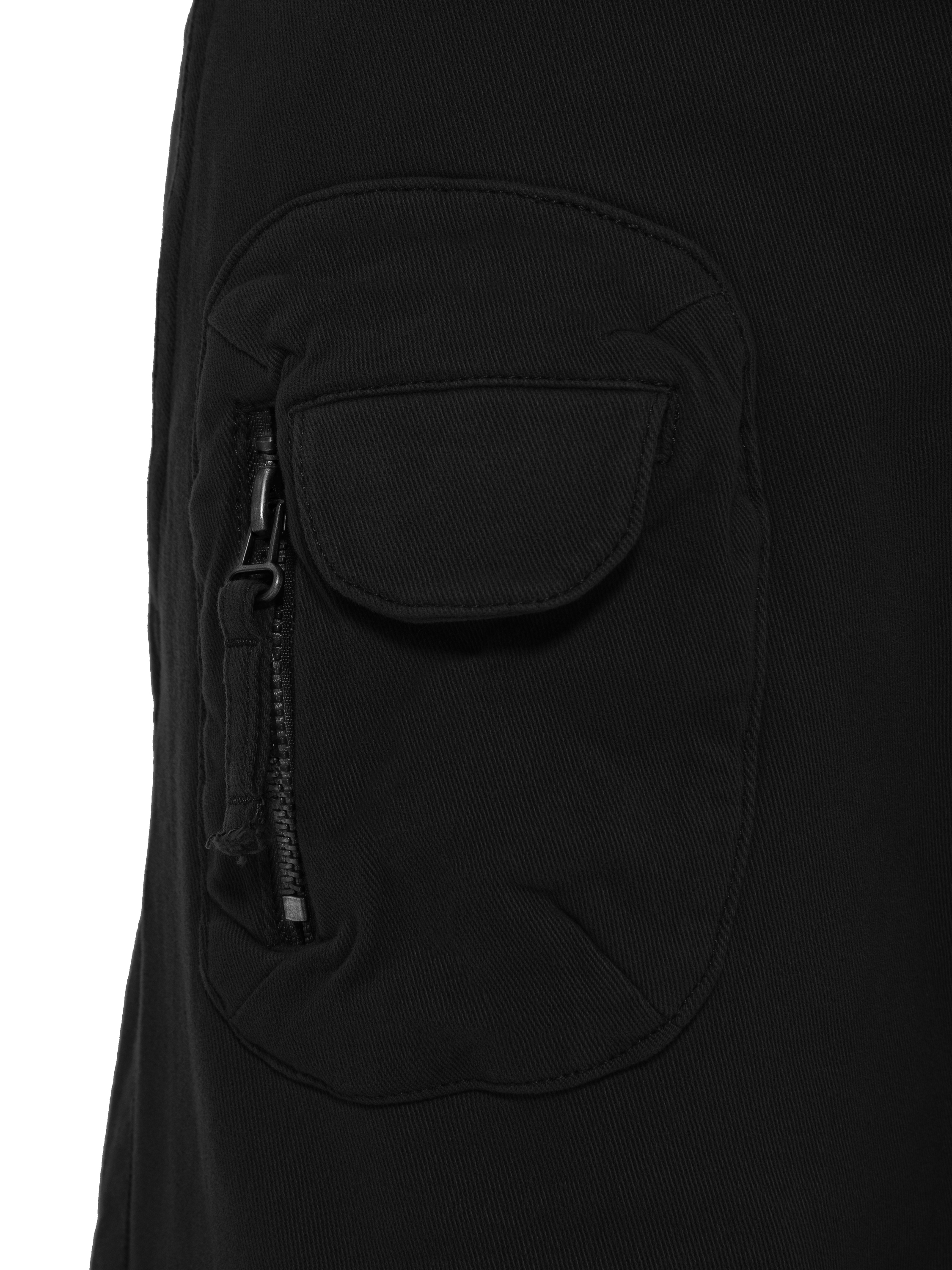 Wide cargo trousers made of black cotton. The high-waisted model with patch pockets with flaps and zippers is complemented by size adjusters at the waist.