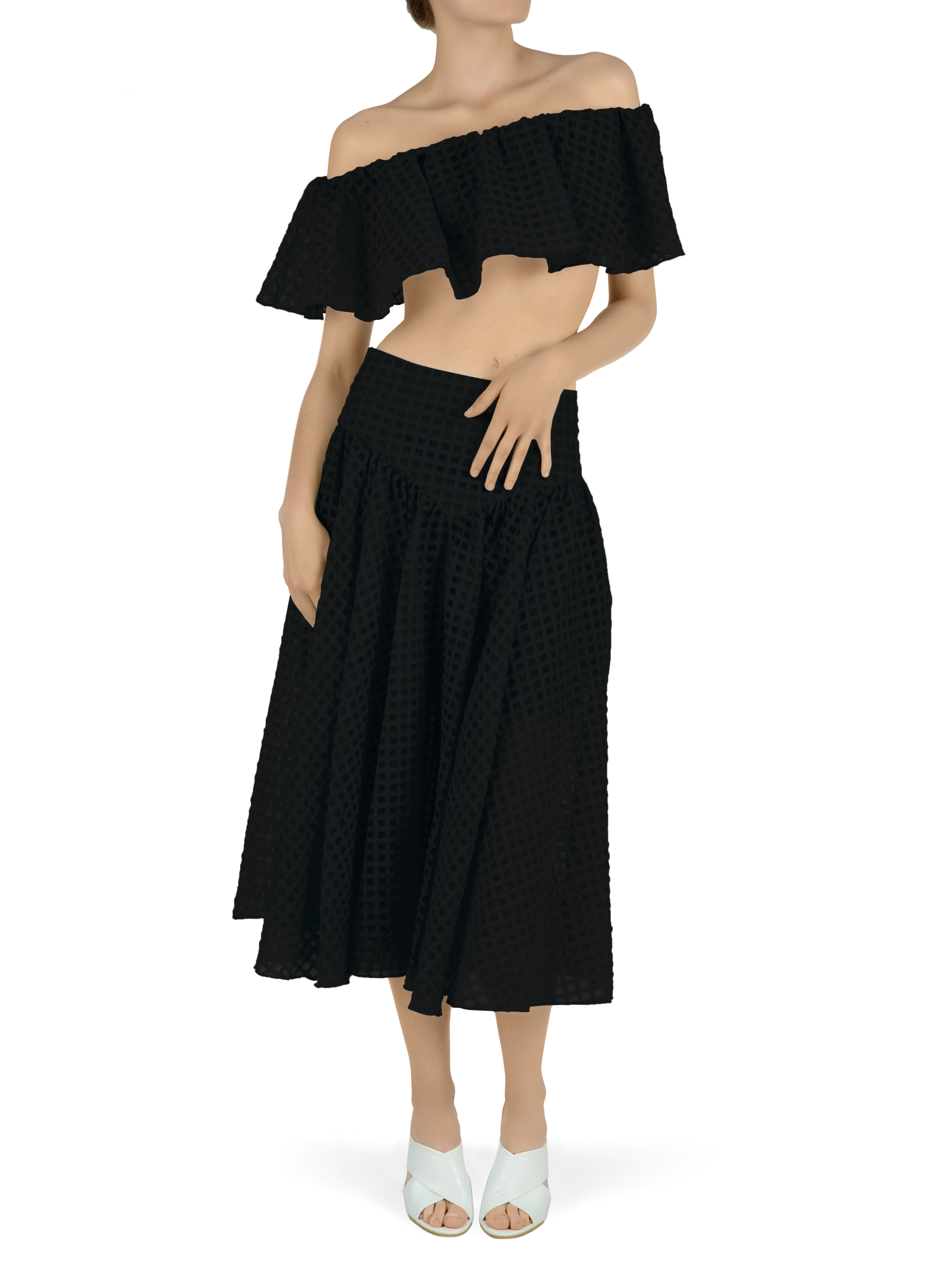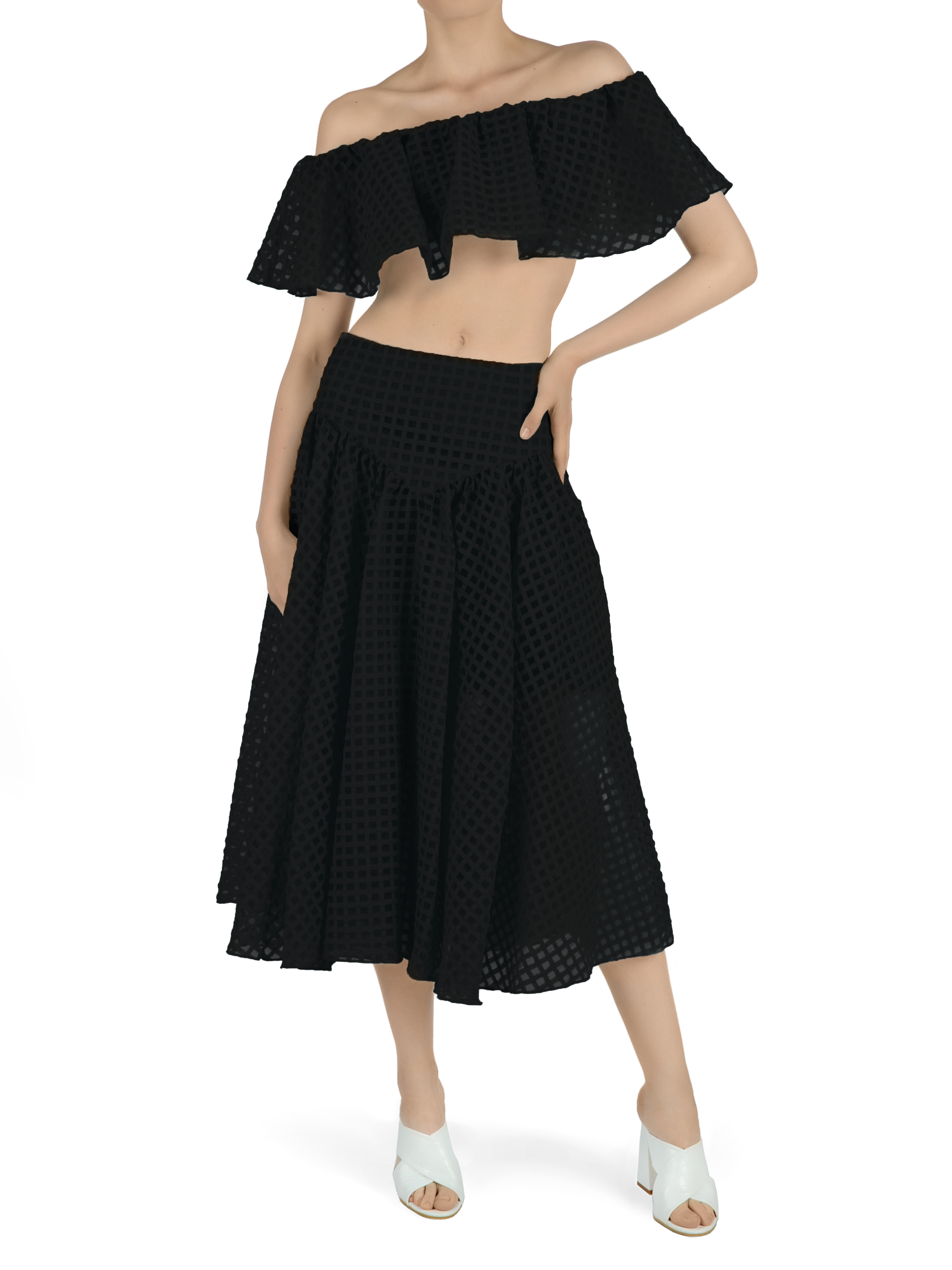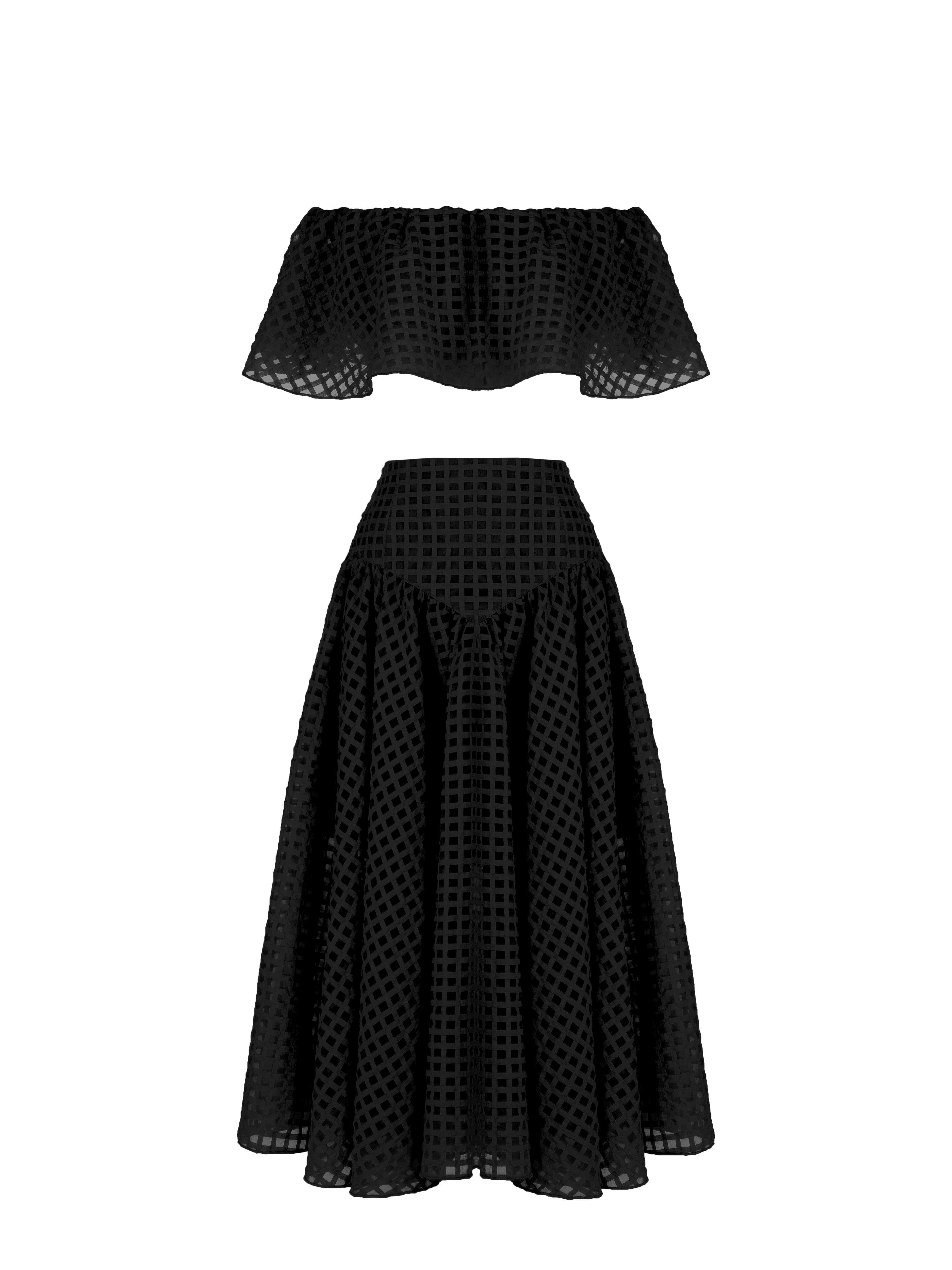 The set of a top and a midi skirt is made of lightweight, semi-sheer black checked chiffon. The top with a flounce elegantly reveals the shoulder line and collarbones. Add Silver by Yana silver jewelry to the set to create a complete look.