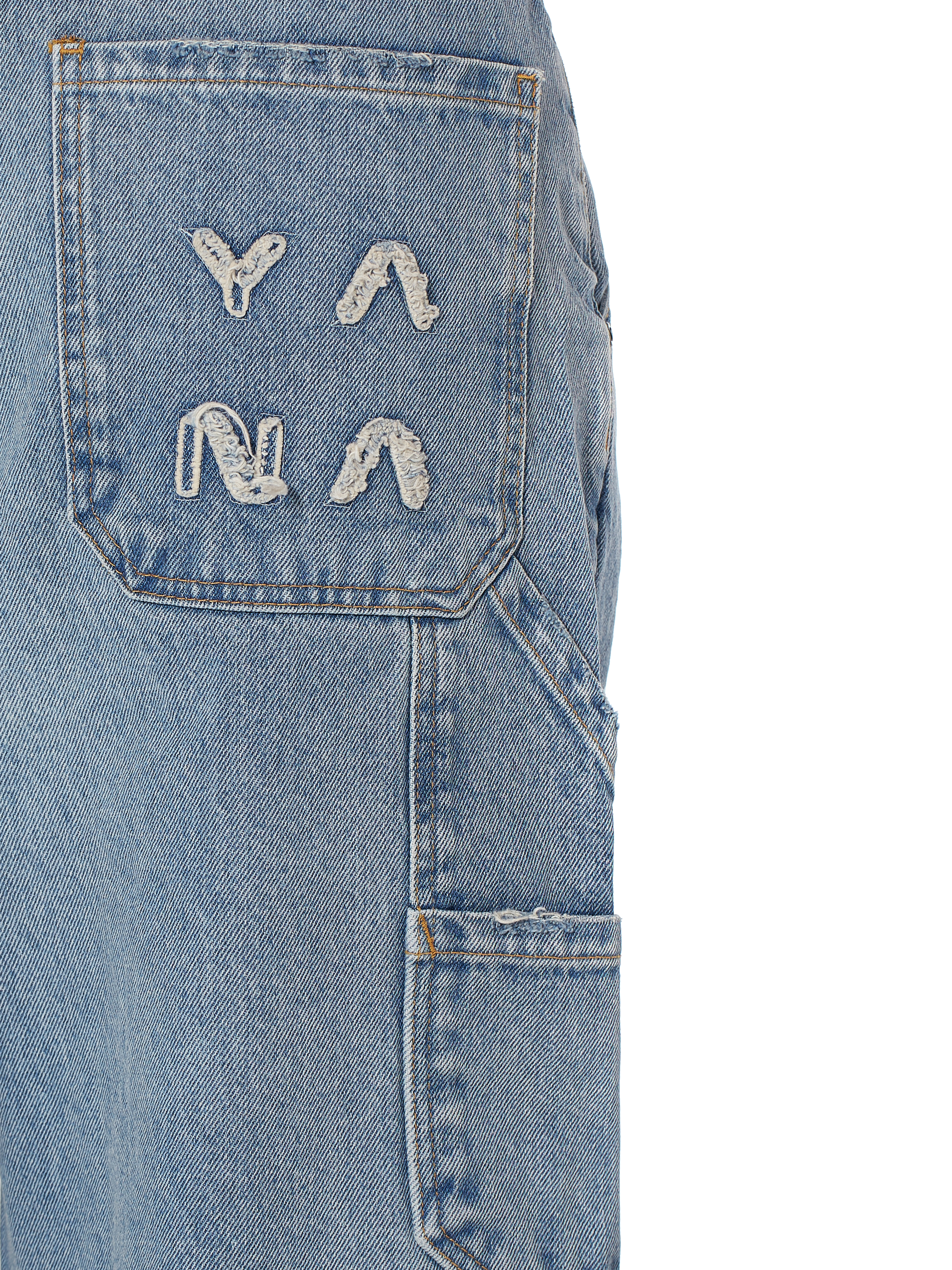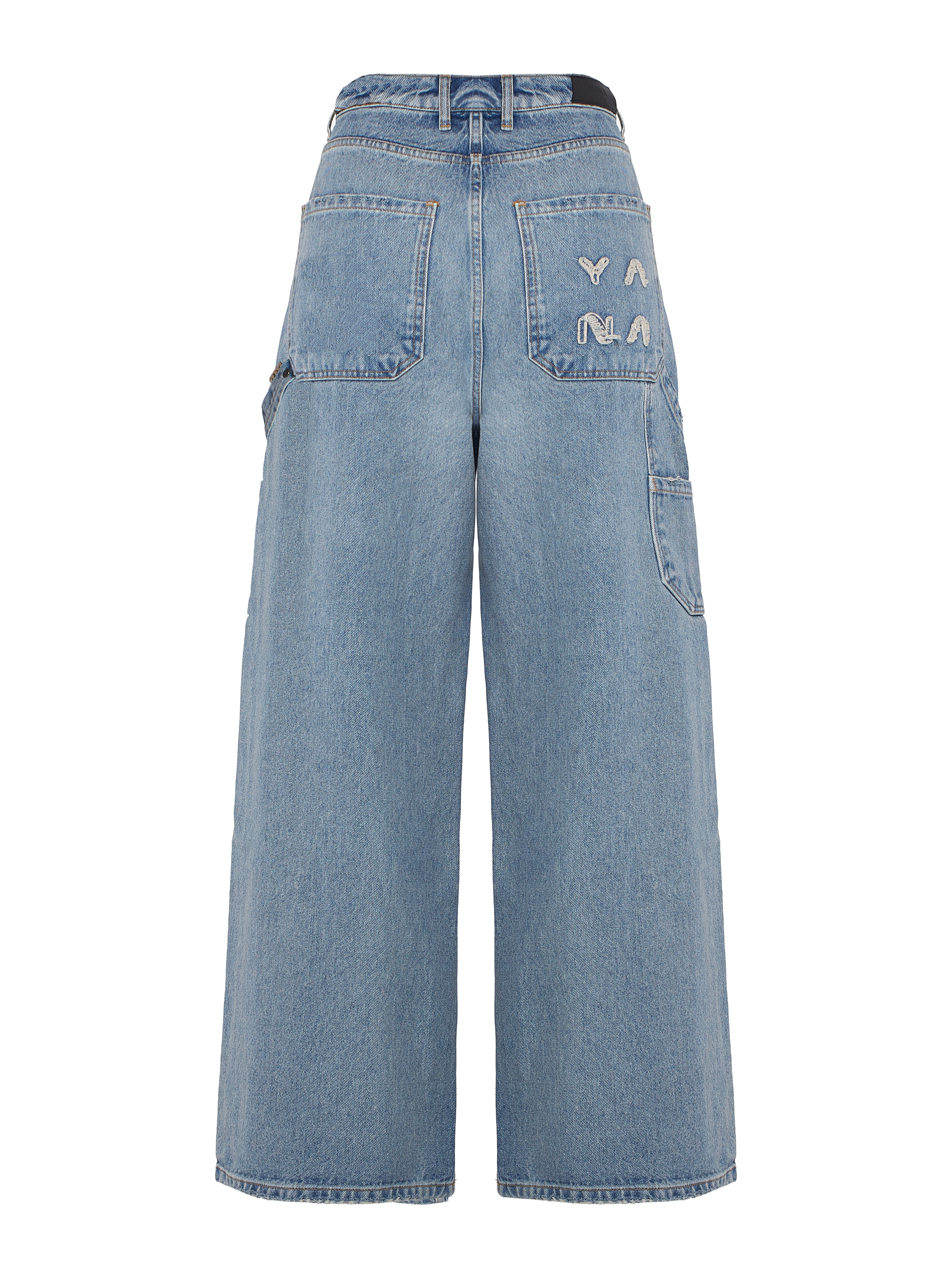 Wide high-waisted jeans are made of natural light blue cotton. The model features a high rise. Side pockets set a relaxed mood. The jeans are complemented by a YANA patch on the back pocket. On the model: size 25. Height: 180 cm.