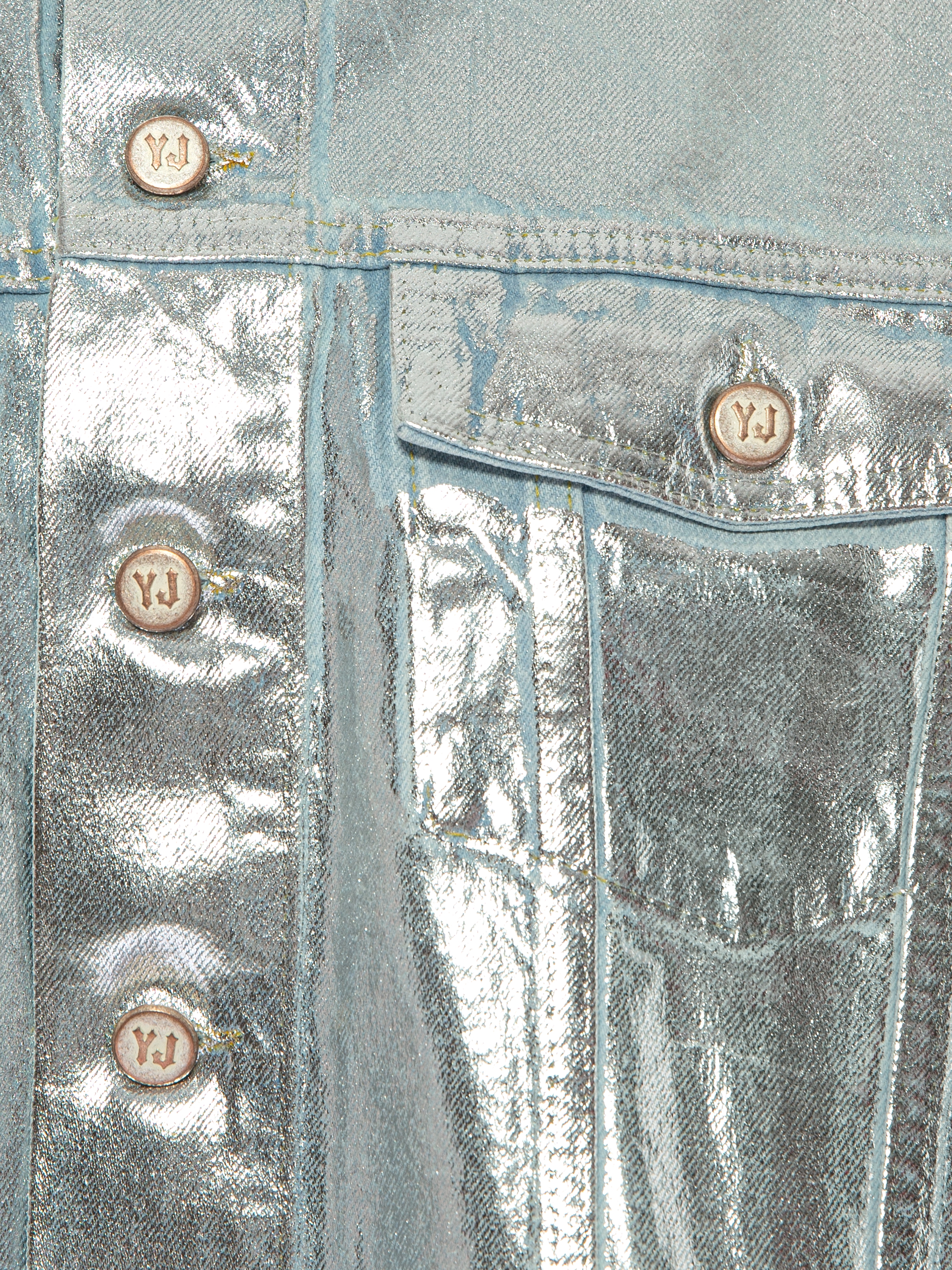 Cropped jacket made of light blue denim with a silver coating, finished with a raw hem. Two patch flap pockets on the chest. Fastens with branded logo buttons. Model measurements: height – 179 cm, 85/59/92.