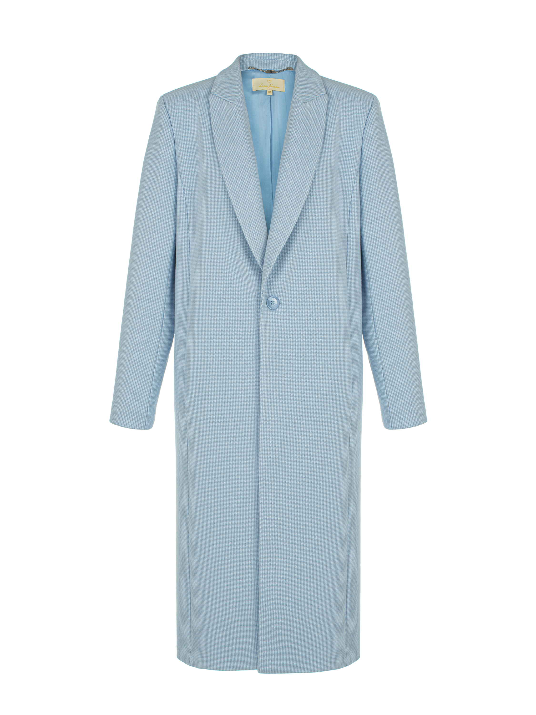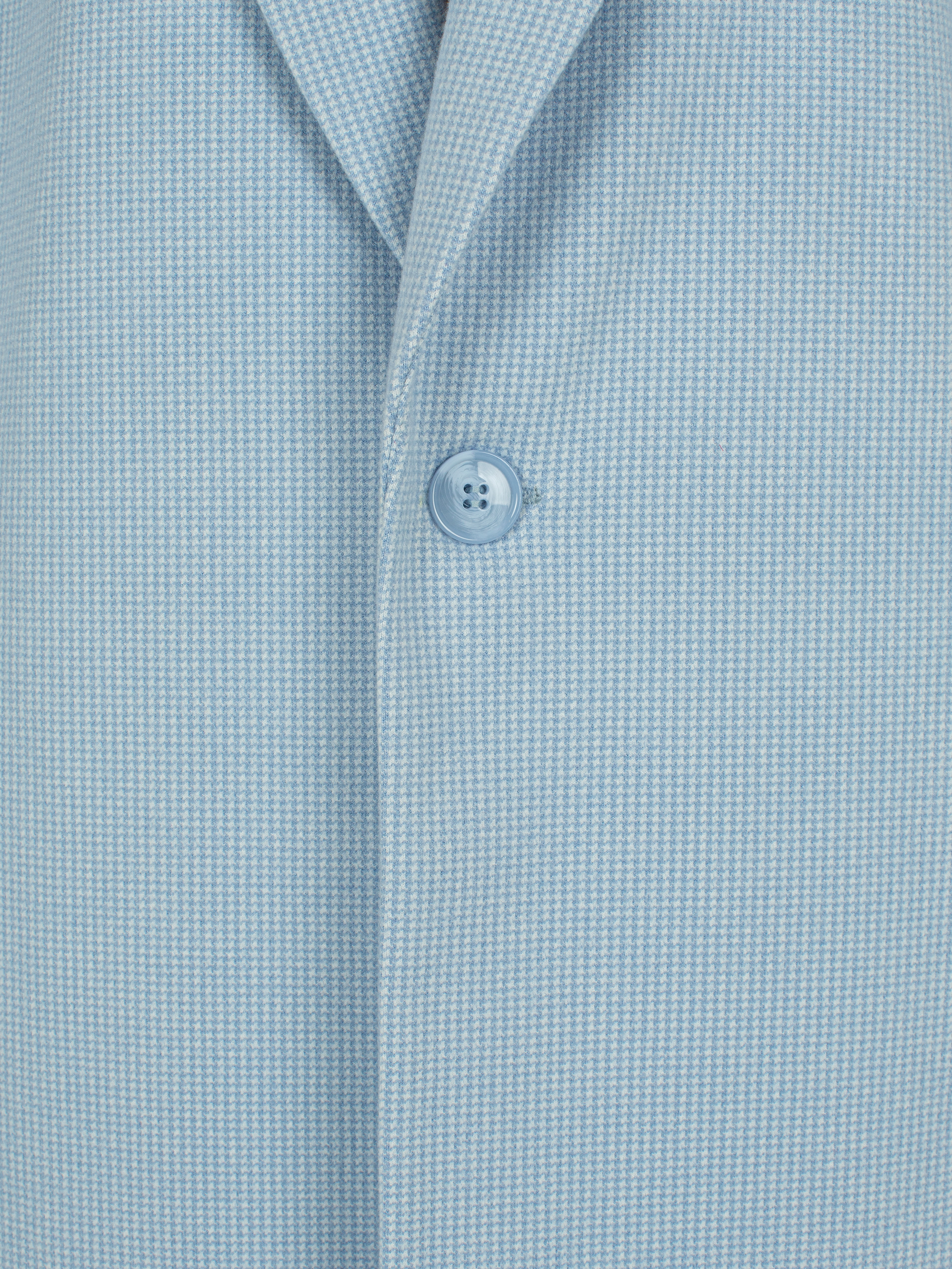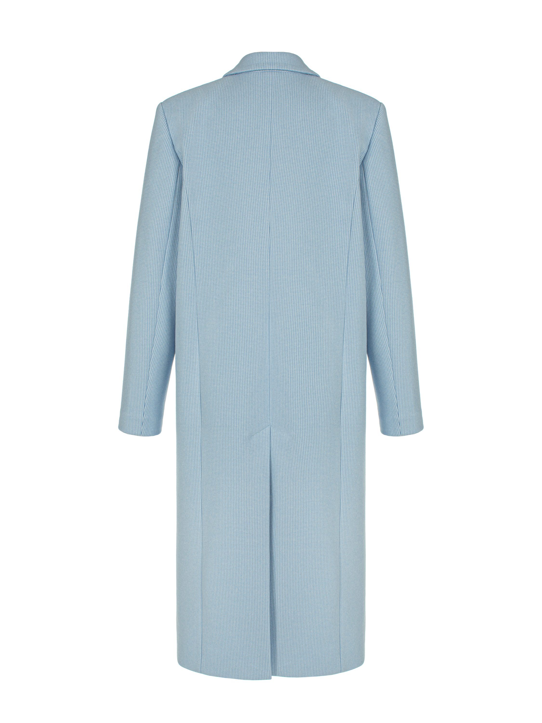 A light blue single-breasted straight-cut coat made of wool blend with a houndstooth pattern. The piece is complemented by wide shaped lapels, a matching lining and a high back vent for comfortable wear. Fastens with a single button.