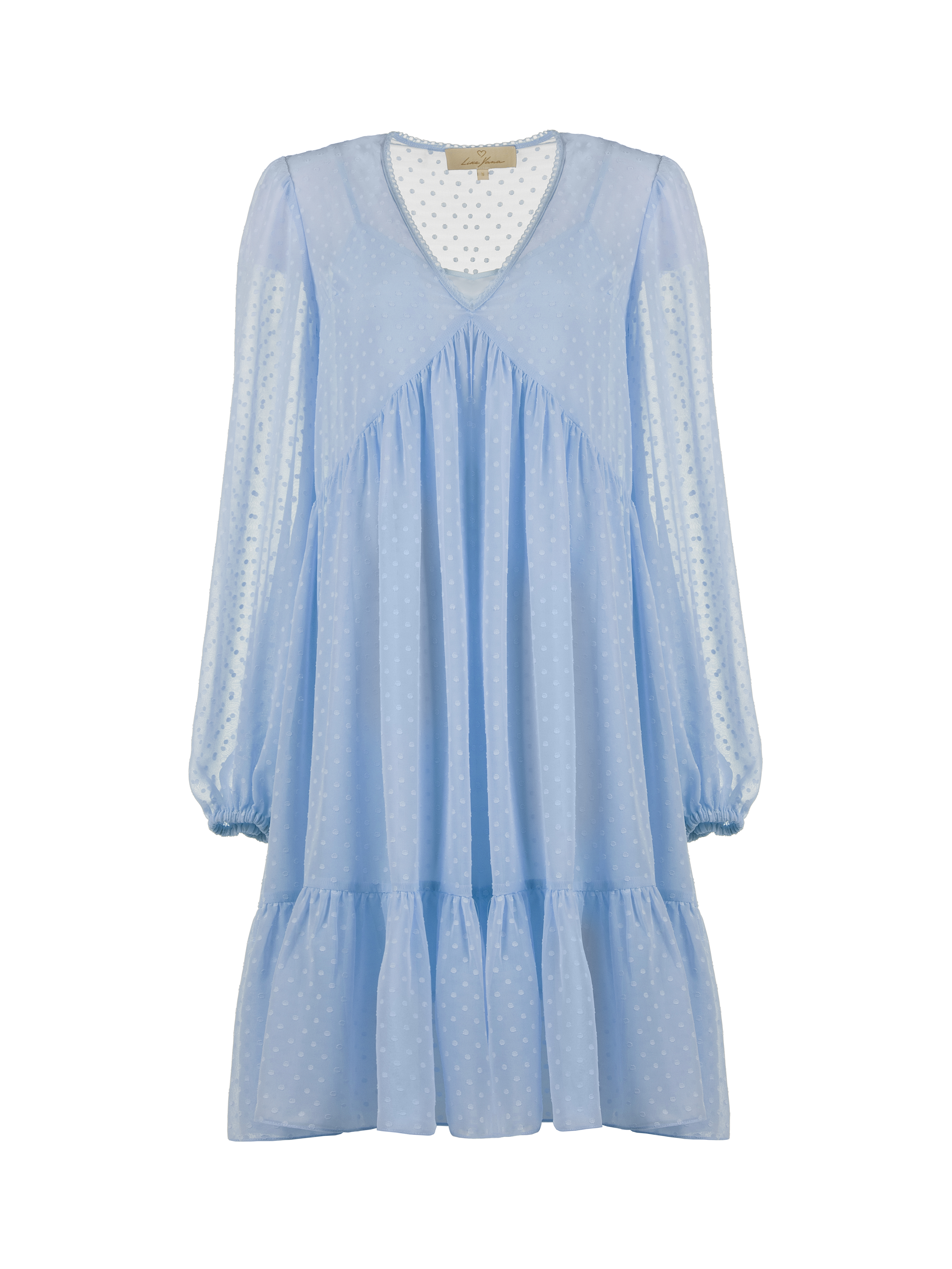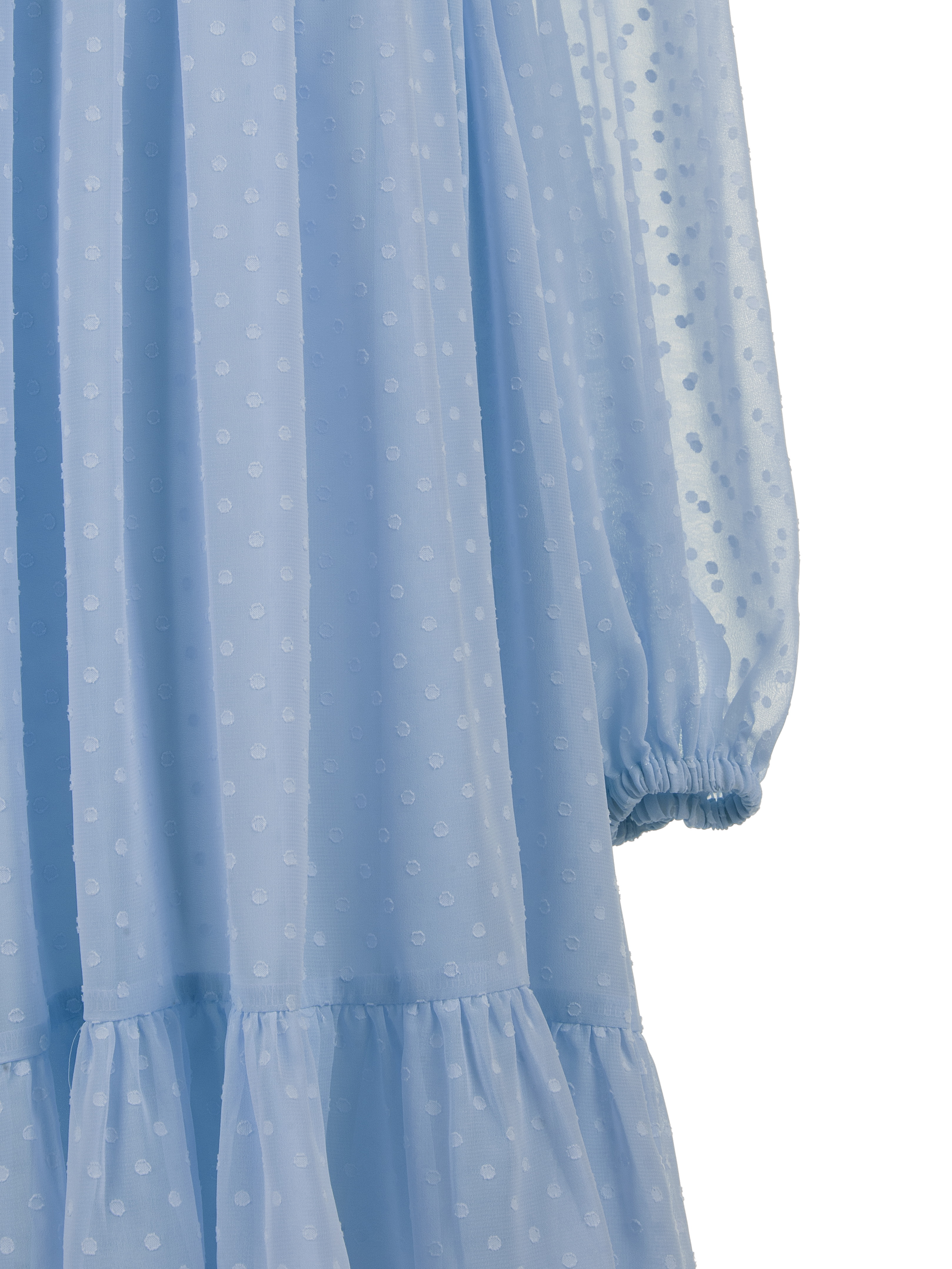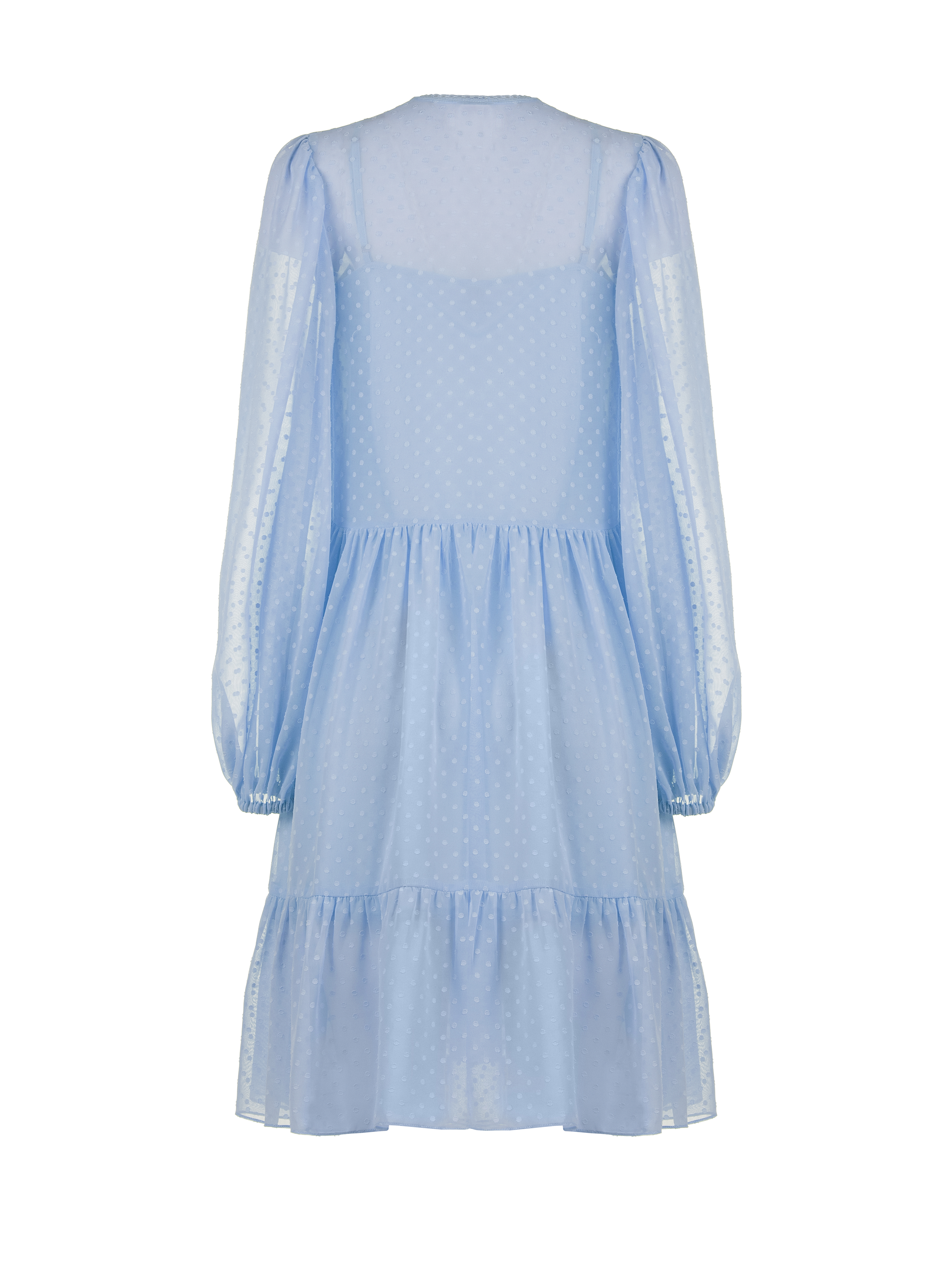 Blue dress is made of chiffon with textured polka dots. V-neckline, long puffed sleeves and a cut-off flounce on the hem are the main features of the model.
