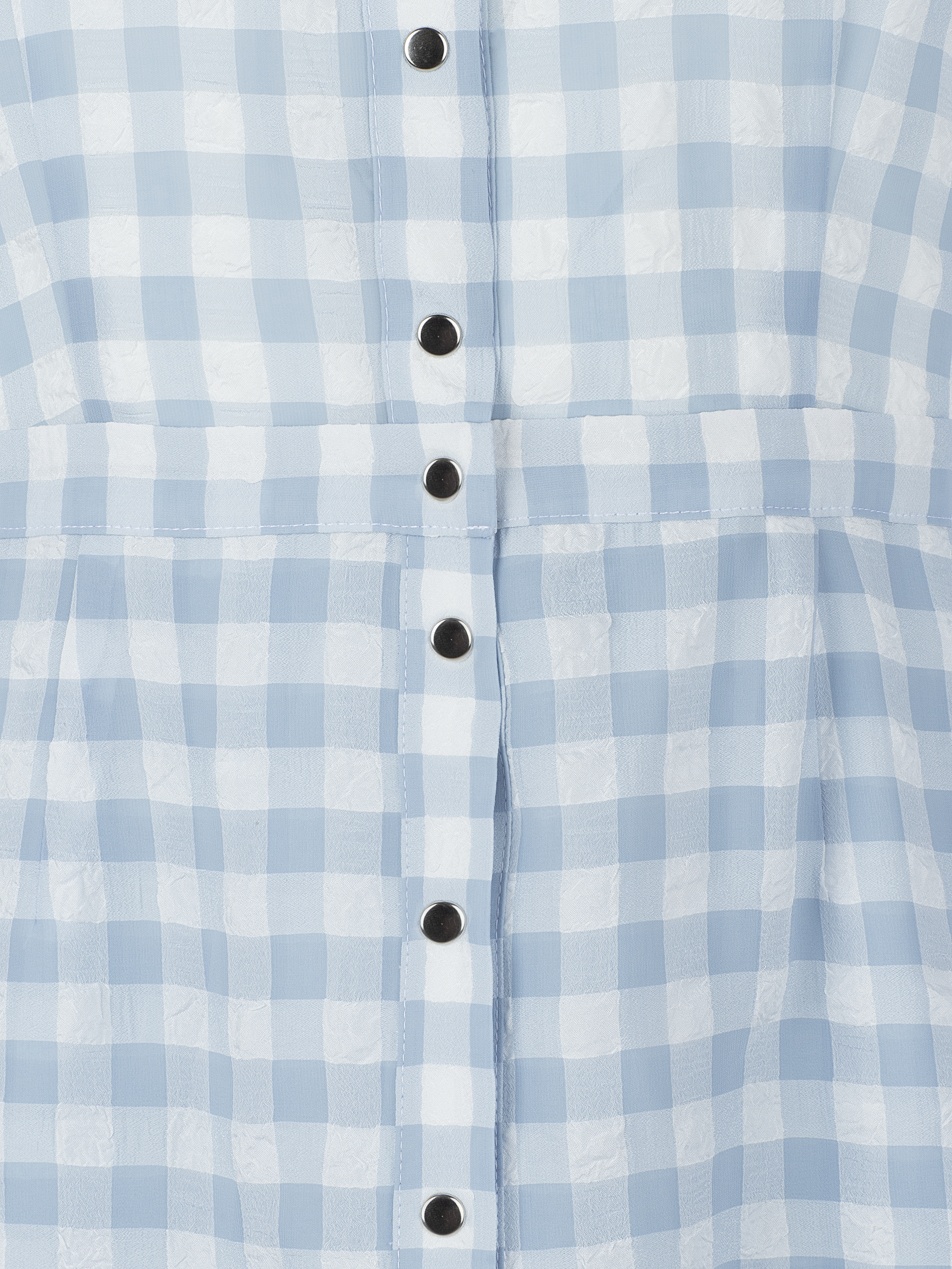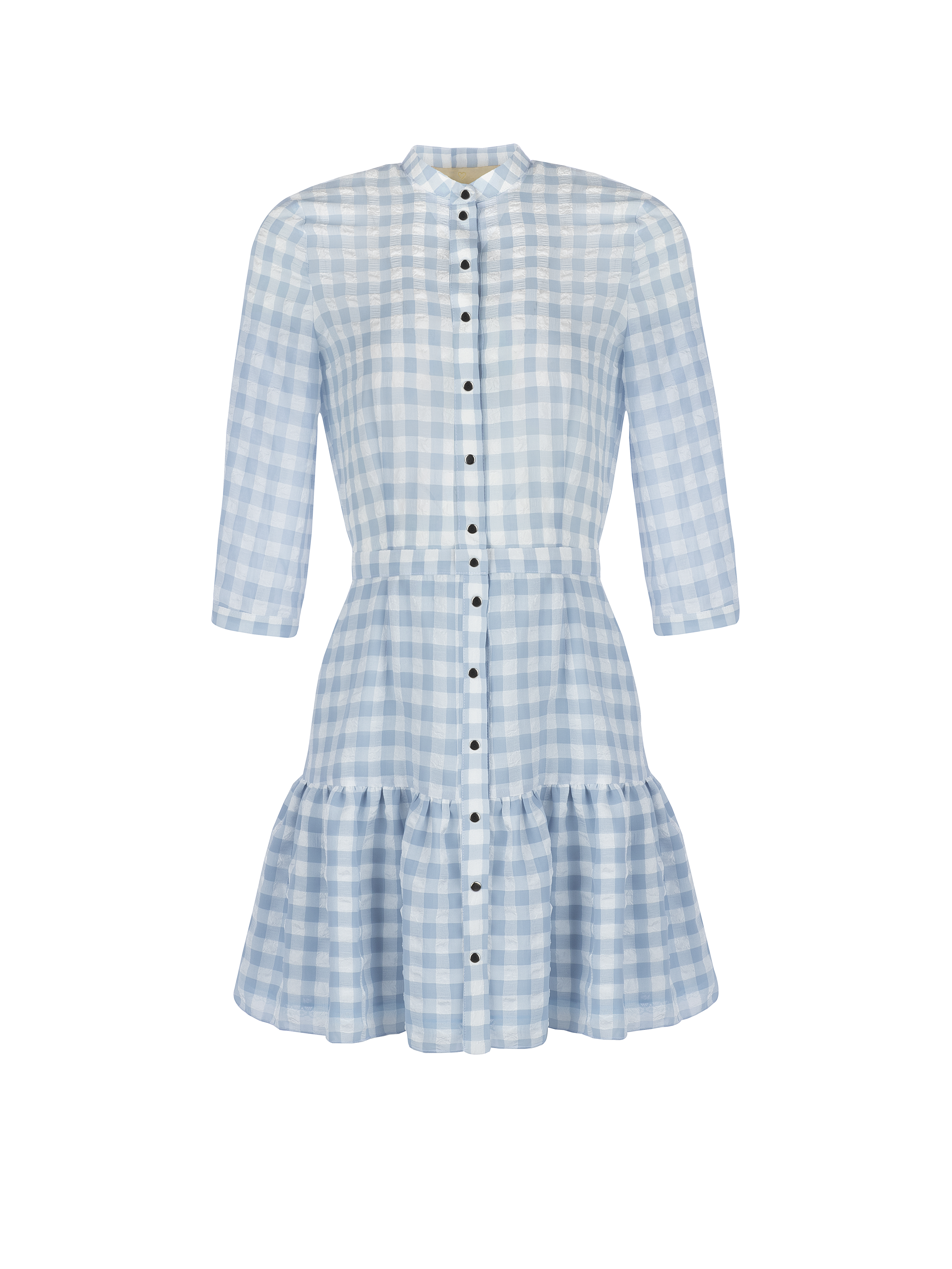 Mini dress made of lightweight white and blue checked chiffon. A stand-up collar, shortened 3/4 sleeves, a two-layer hem with one tier.