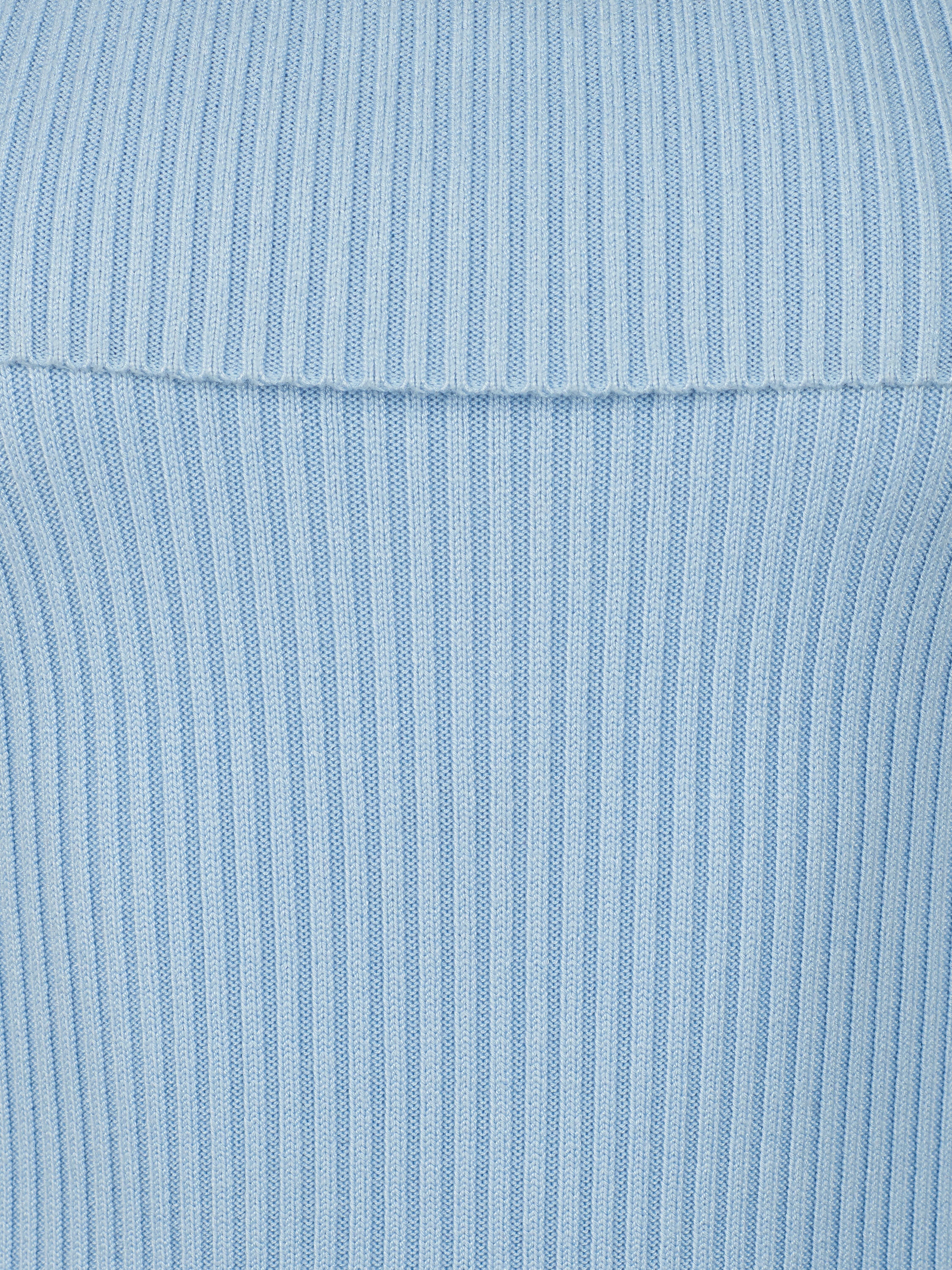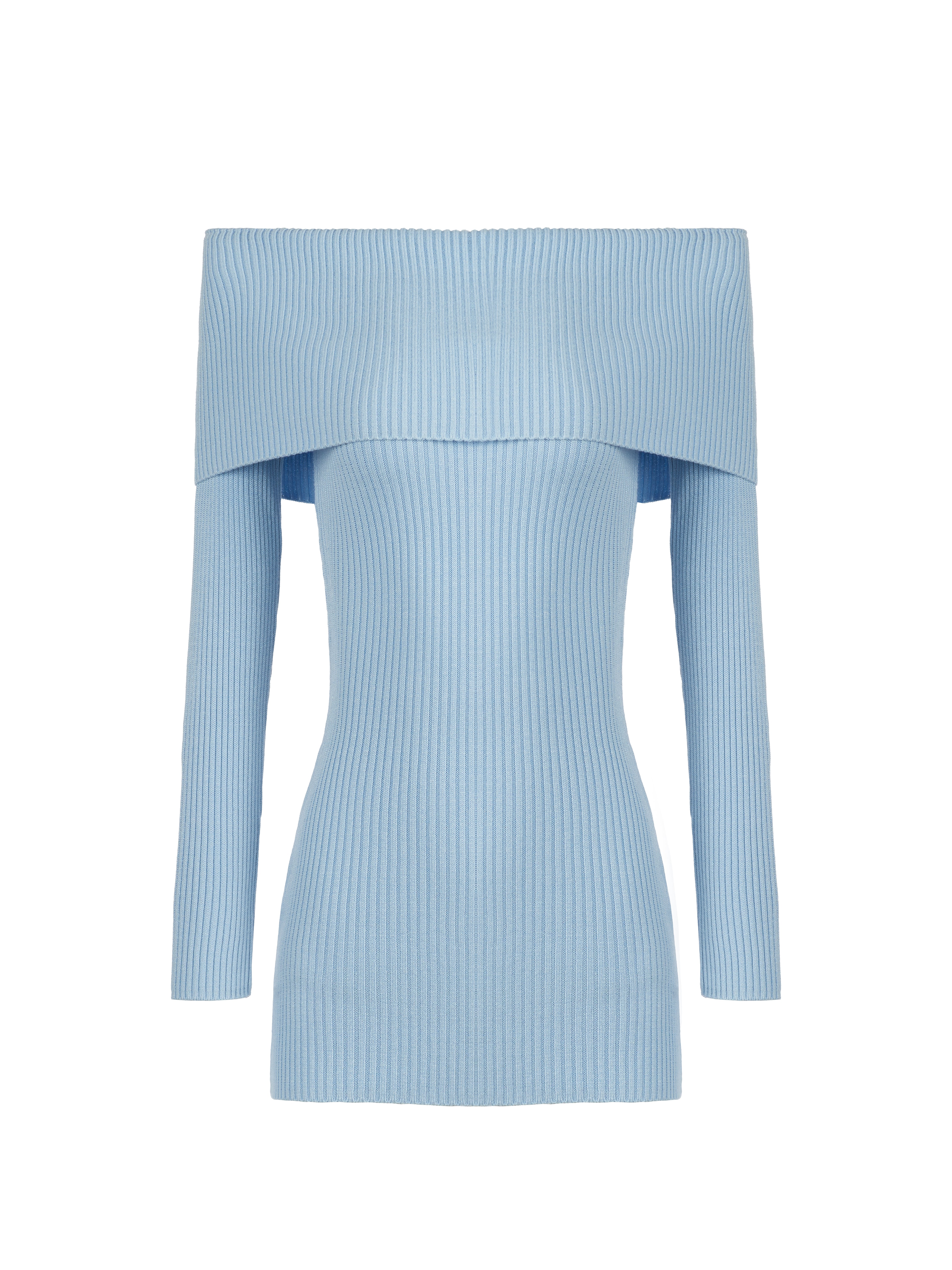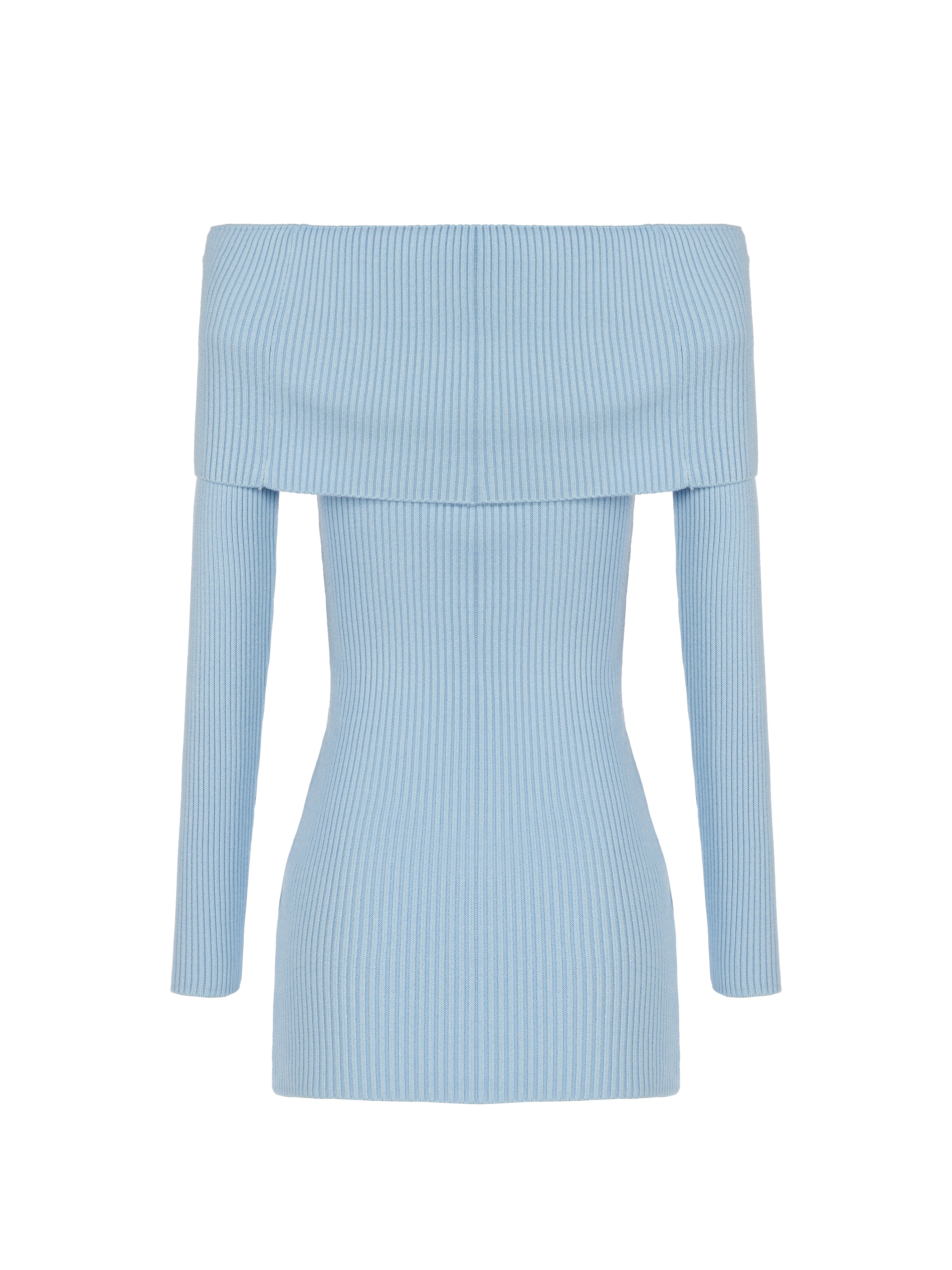 A long-sleeved mini dress is made of light blue ribbed knit. The model comfortably hugs the figure, elegantly revealing the shoulder line and collarbones.